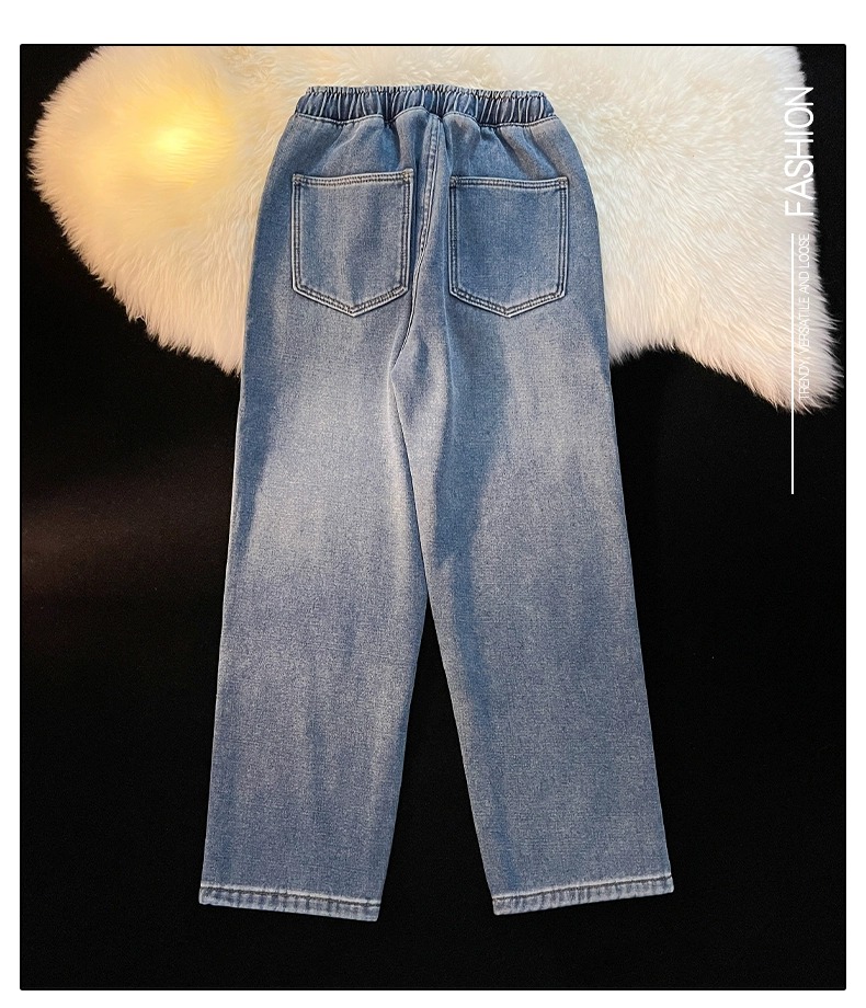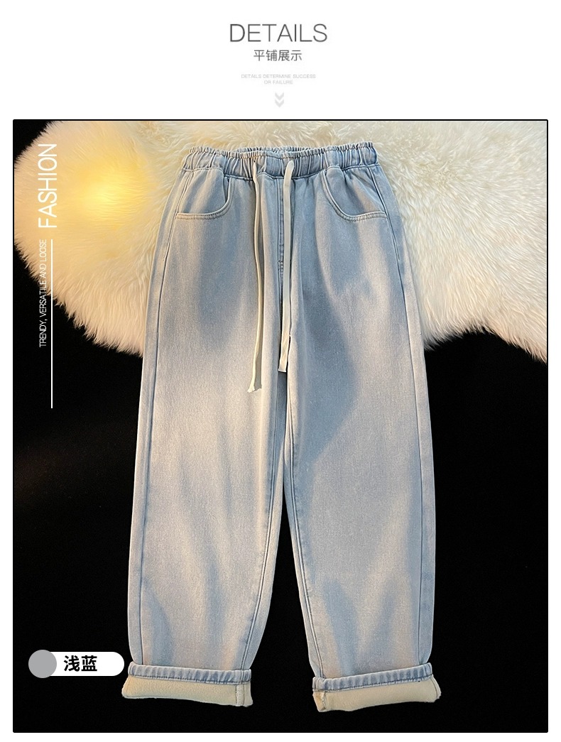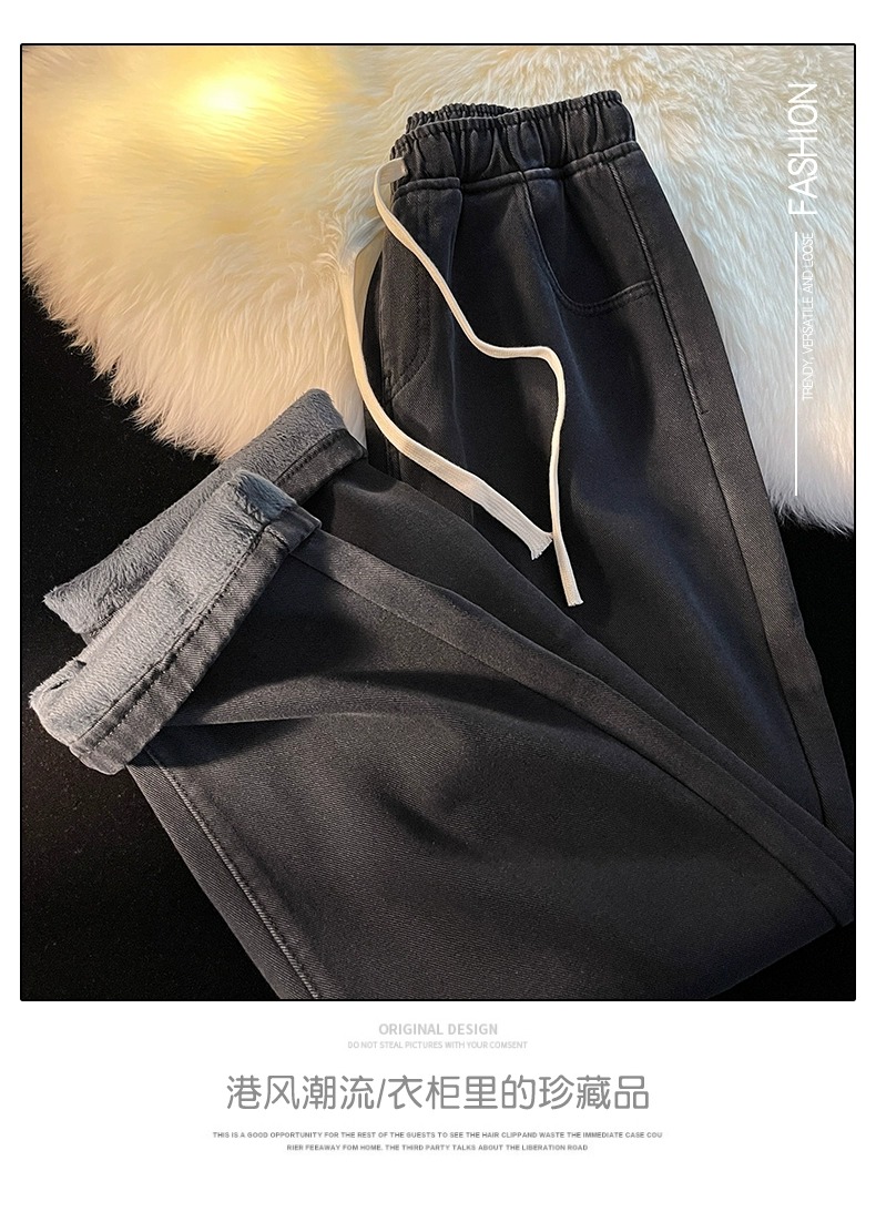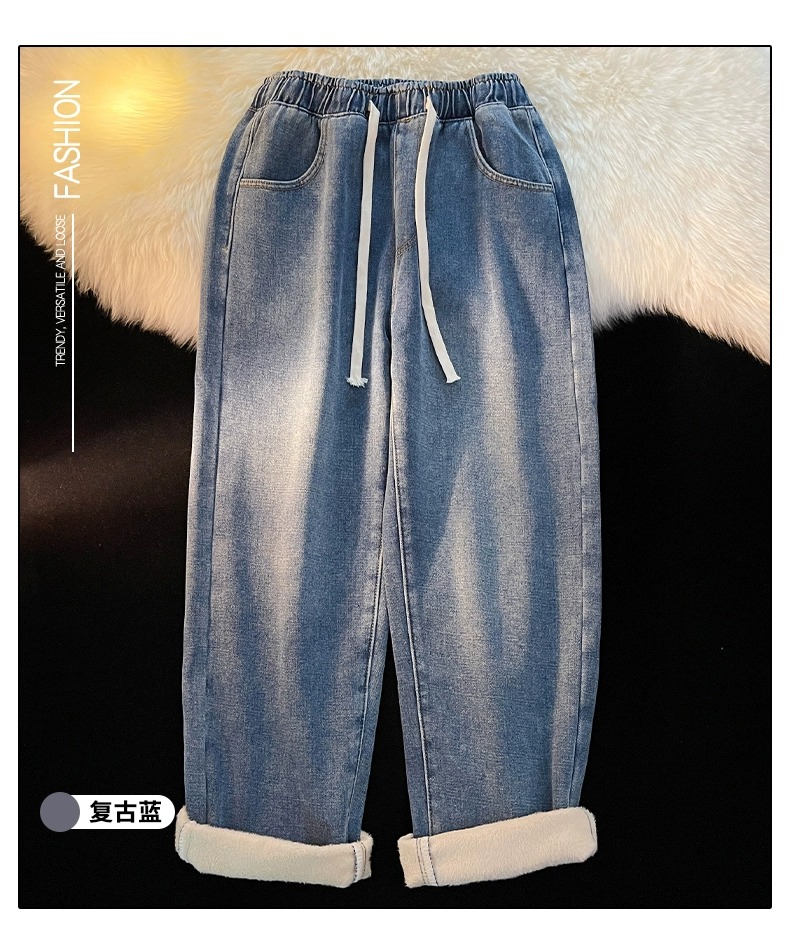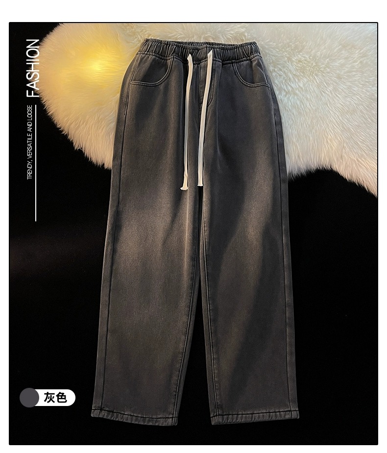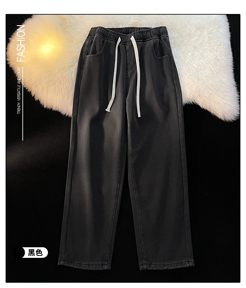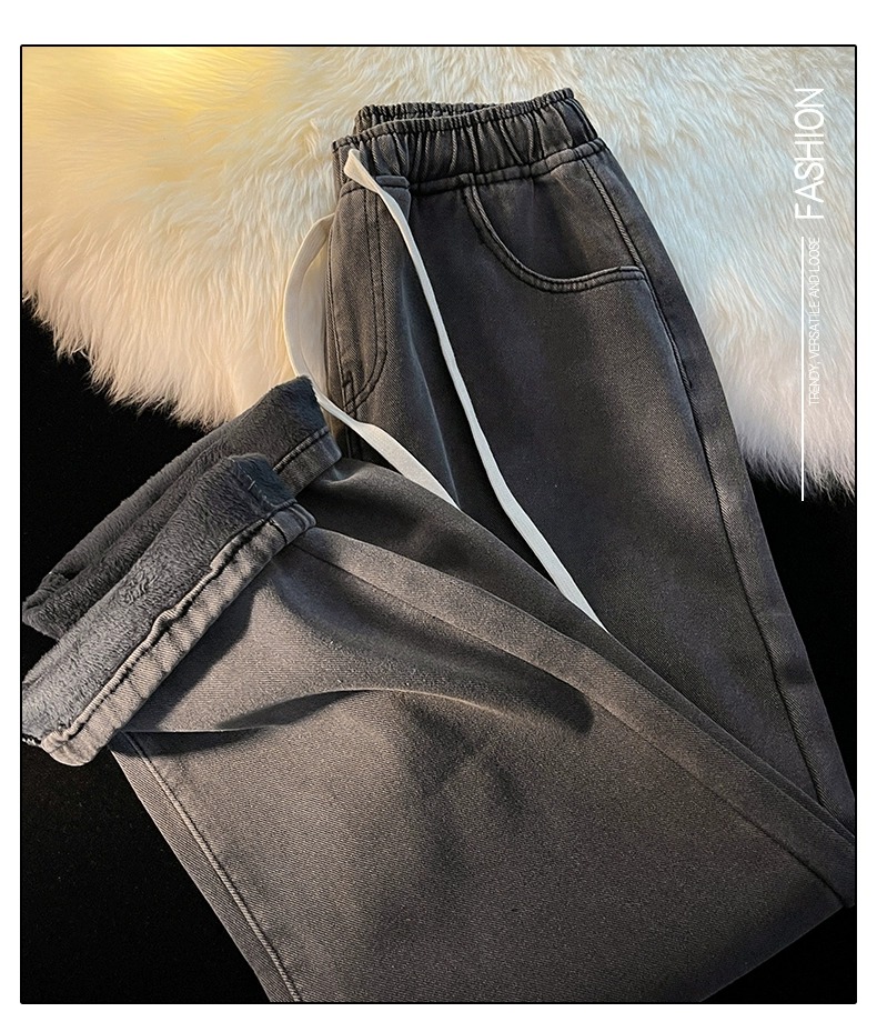 Fleece-Lined Thickened Women's Jeans for Autumn and Winter, New Elastic Waist Drawstring Loose Vintage Warm Straight-Leg Wide-Leg Pants