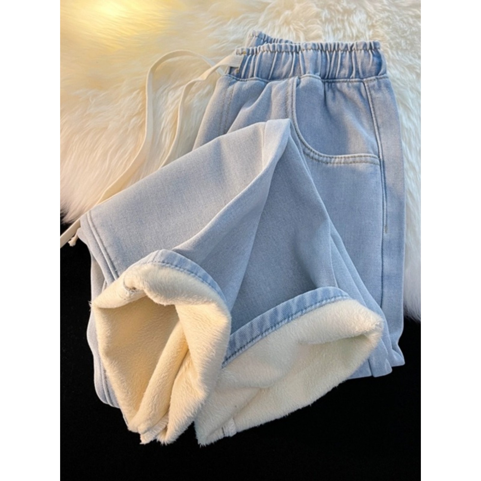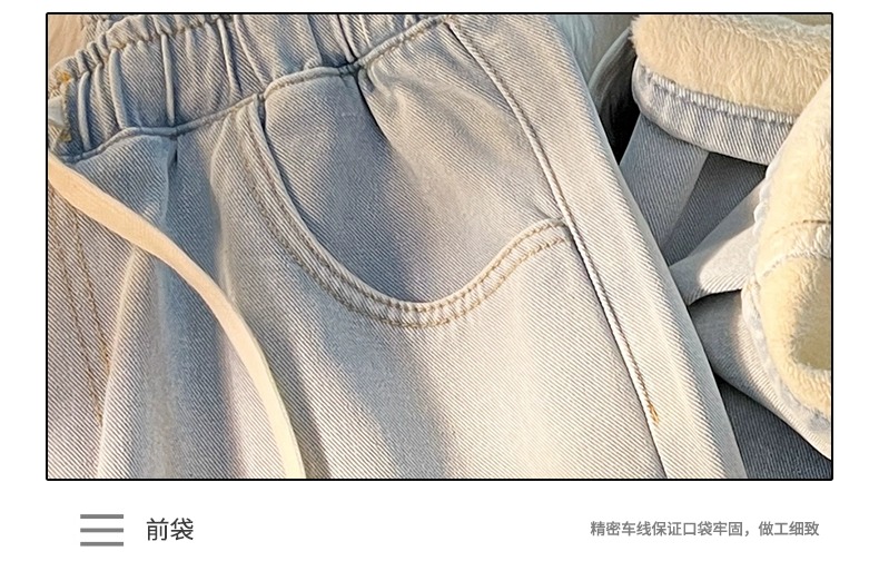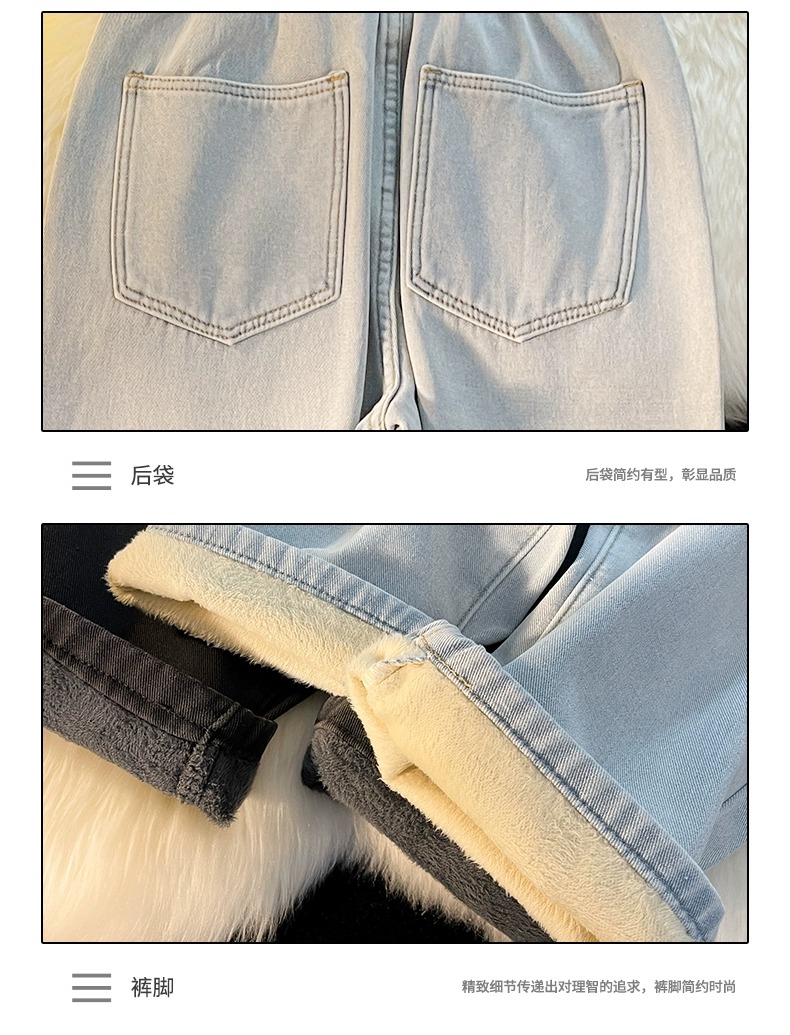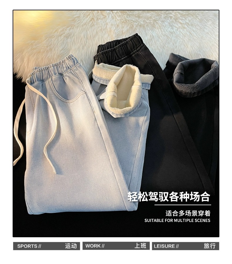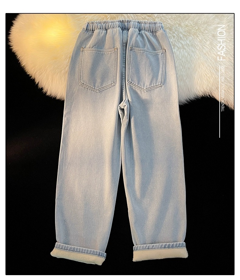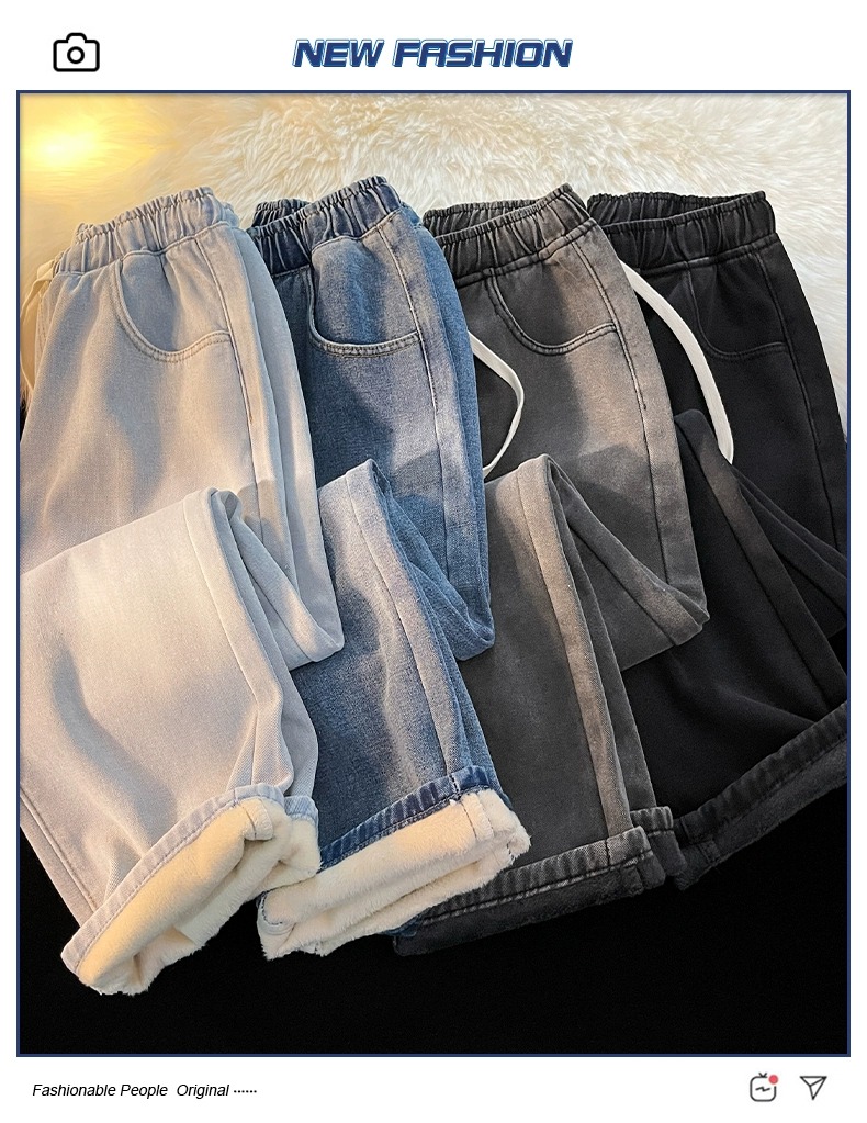 Fleece-Lined Thickened Women's Jeans for Autumn and Winter, New Elastic Waist Drawstring Loose Vintage Warm Straight-Leg Wide-Leg Pants