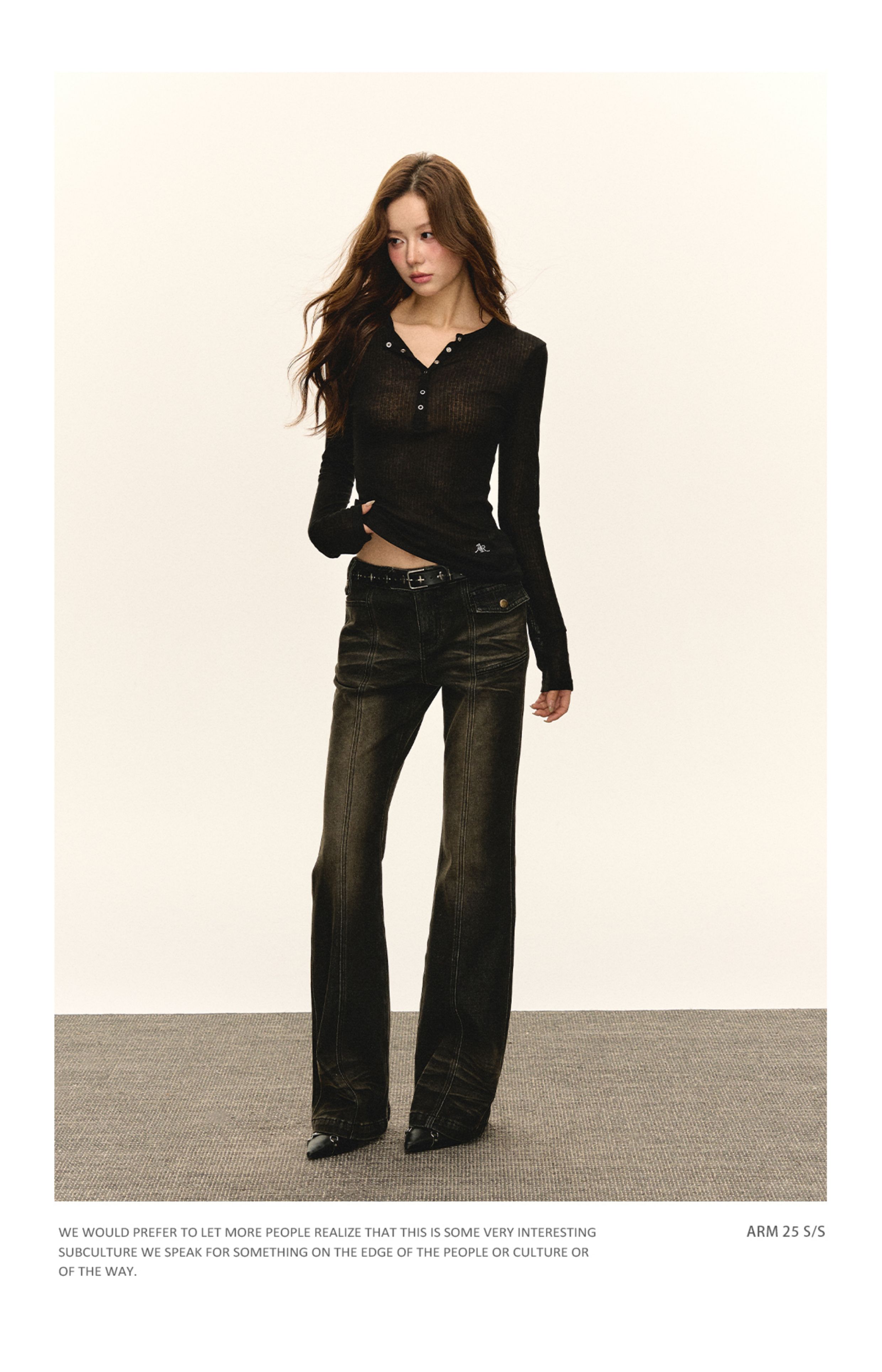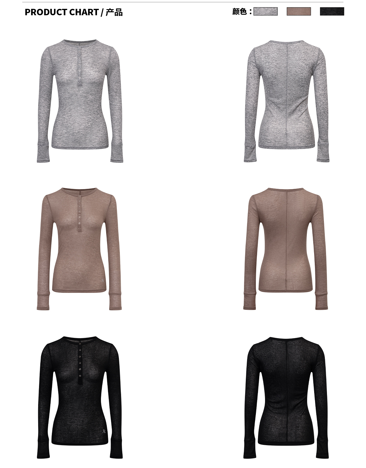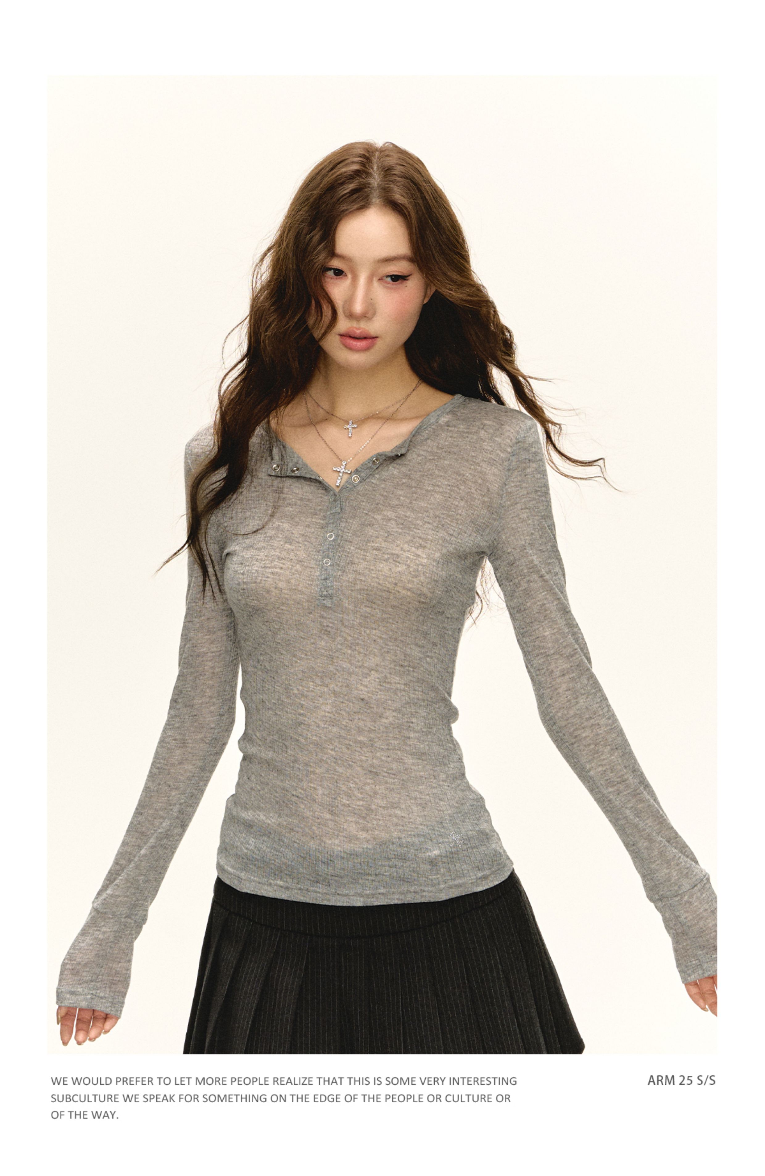 Ariseism American Retro Design Henry Collar Slightly See-Through Long-Sleeved T-Shirt for Women Autum New Slim Fit Top