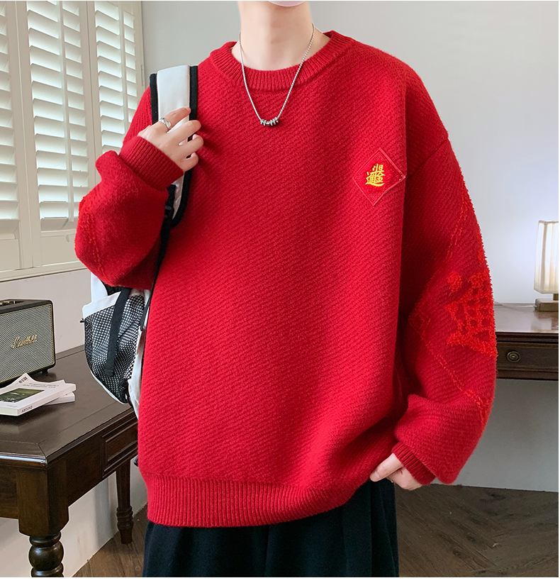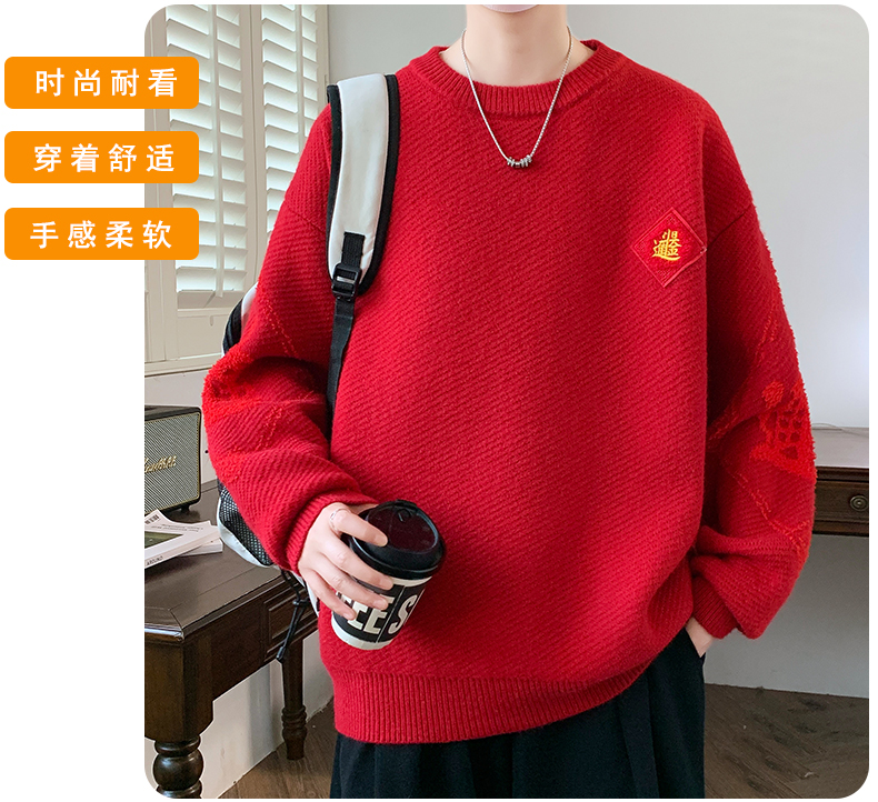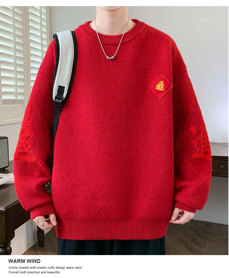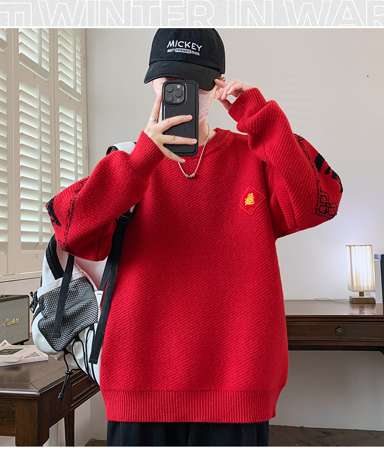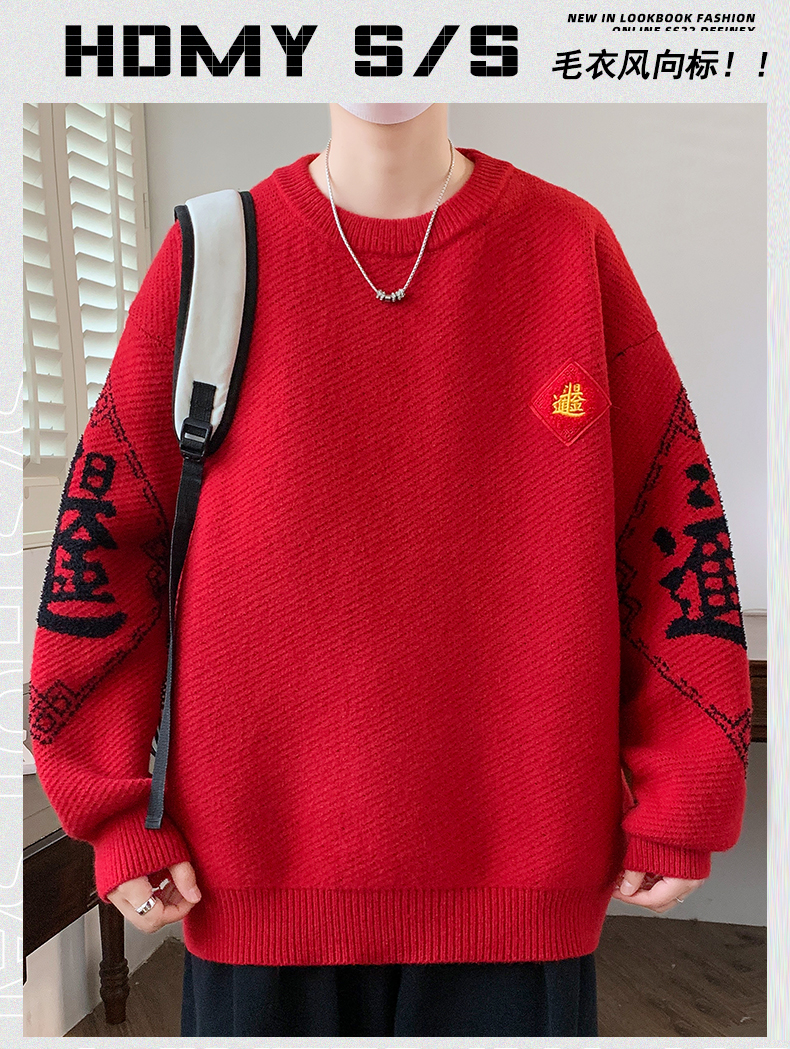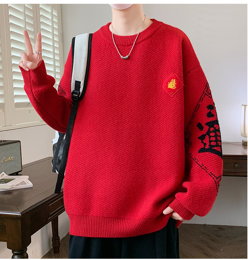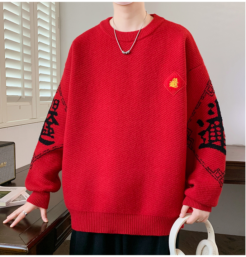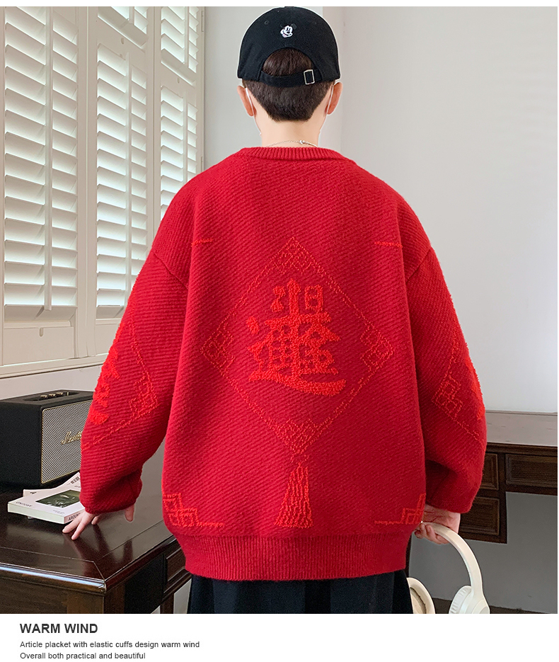 New Year's Red Sweater for Men, Autumn and Winter, Youth New Year's Greeting Outfit, Thick Knitted Sweater for Middle and High School Students