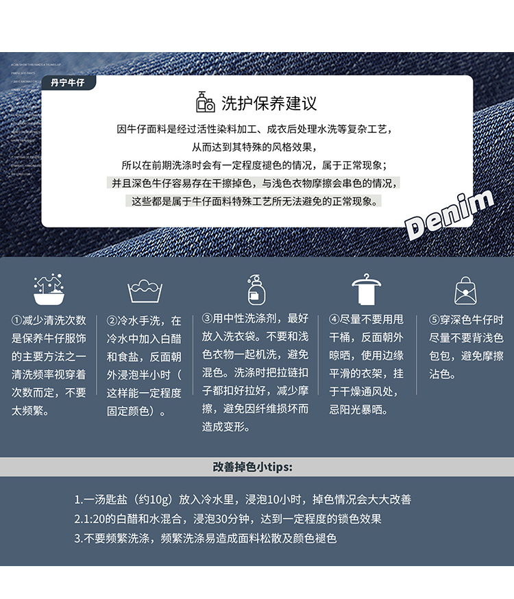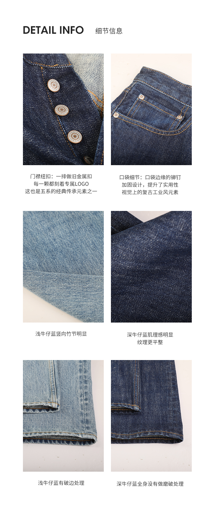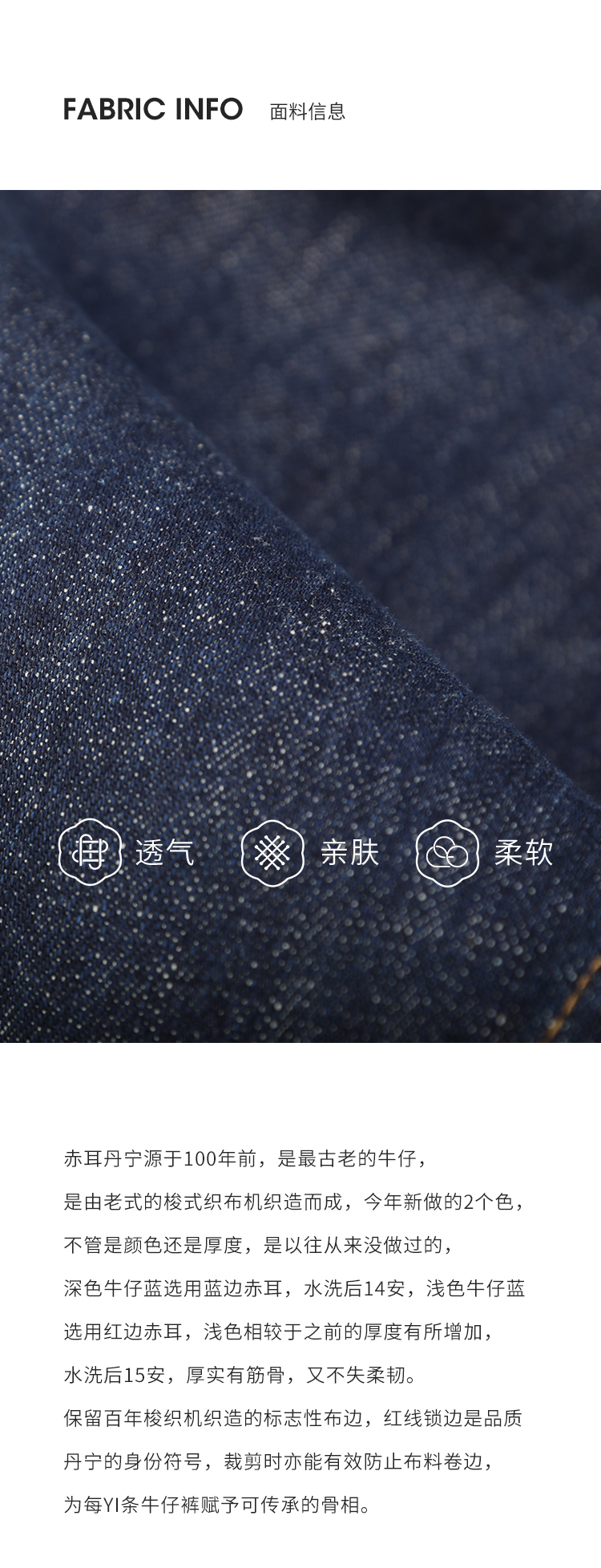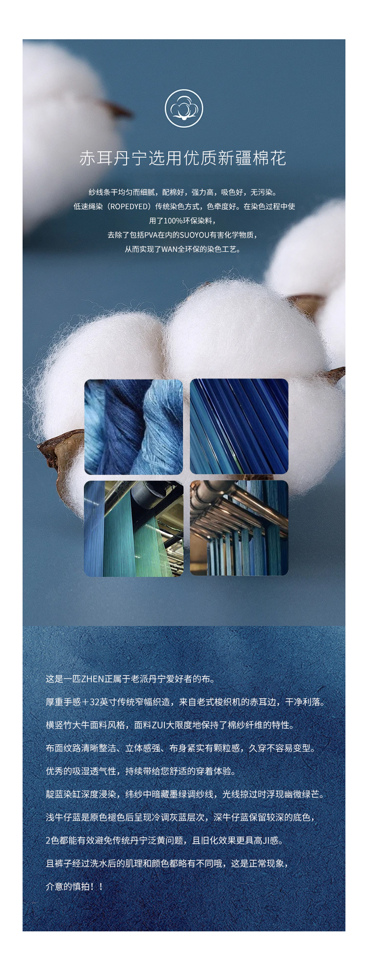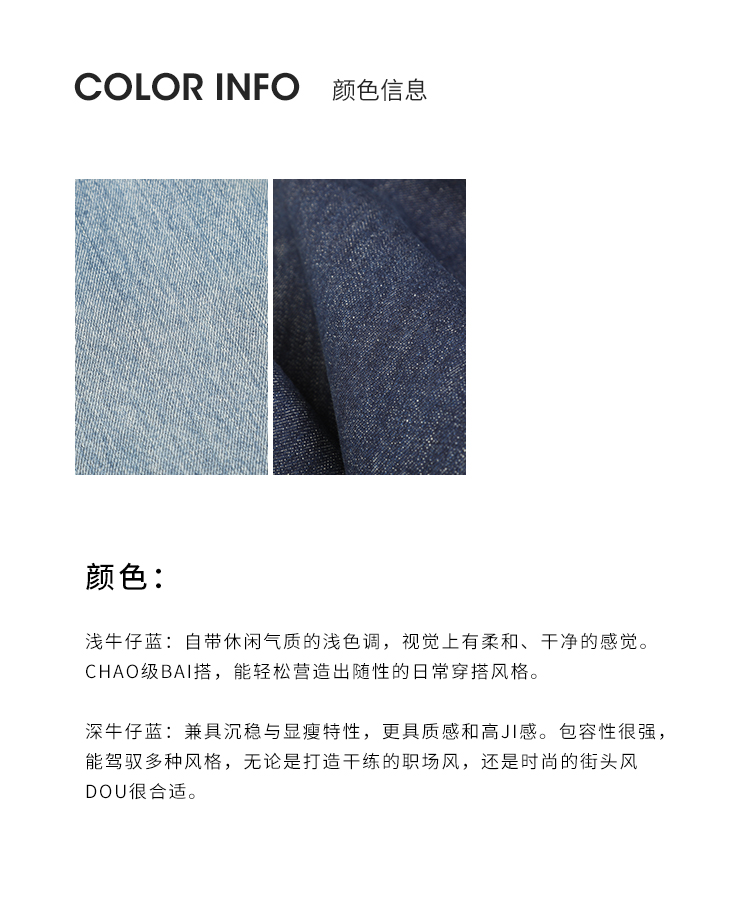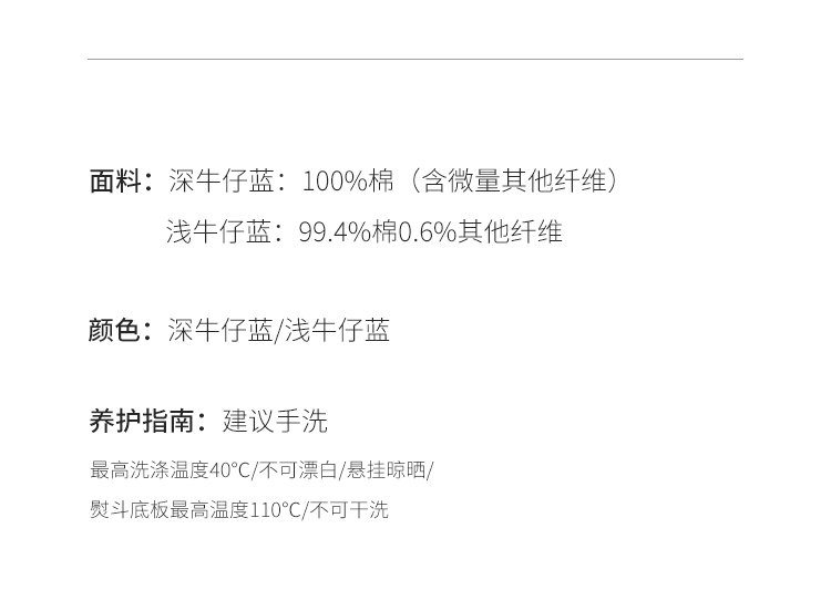 深牛仔蓝面料:100%棉(含微量其他纤维)浅牛仔蓝面料:99.4%棉0.6%其他纤维属性:弹性/无弹 软度/适中 厚度/厚 长度/长款 版型/宽松