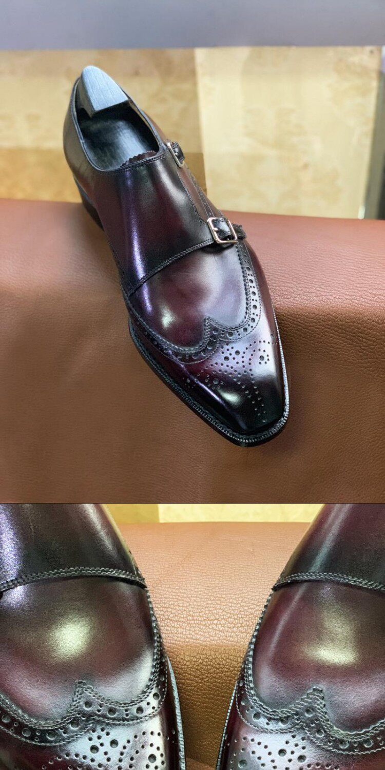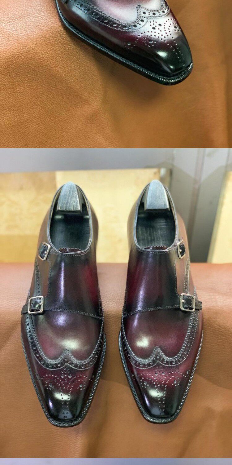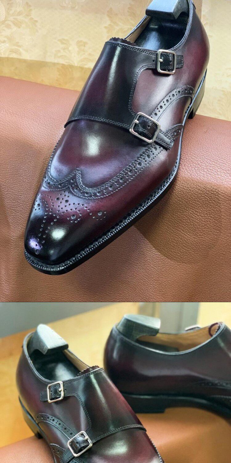 Goodyear Handmade Men's Shoes, Monk Style with Double Buckles, Brogue Carved, Burgundy Gradient, Imported Cowhide Genuine Leather Sole