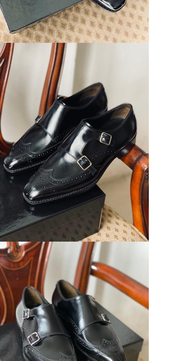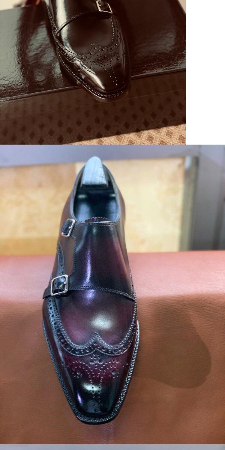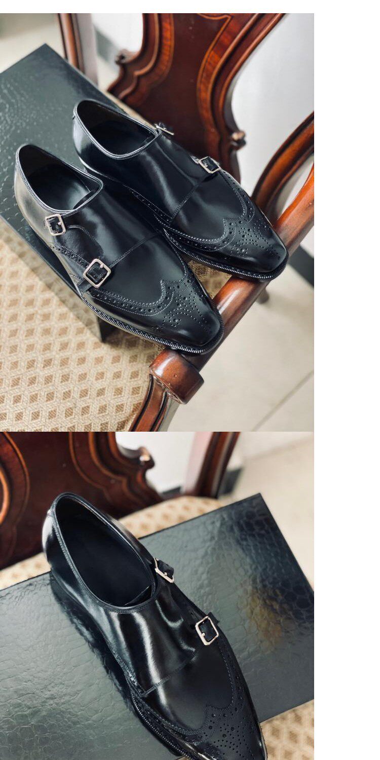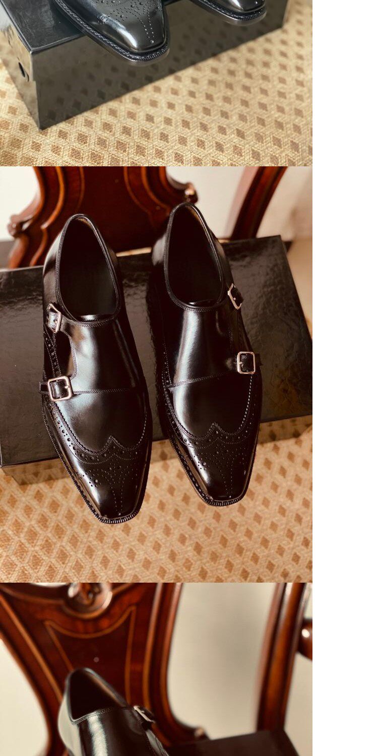 Goodyear Handmade Men's Shoes, Monk Style with Double Buckles, Brogue Carved, Burgundy Gradient, Imported Cowhide Genuine Leather Sole