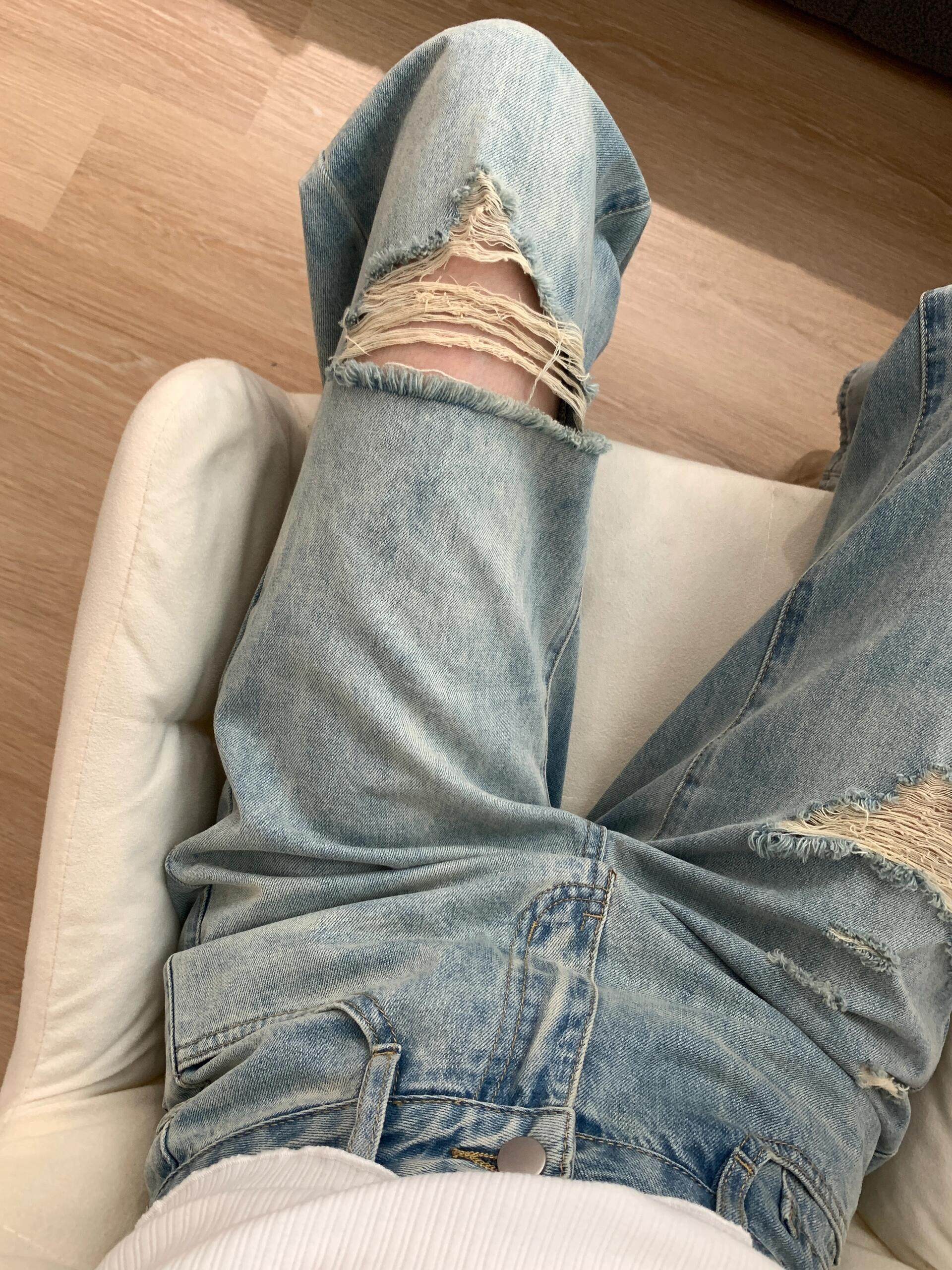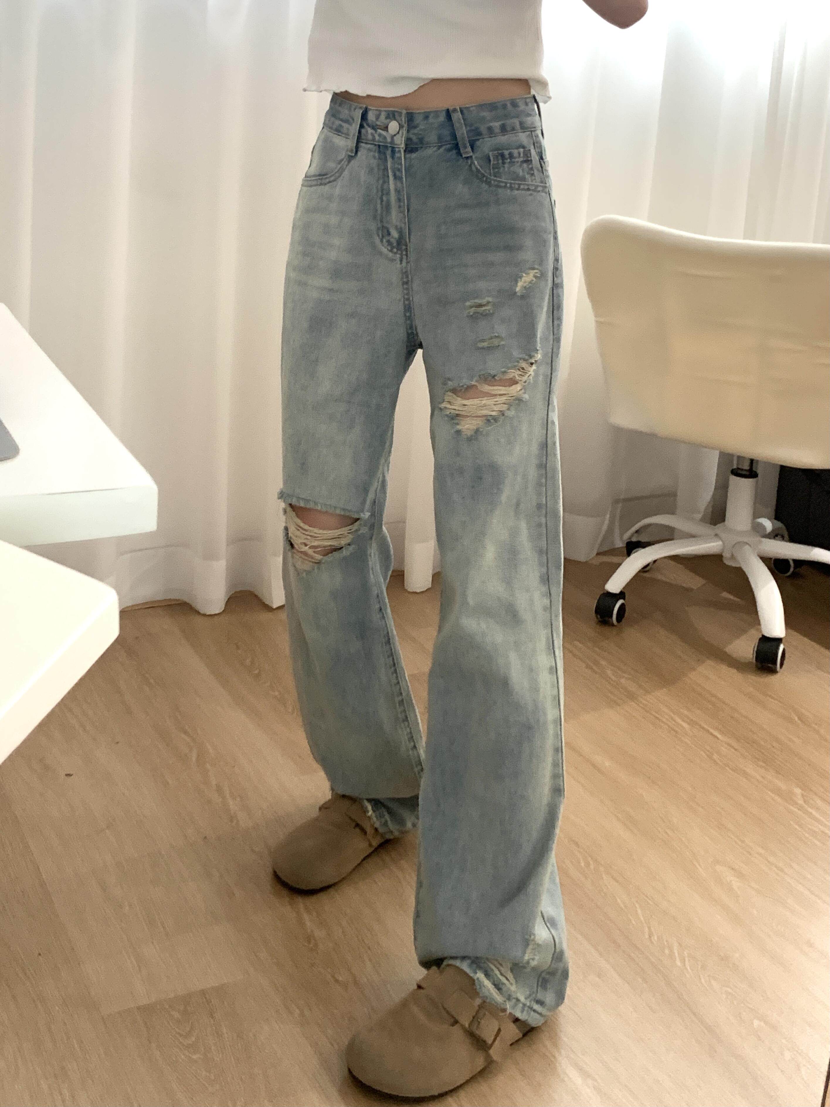 Light Blue Loose Straight Ripped Jeans for Women, New Autumn Style, American Retro High-Waisted Slim-Fit Narrow Version Distressed Jeans