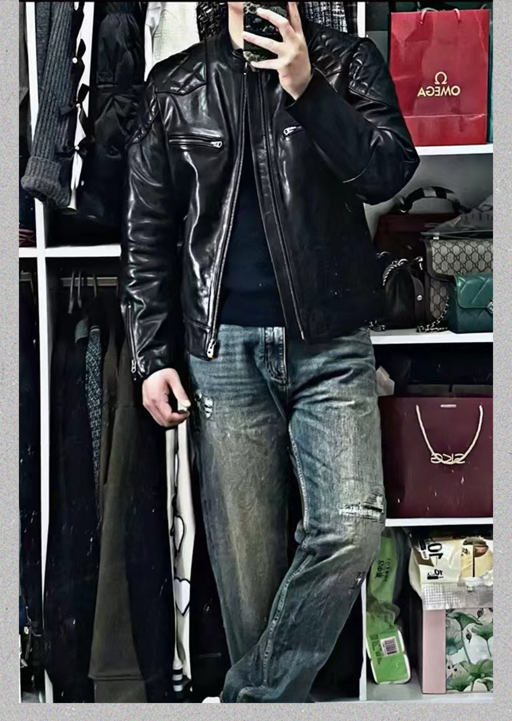 1.4mm Uncoated Vegetable-Tanned Calfskin Leather Jacket, Same Style as Beckham, Washed Vintage Genuine Leather Men's Leather Jacket
