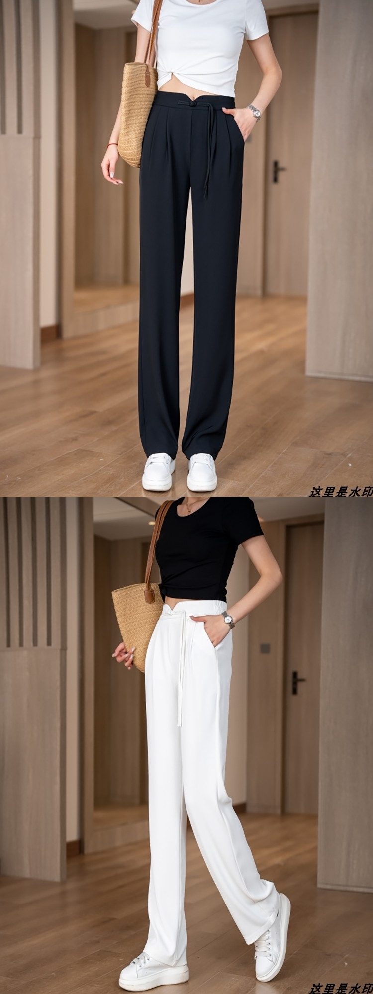 2025 Spring/Summer New High-Waisted Slimming Narrow Wide-Leg Pants Casual Versatile Breathable Ice Silk Draped Straight-Leg Trousers for Women