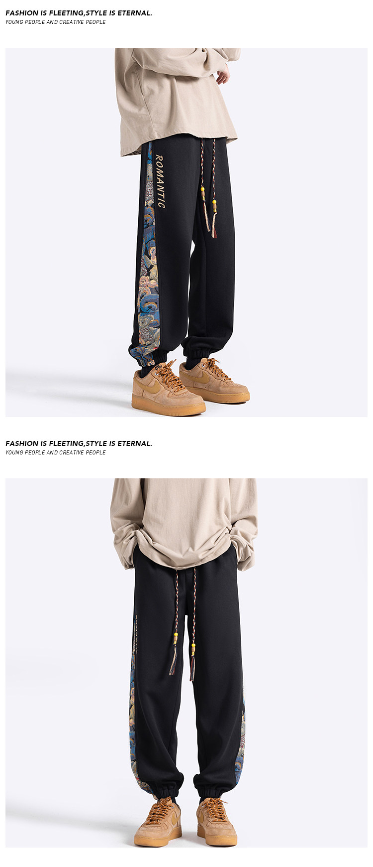 Wassup Trendy Embroidered Chinese Style Pants for Men, Autumn and Winter Loose Jogger Pants, Casual Pants with Fleece, Nine-Point Sweatpants