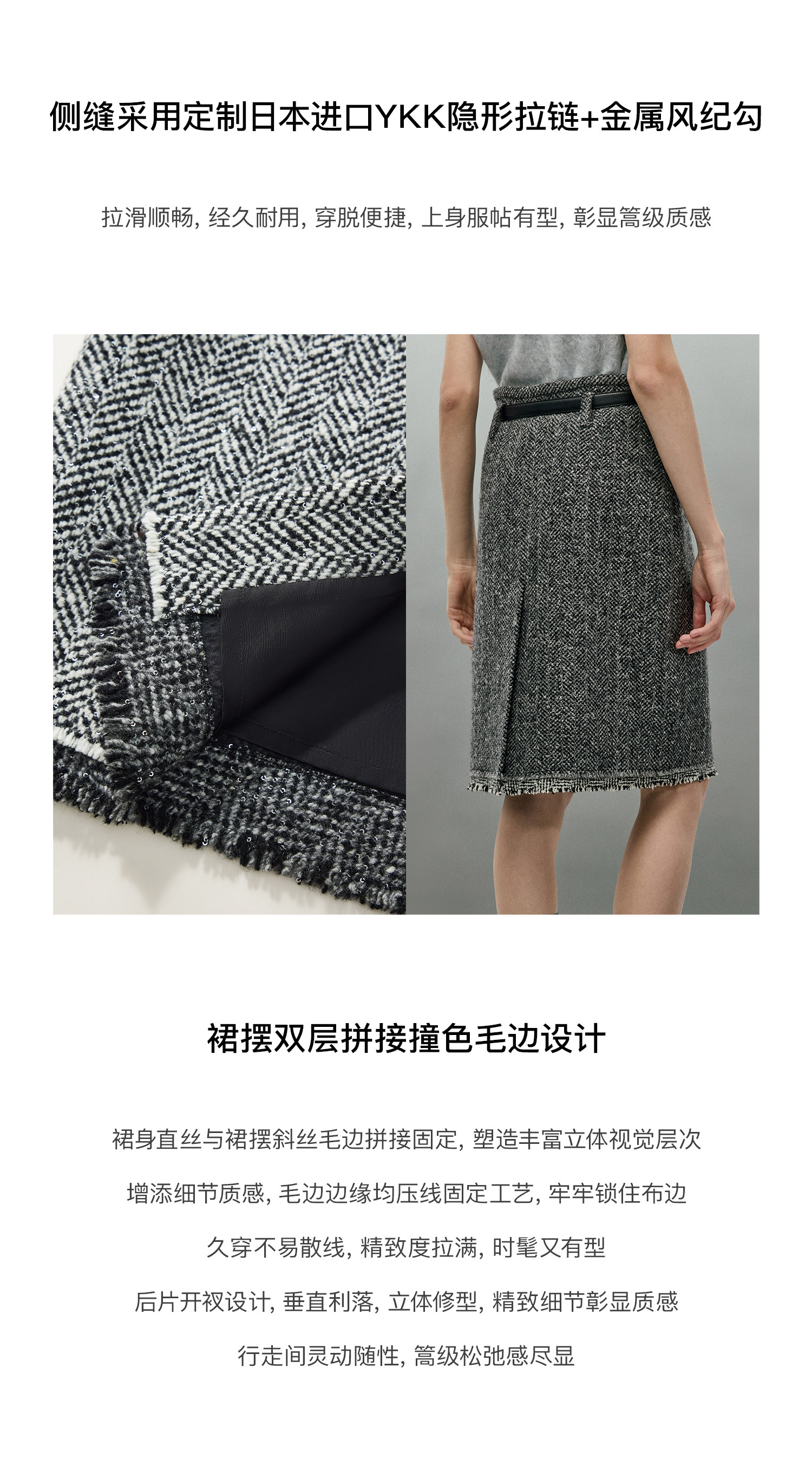 Chandooivy Italian Imported Moessmer Sequin Herringbone Tweed Double-Layered Raw Edge Back Slit Skirt