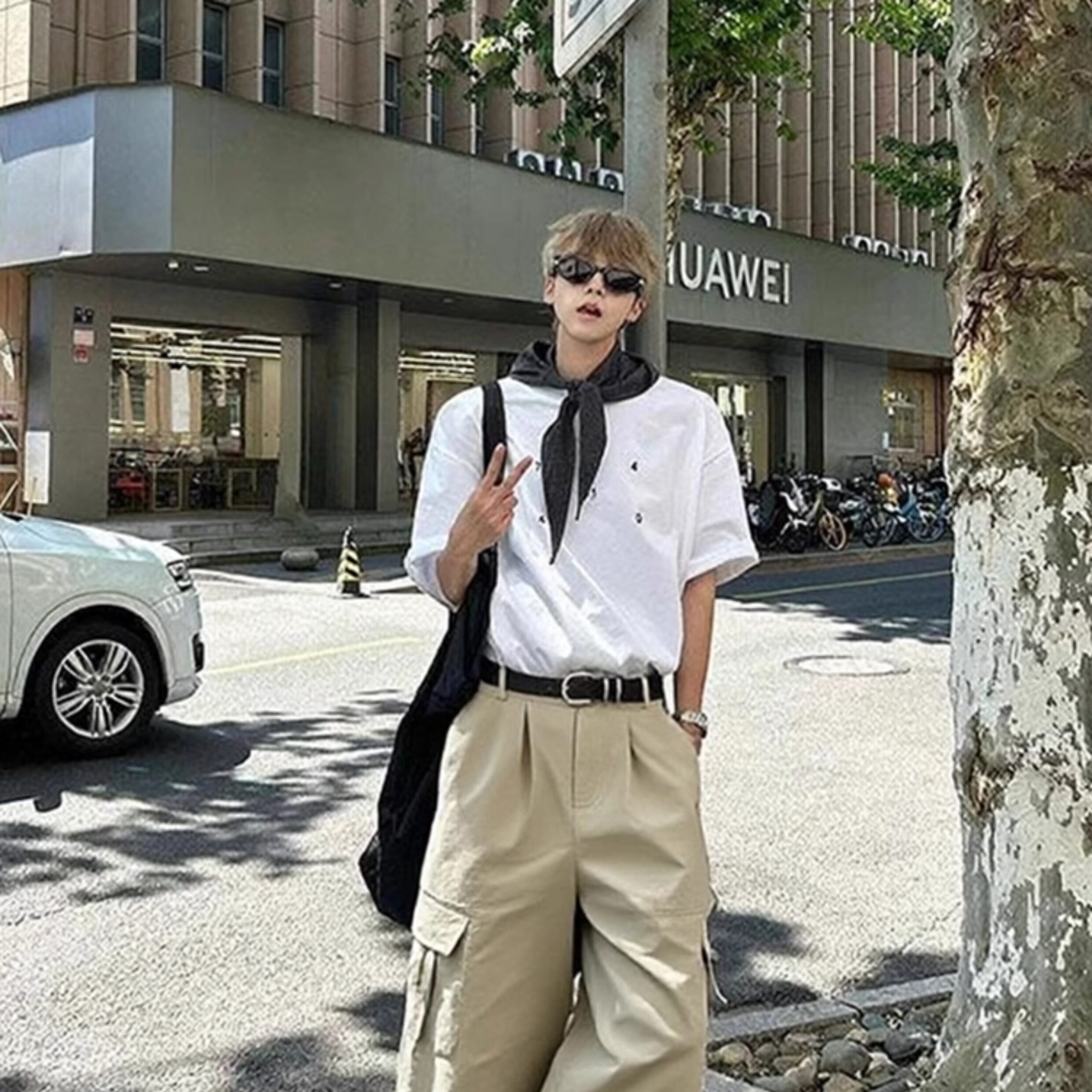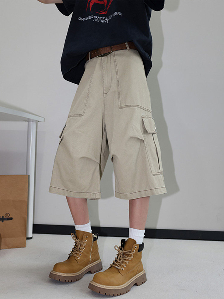 American Retro Large Pocket Cargo Shorts for Men, Summer Design Lumberjack Pants, Loose Wide-Leg Knee-Length Cropped Pants