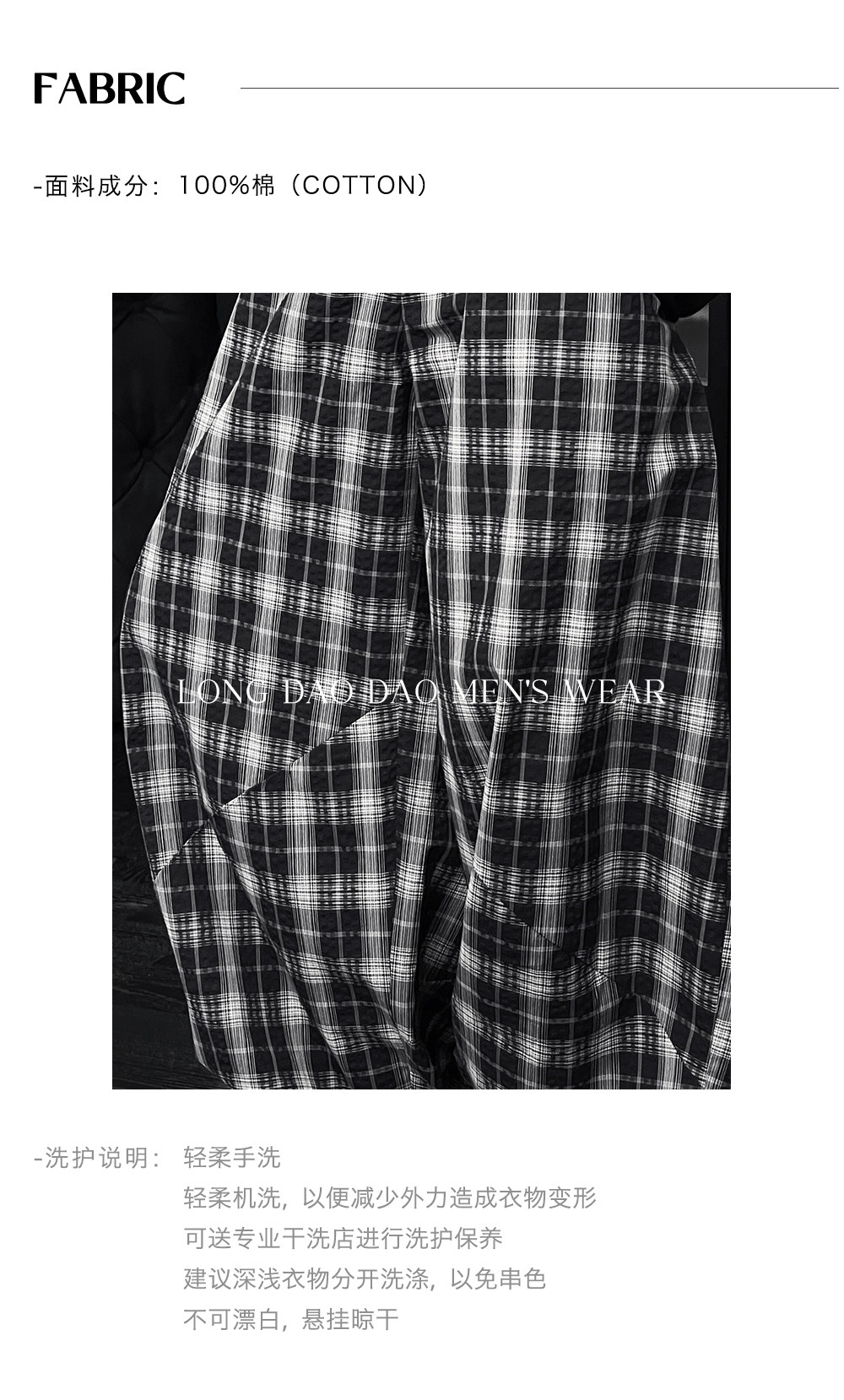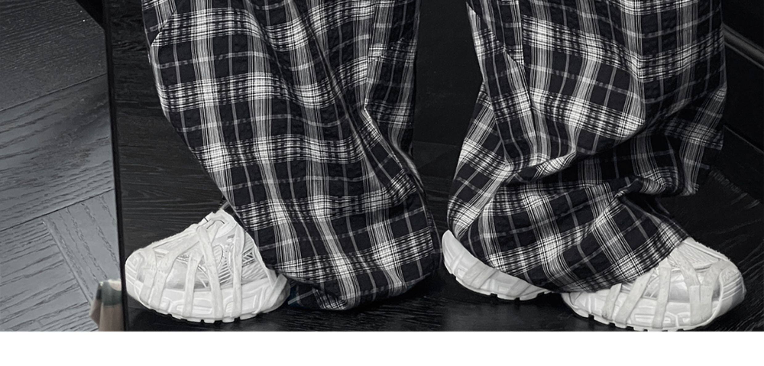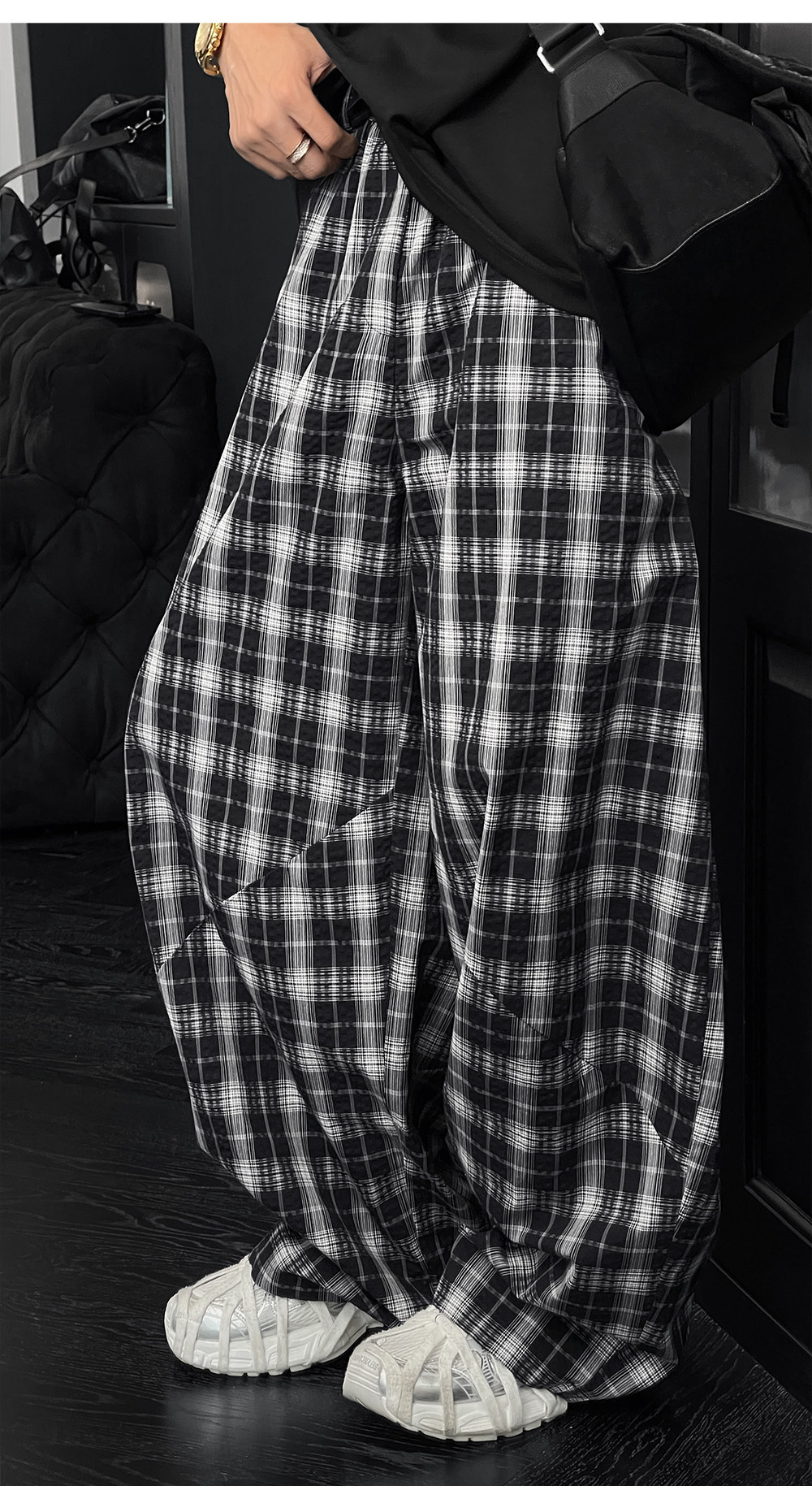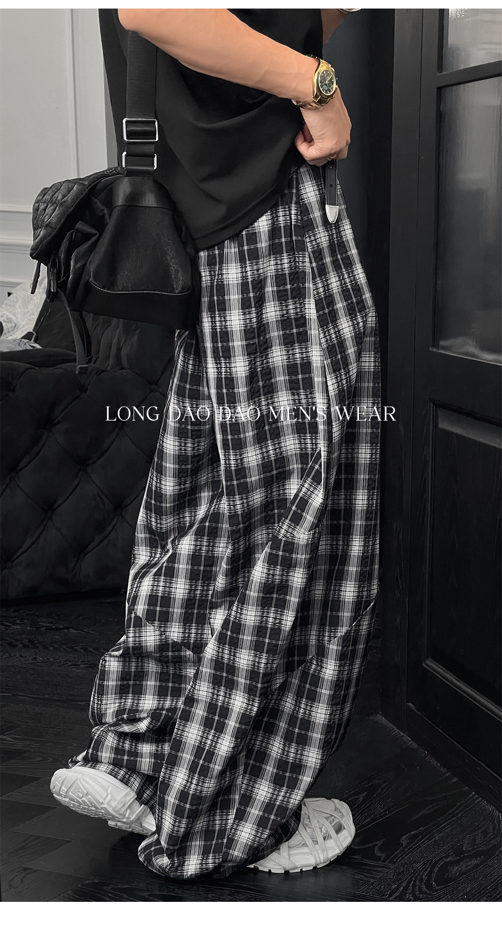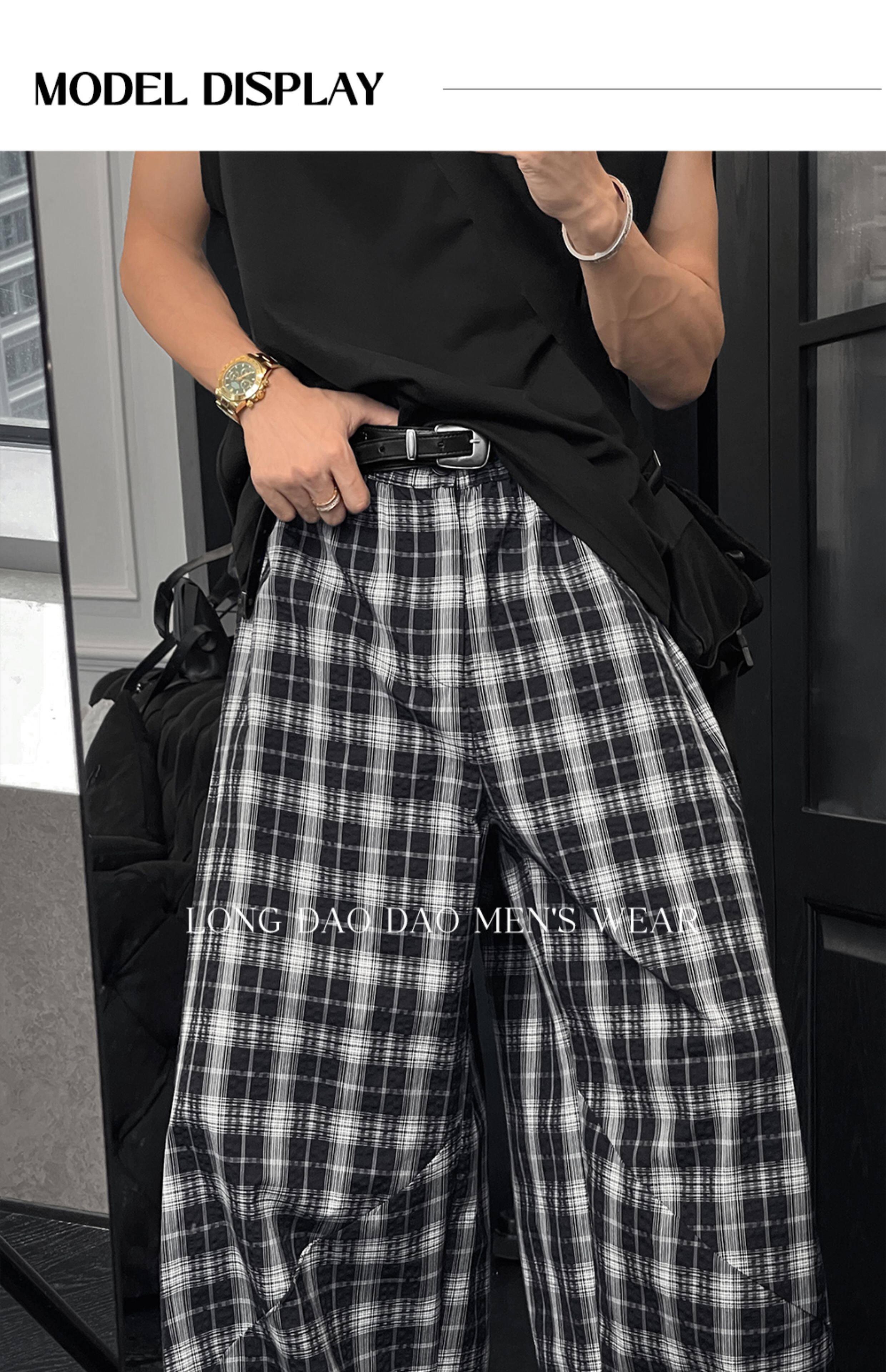Longdao Summer Thin High-End Wide-Leg Black and White Checkered Casual Pants for Men, Loose and Versatile, Comfortable Scimitar Pants