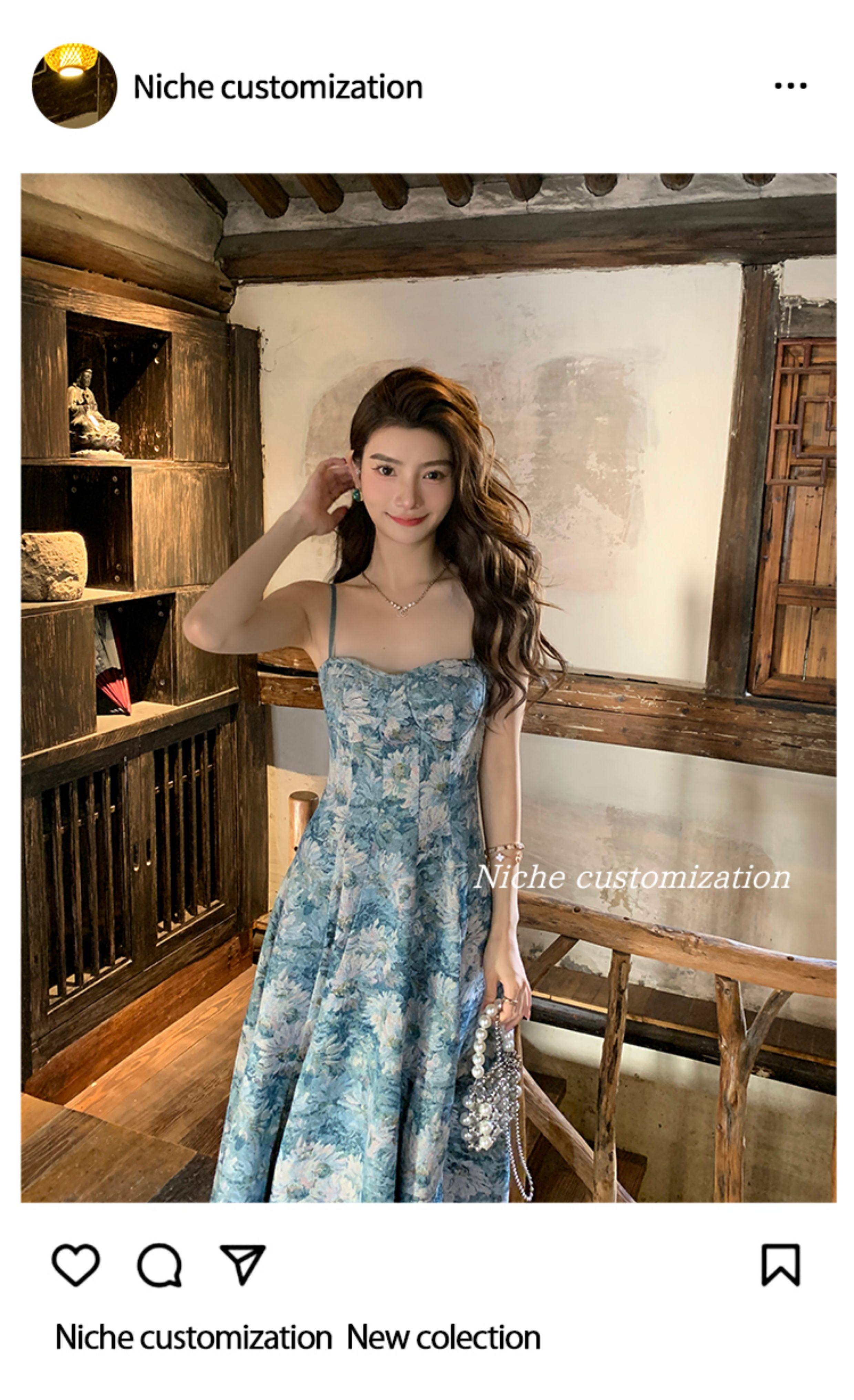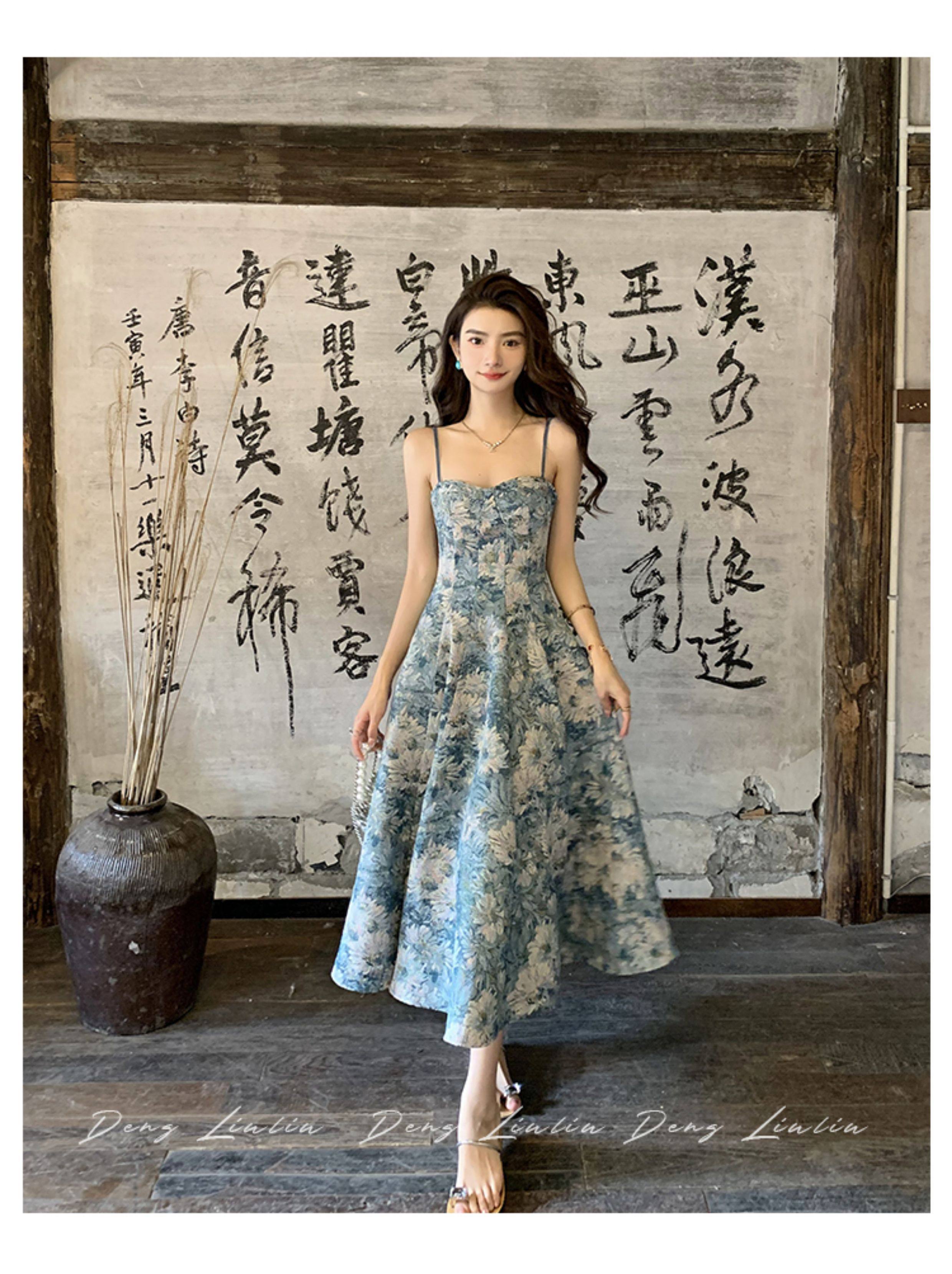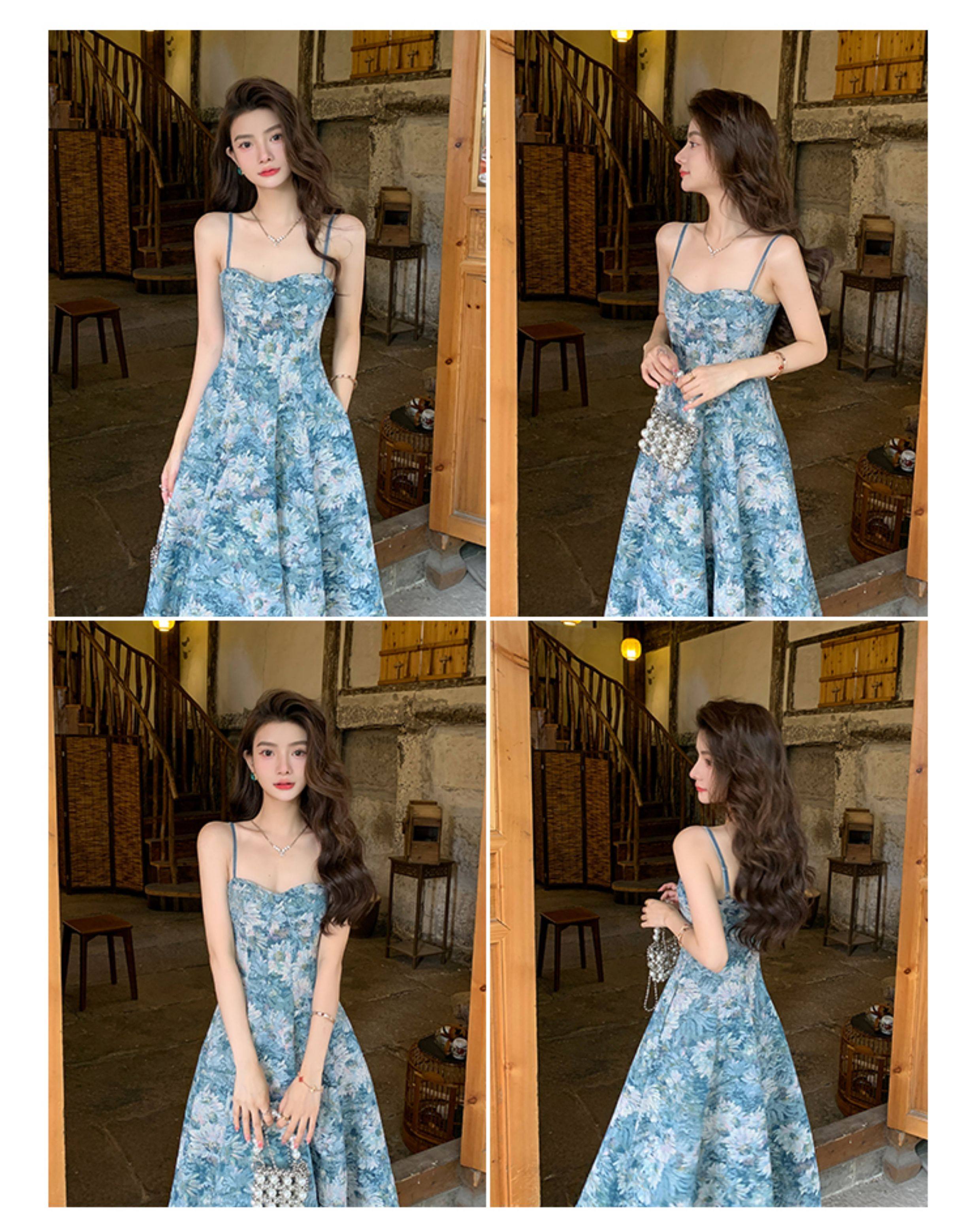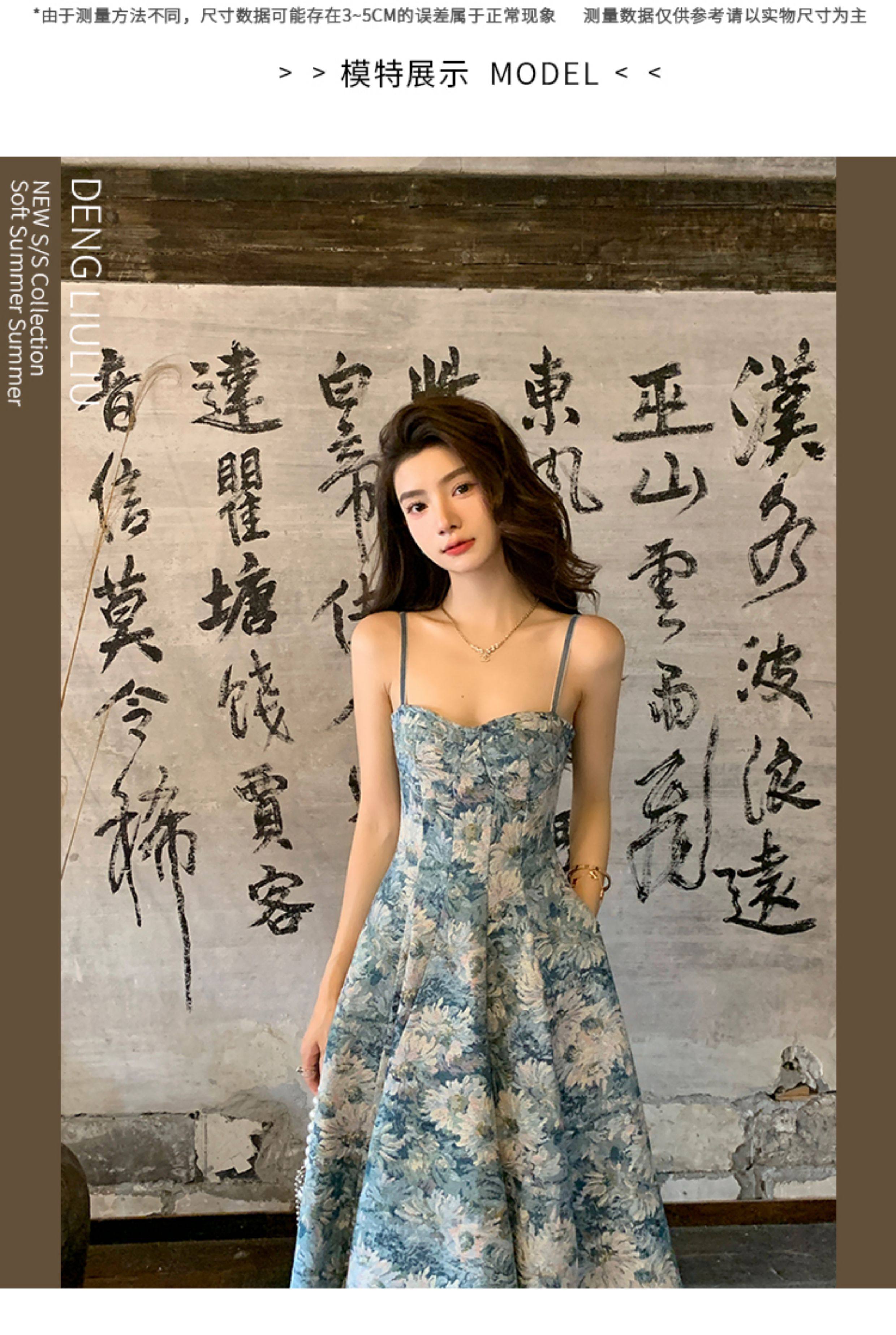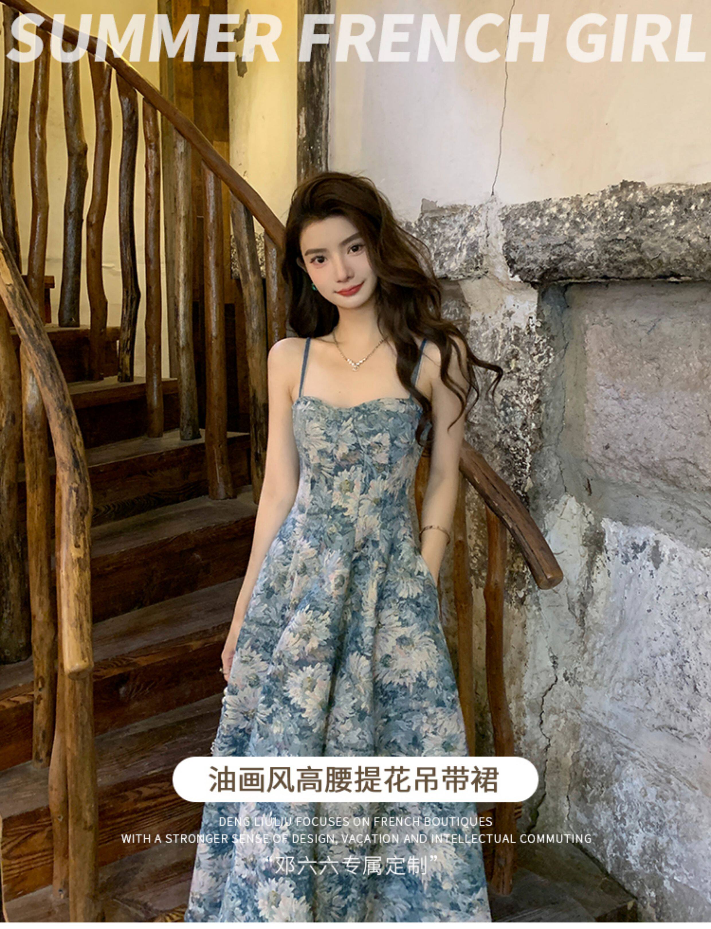 Deng Liuli French Retro Oil Painting Floral Spaghetti Strap Dress Blue Dress Women's Summer Beach Dress Seaside Vacation Long Dress