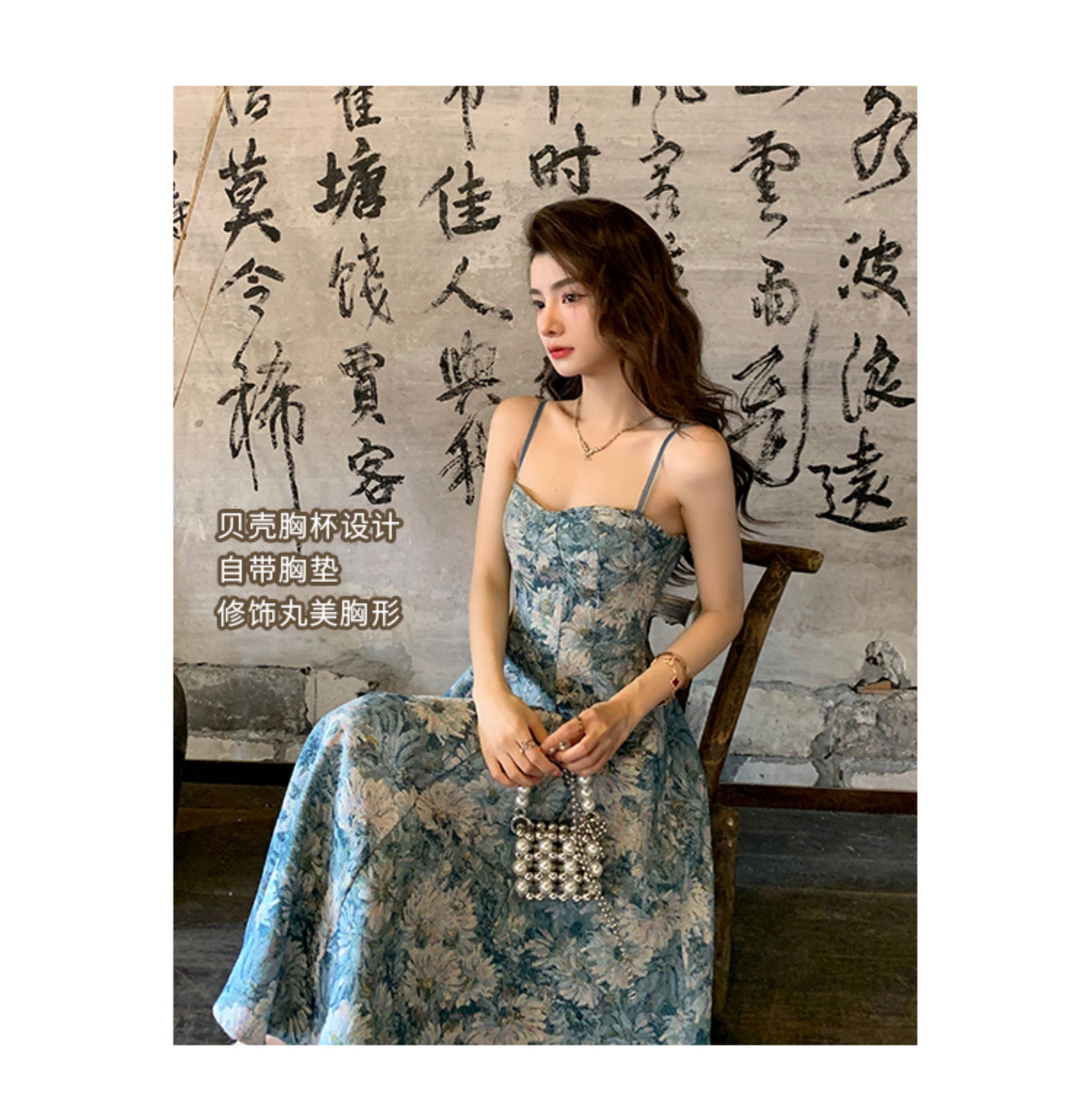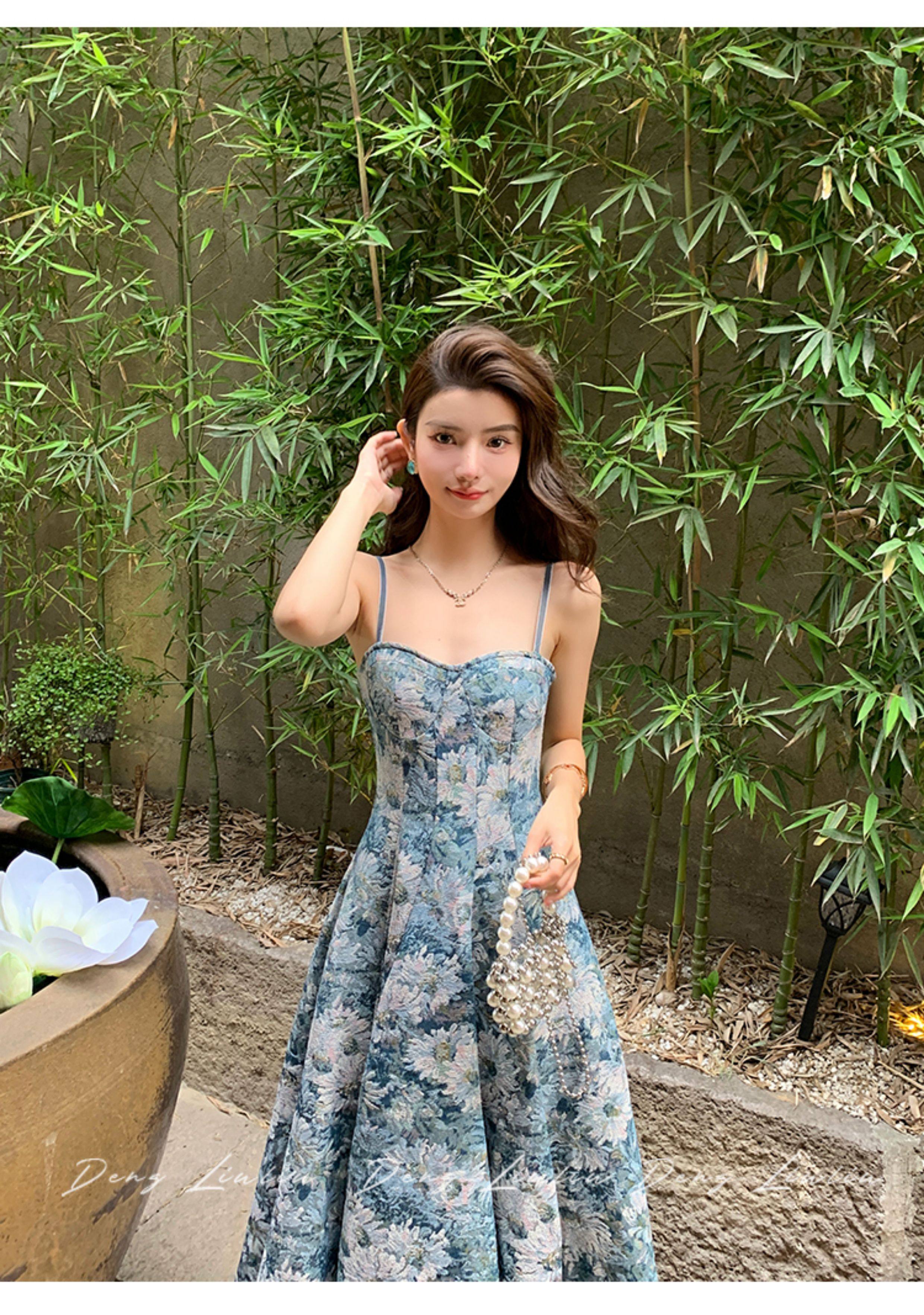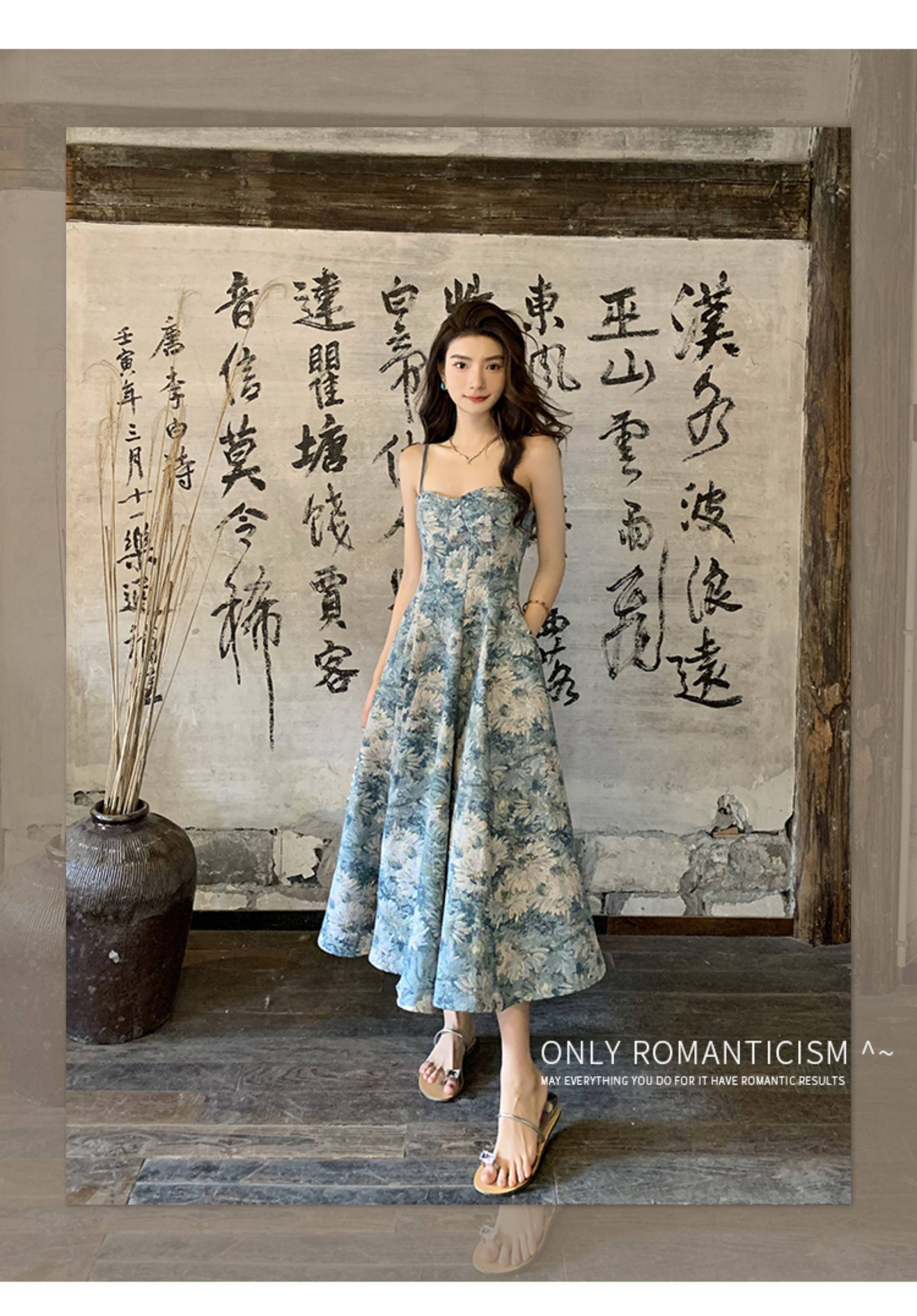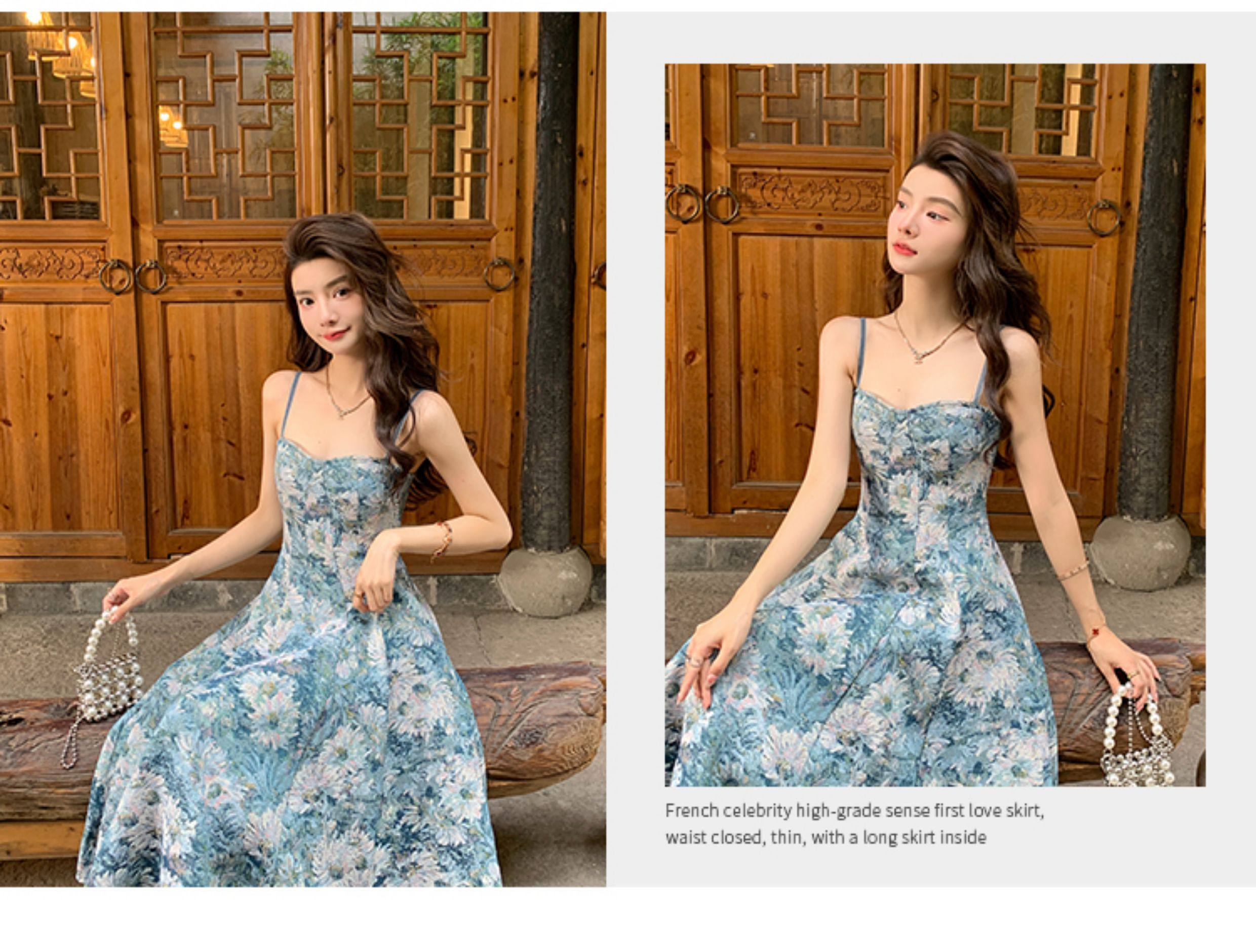 Deng Liuli French Retro Oil Painting Floral Spaghetti Strap Dress Blue Dress Women's Summer Beach Dress Seaside Vacation Long Dress