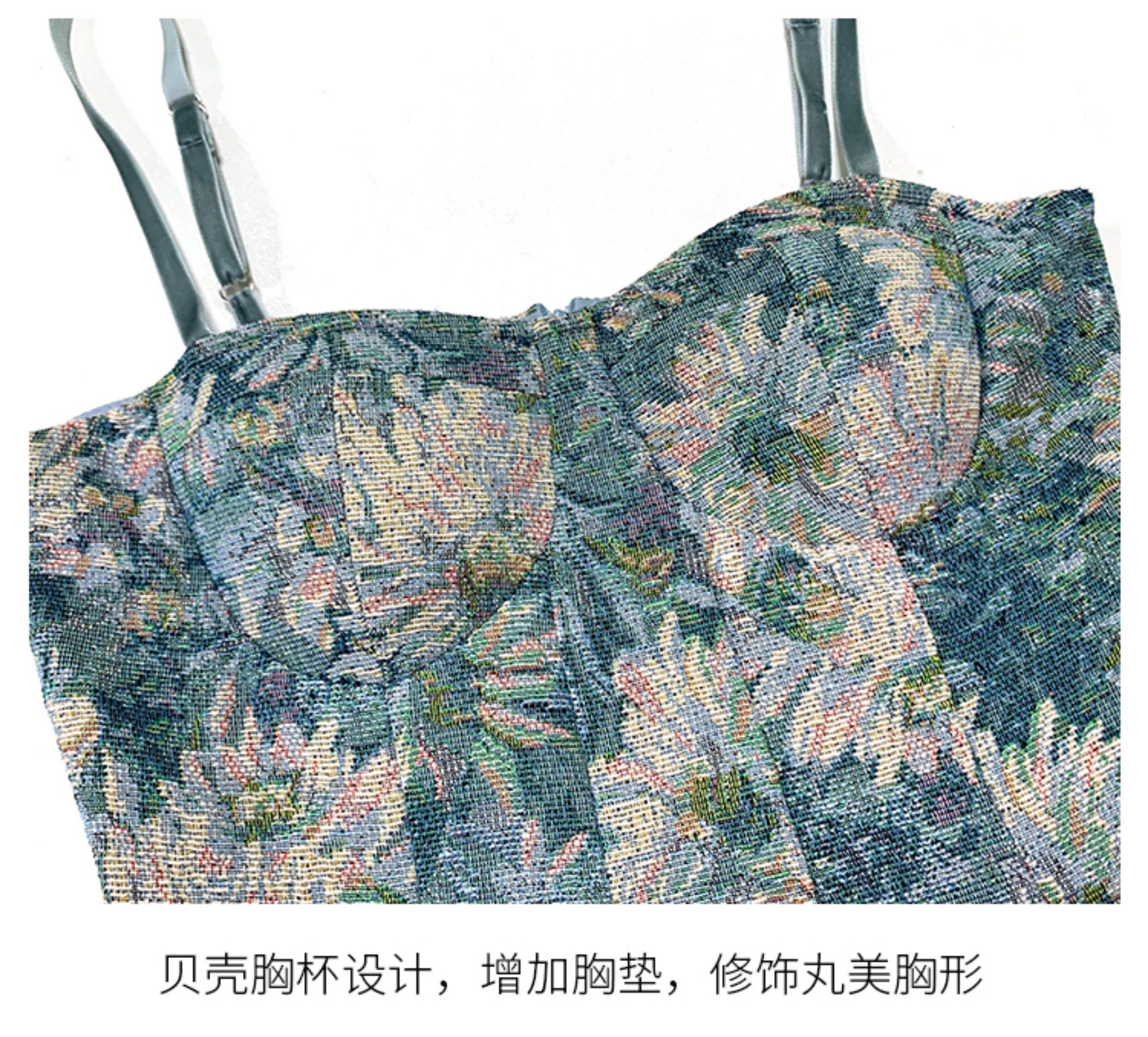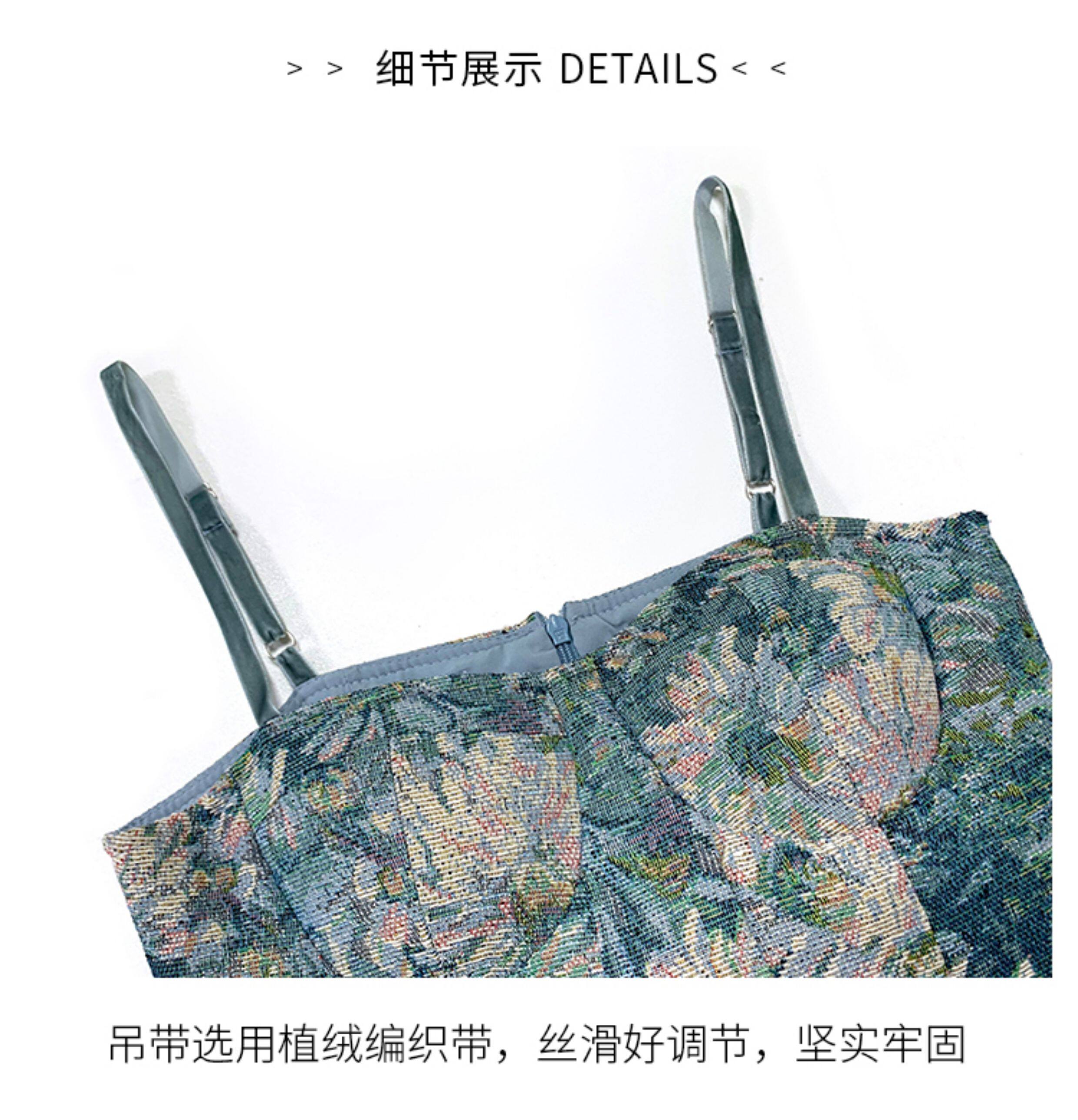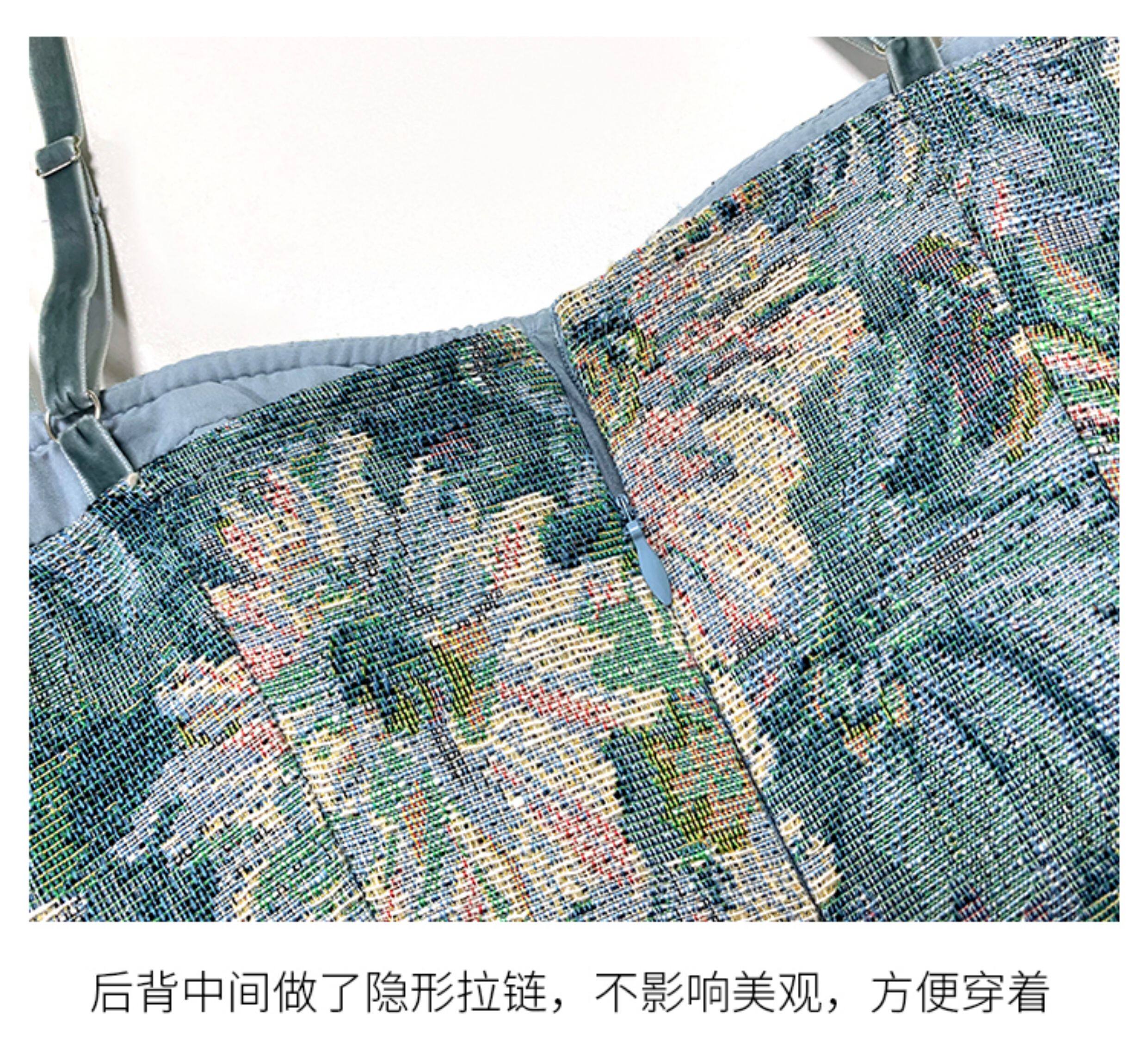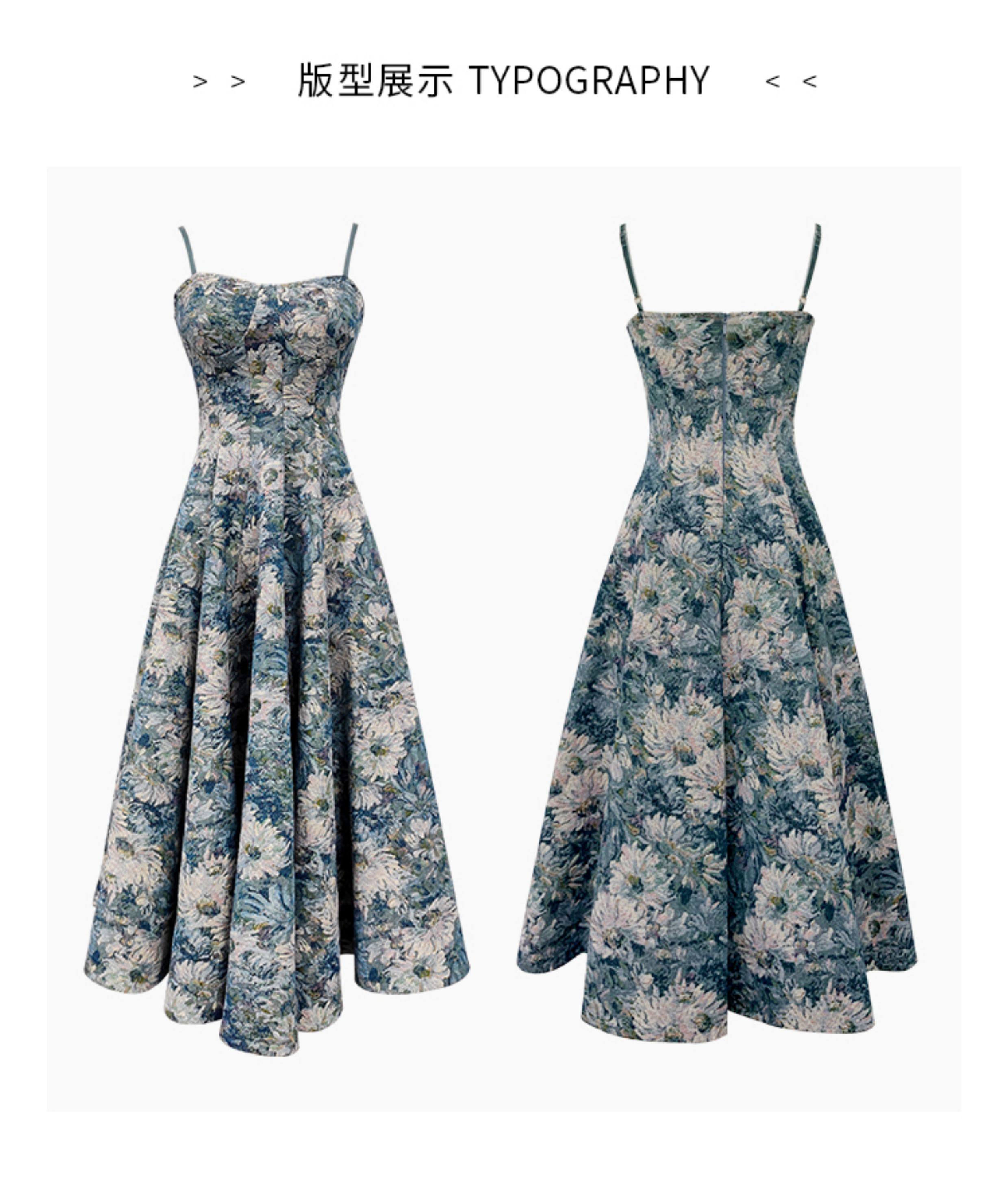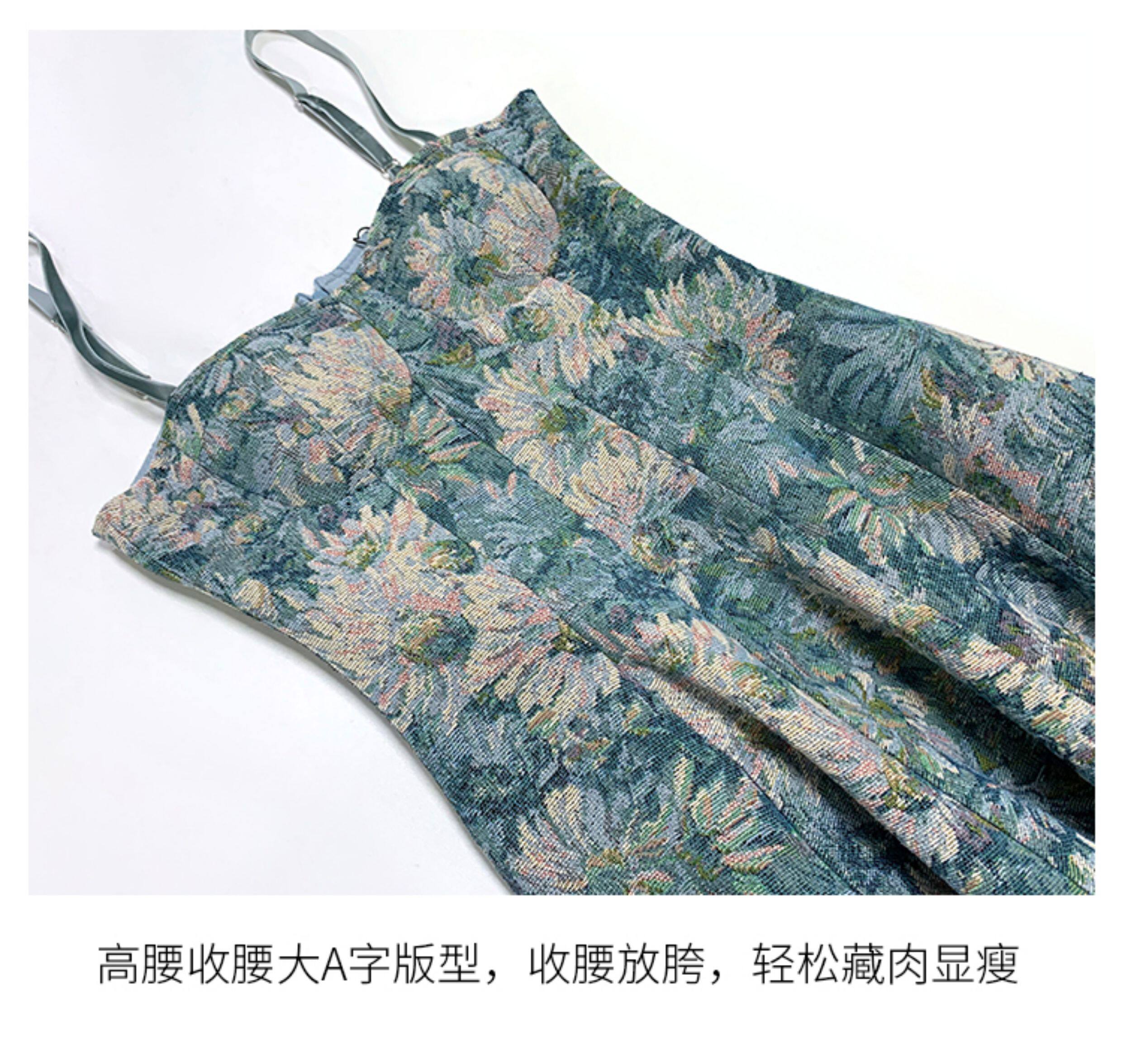Deng Liuli French Retro Oil Painting Floral Spaghetti Strap Dress Blue Dress Women's Summer Beach Dress Seaside Vacation Long Dress