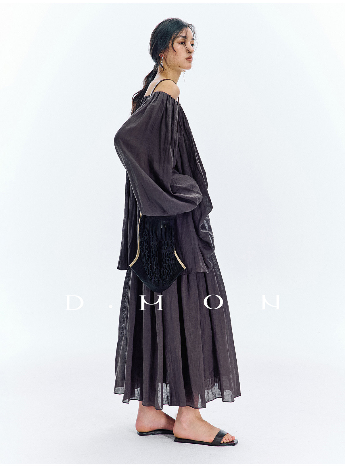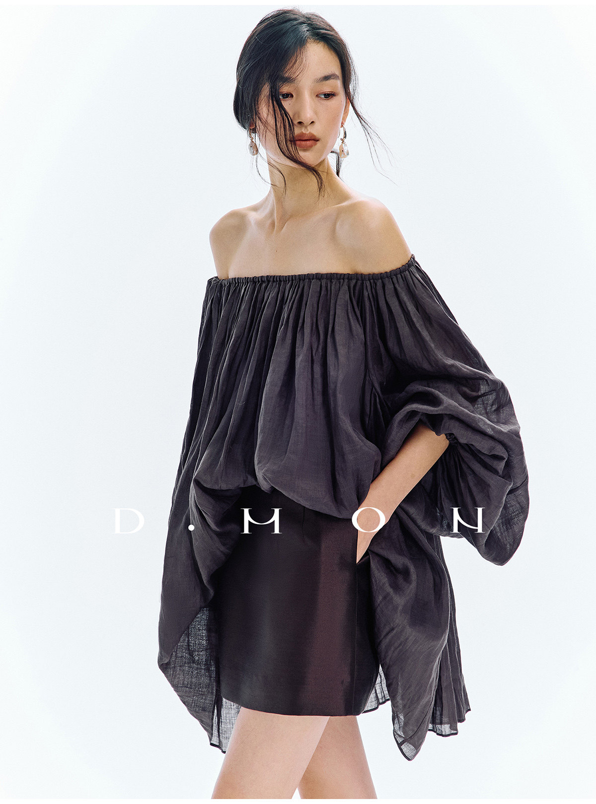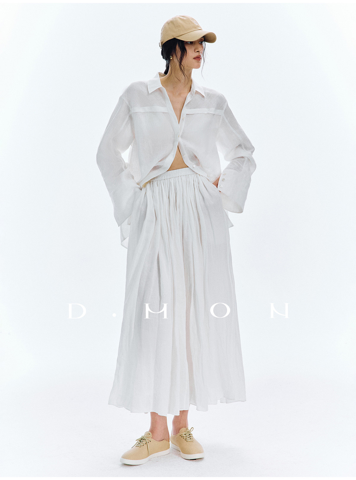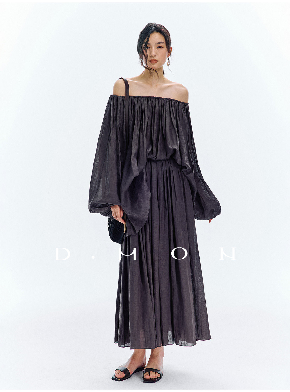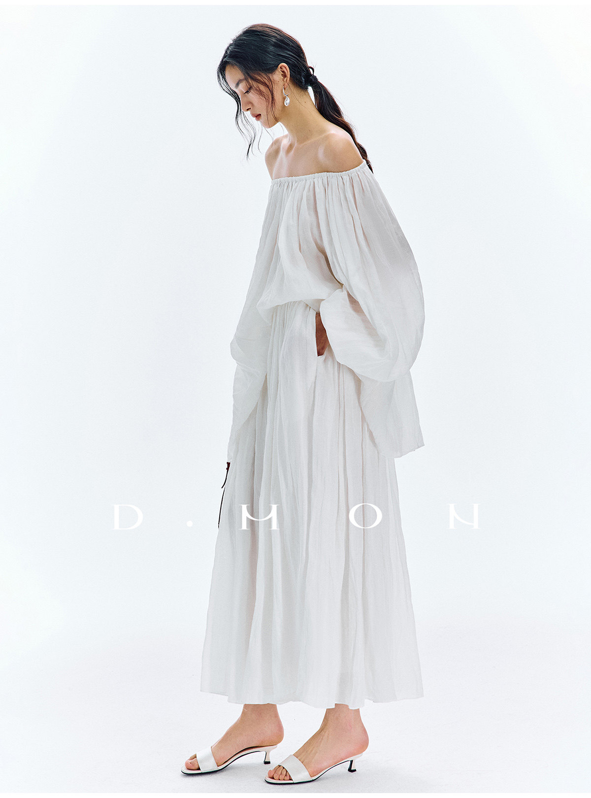 Dmon|Exclusive Custom-Spun Natural Ramie Light Holiday-Style Romantic Ruched Slimming Elegant Set