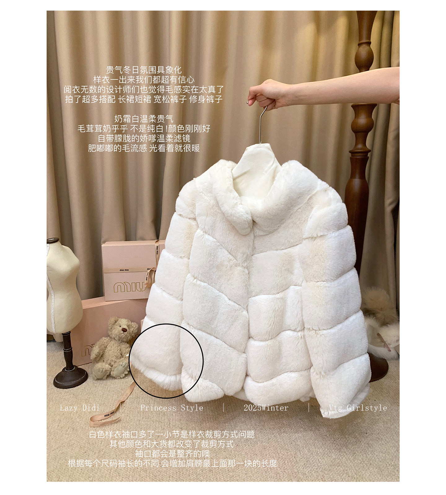 西柚色我最推荐!!淡淡的静奢气息甜美复古的绘纱子代表色朦胧的奶霜白 骄奢姐姐柔雾感灰色版型简约大方 不挑人 日系甜美 袖子做的九分袖 很有千金感 可以露出精美的内搭袖口微卷的栗色卷发加上靠兔毛本身的柔雾质感衬出“不费力的甜” 像可爱娇憨大小姐的“慵懒又精致”日系甜美审美复刻