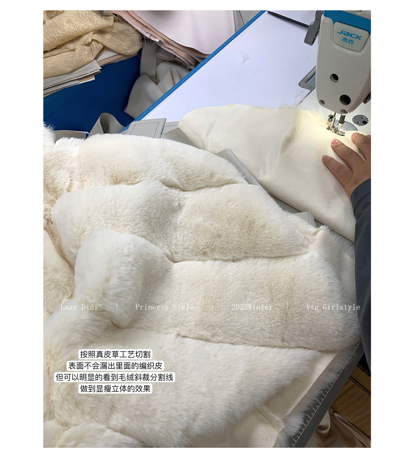 先把毛条全部单条裁剪每一条毛 每一条布片 都是人工一条一条挑选出来 拼接而成面料做了定制的拼接工艺 将细腻绒毛间勾勒出立体沟壑