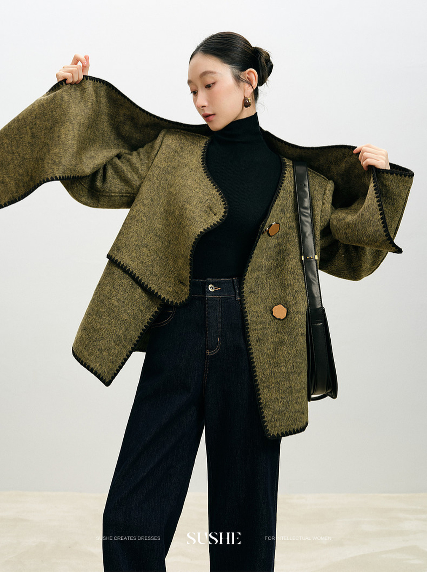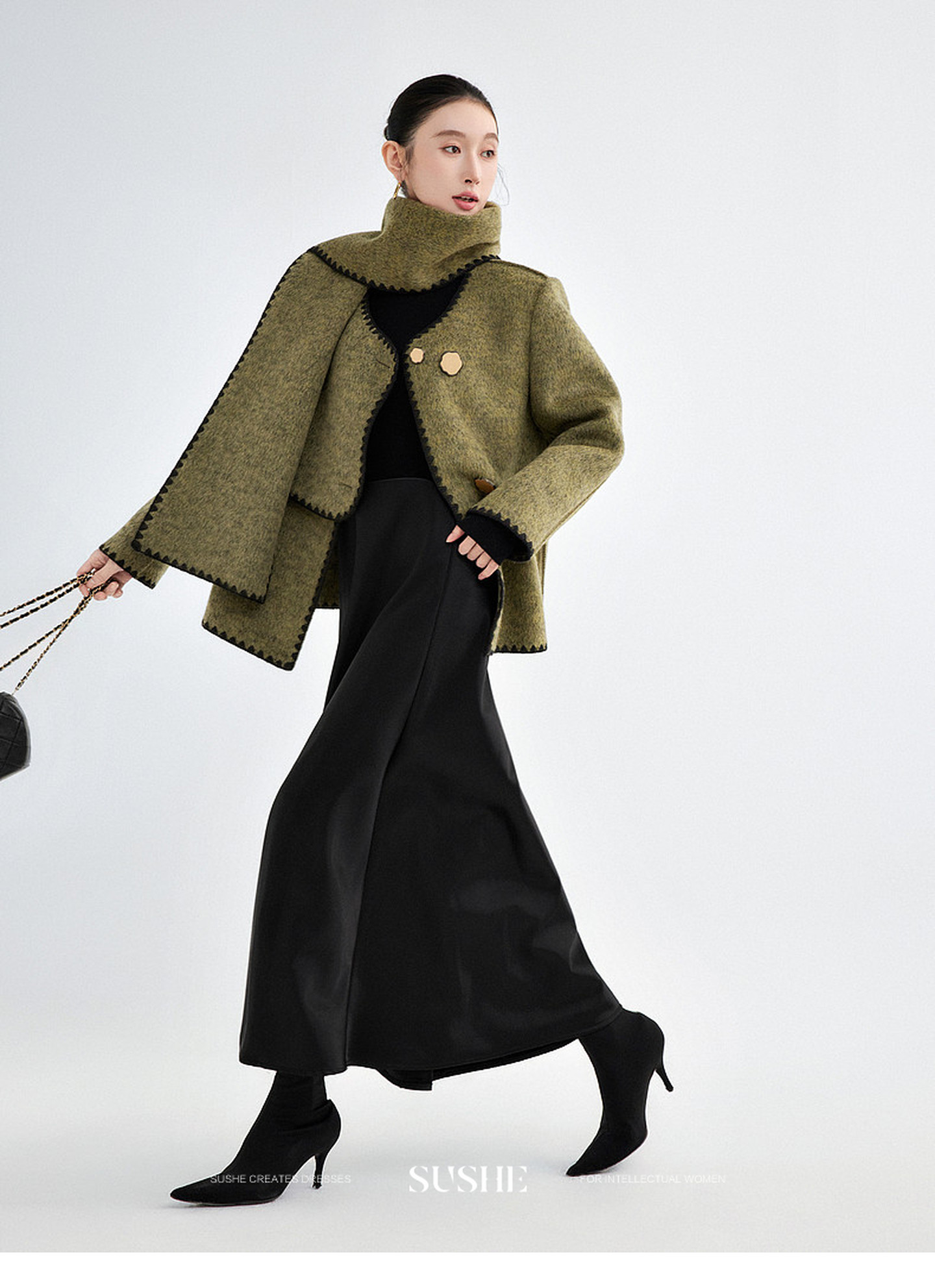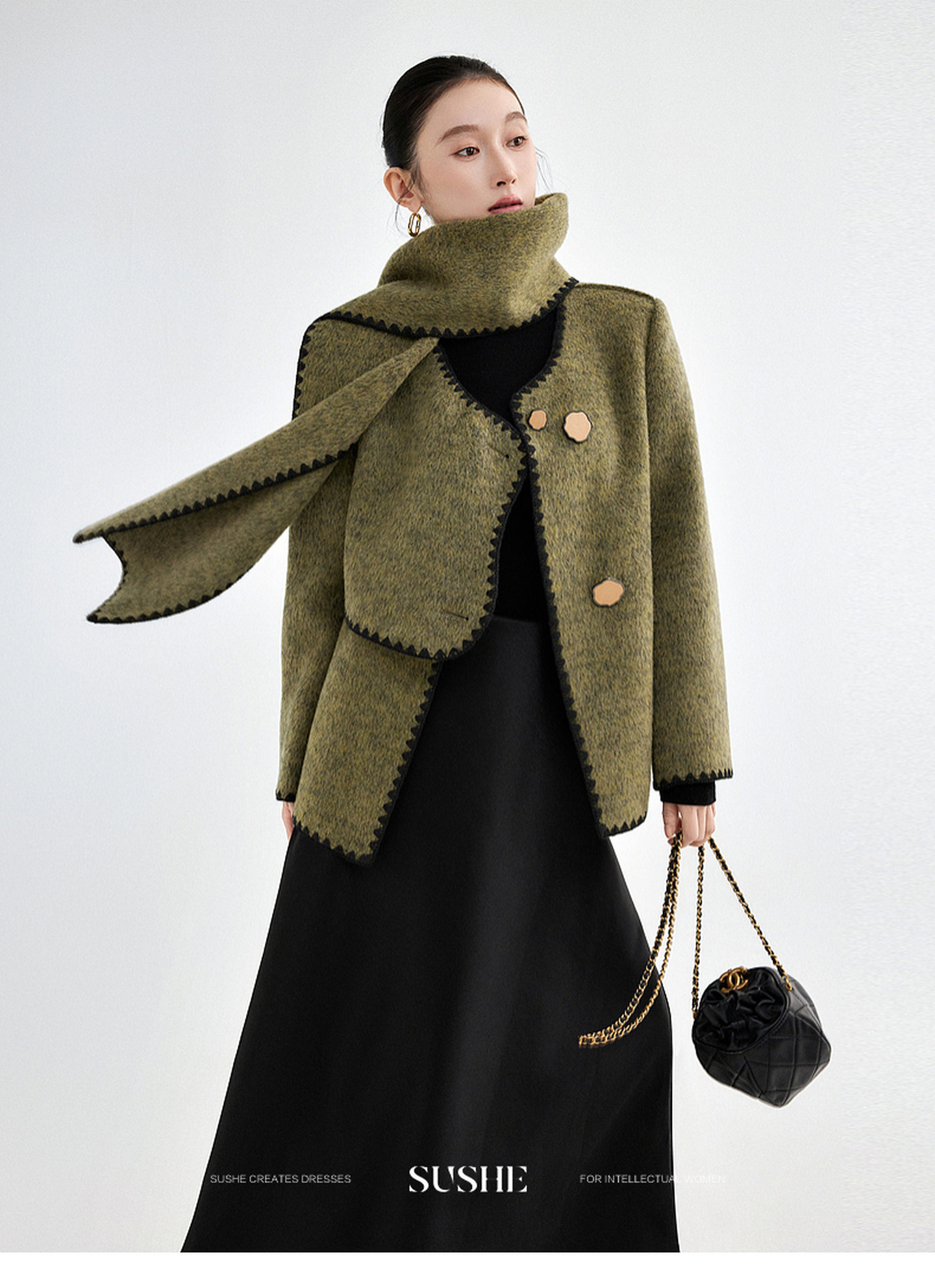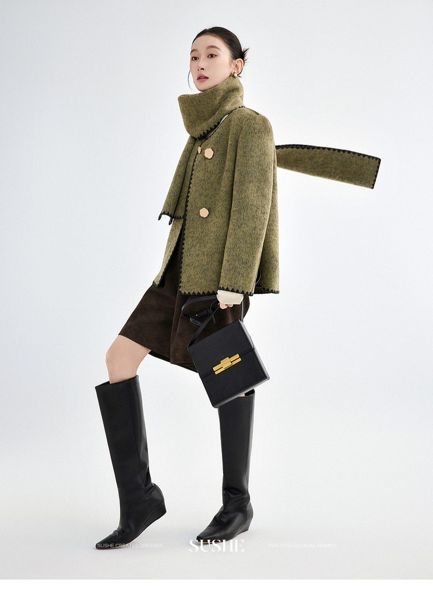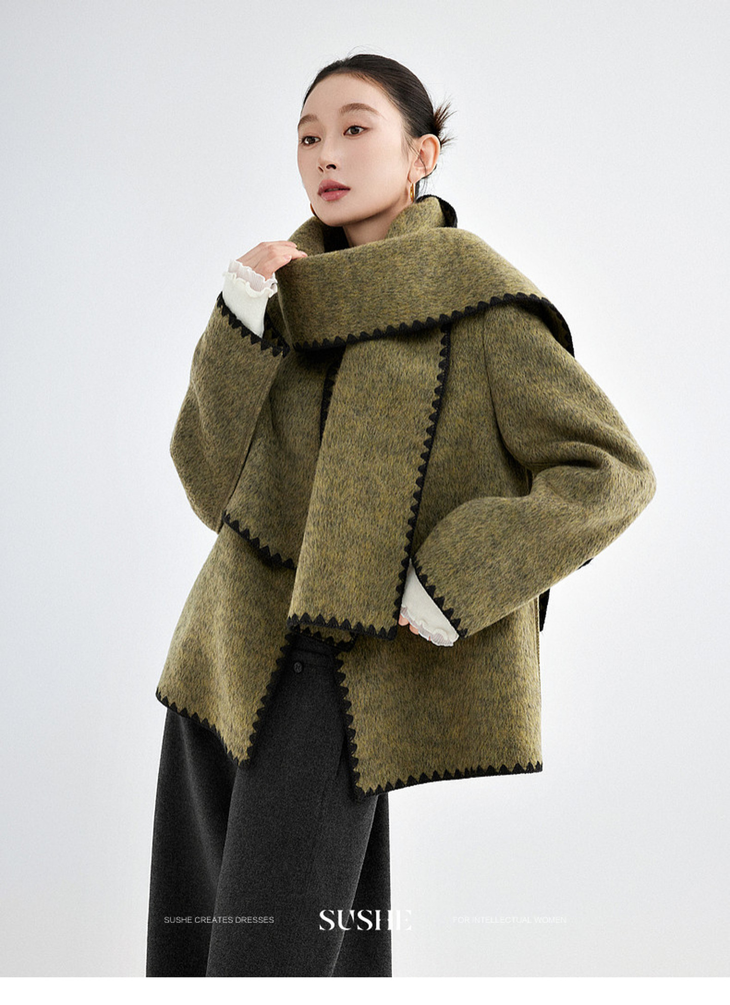 Sushe Green Scarf Double-Sided Wool High-End Sheep Wool Elegant Box-Shaped Straight-Shoulder Coat for Women Winter