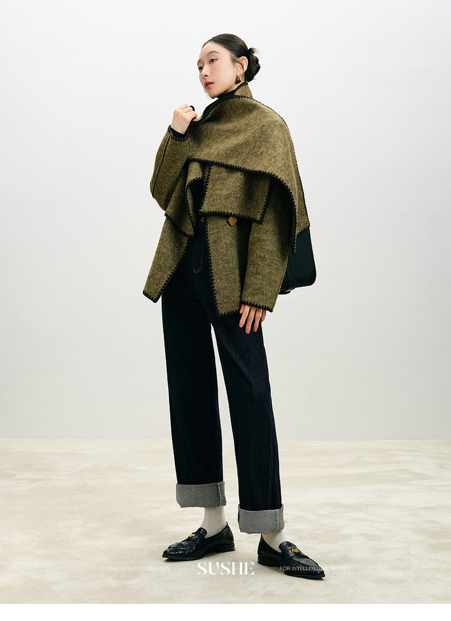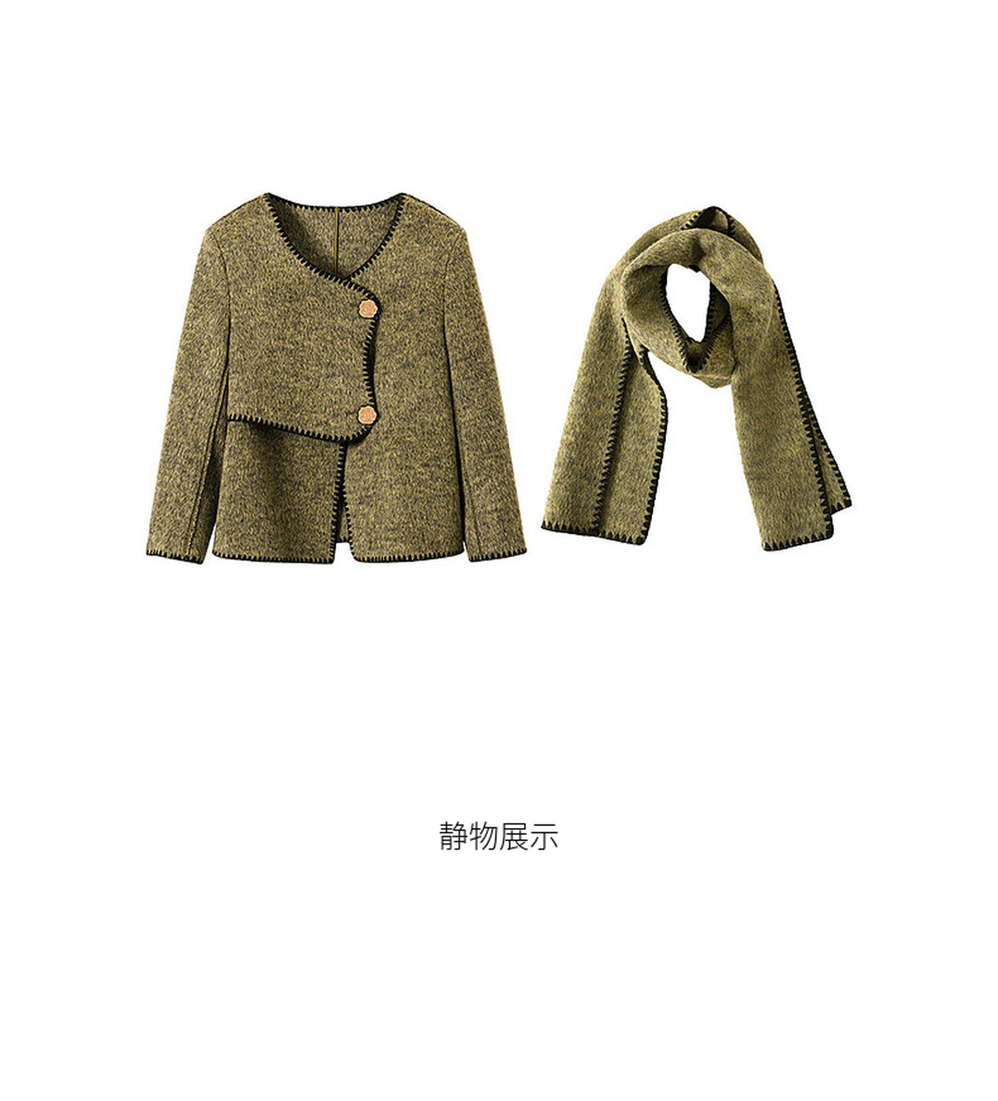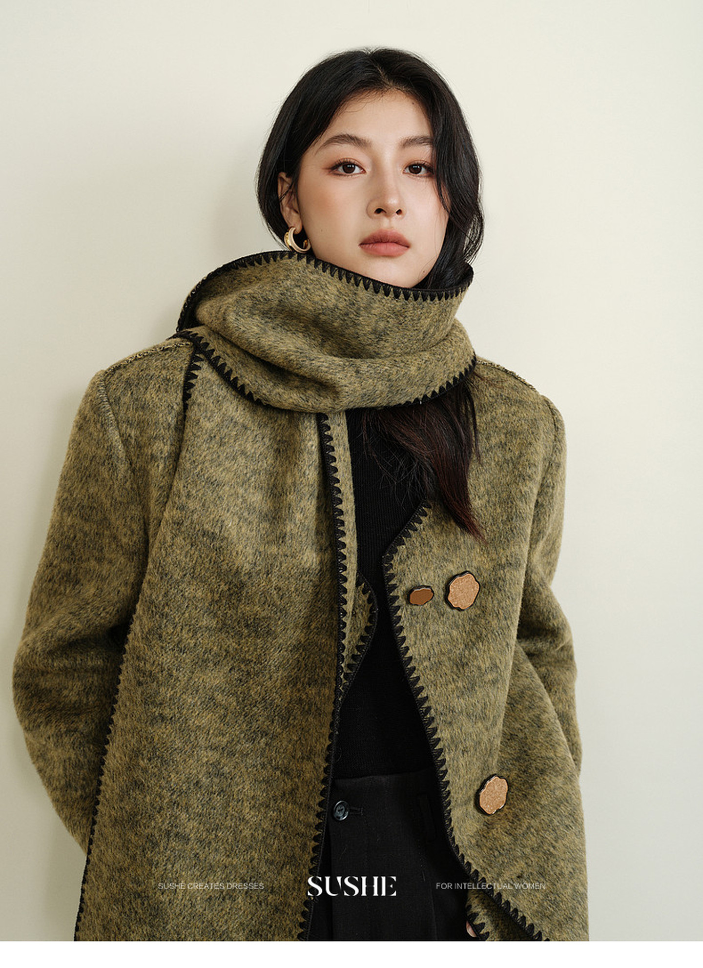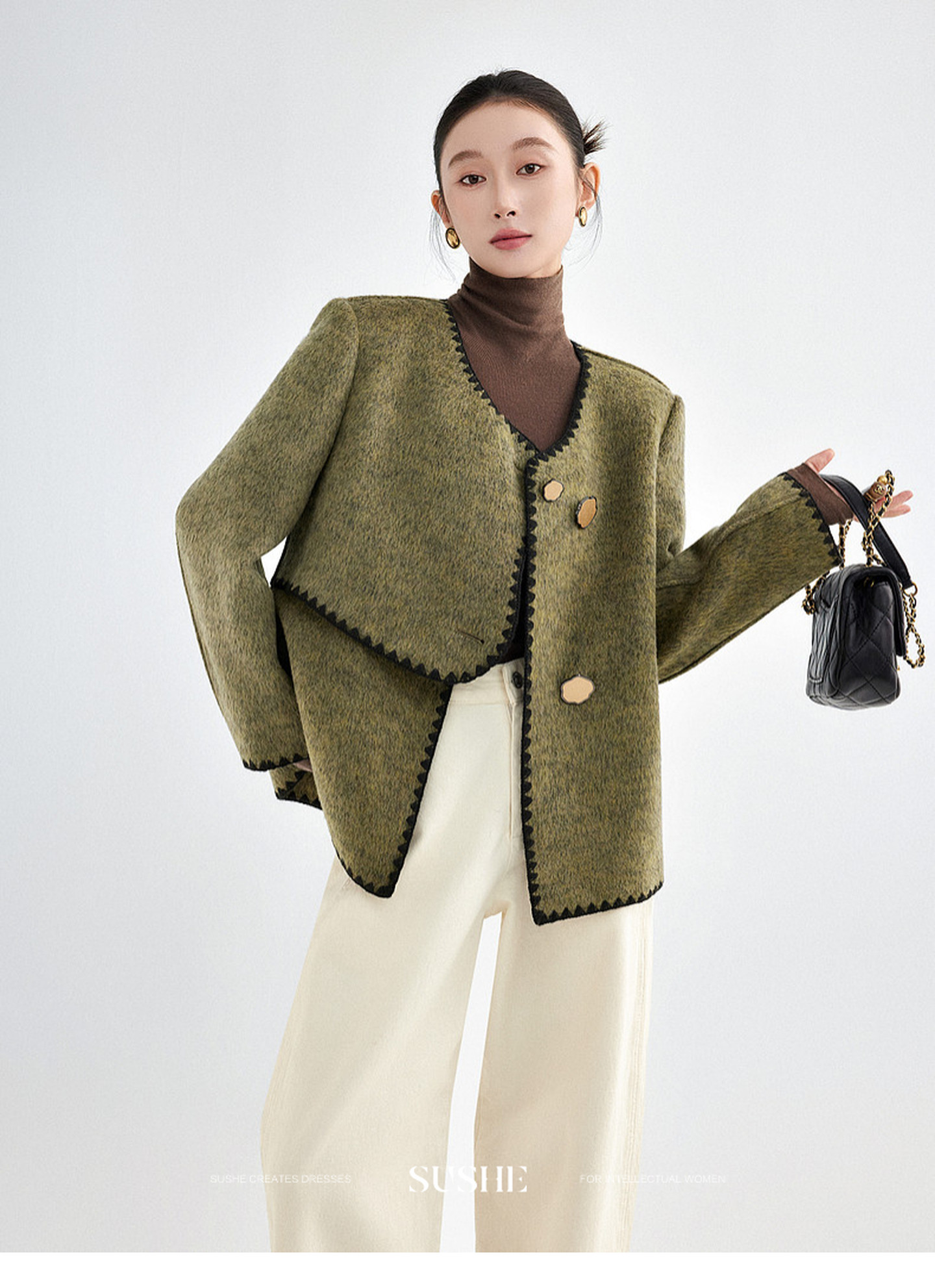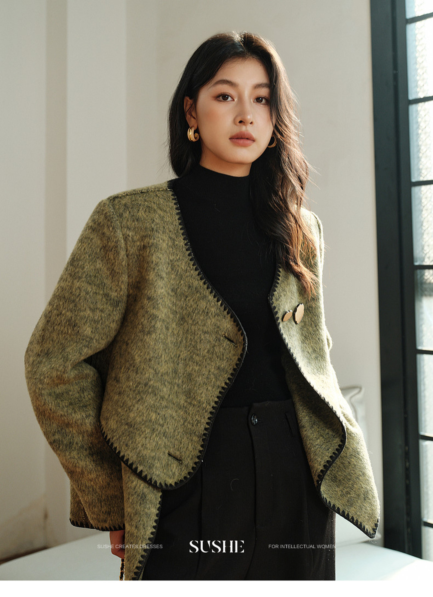 Sushe Green Scarf Double-Sided Wool High-End Sheep Wool Elegant Box-Shaped Straight-Shoulder Coat for Women Winter