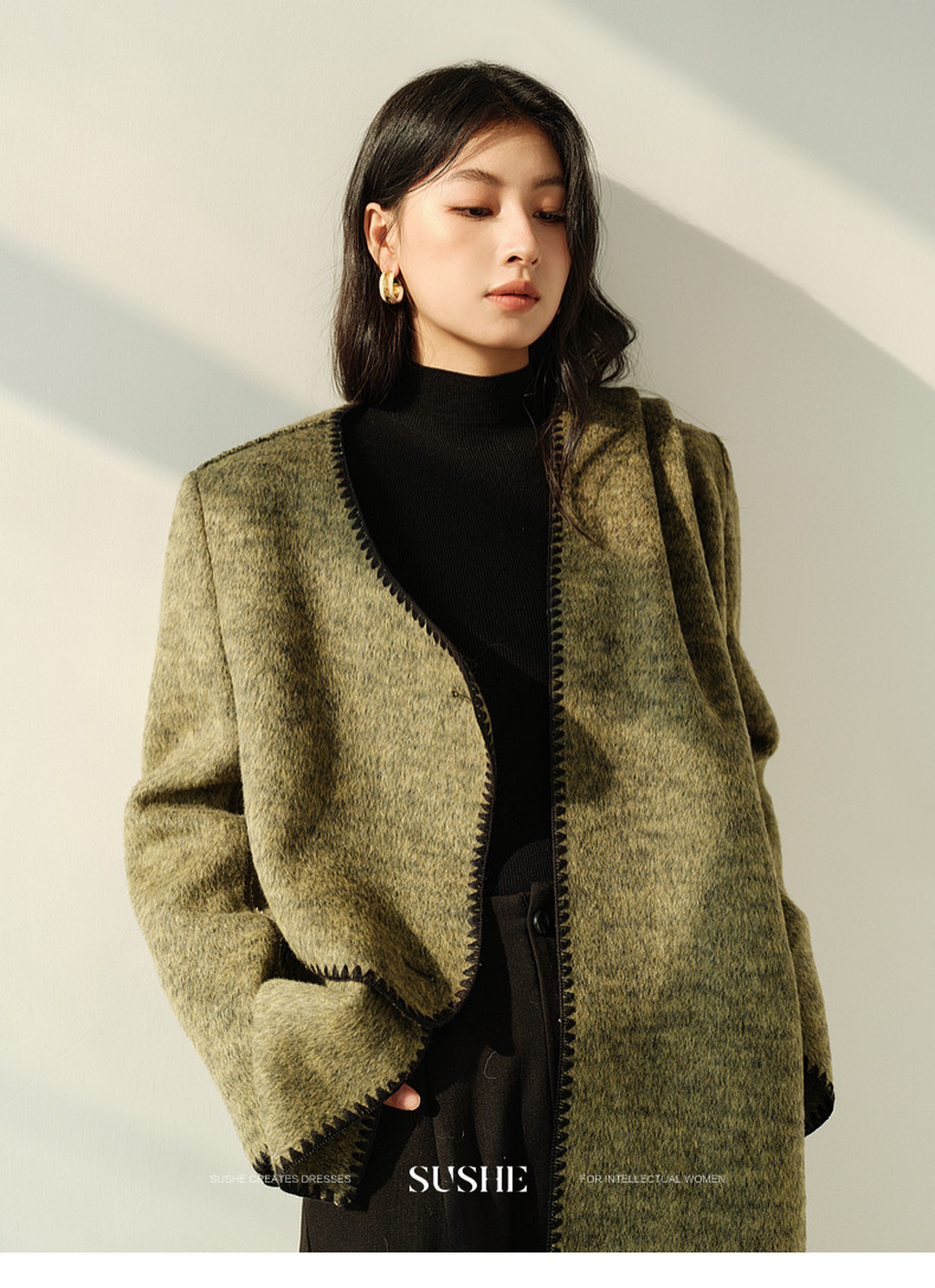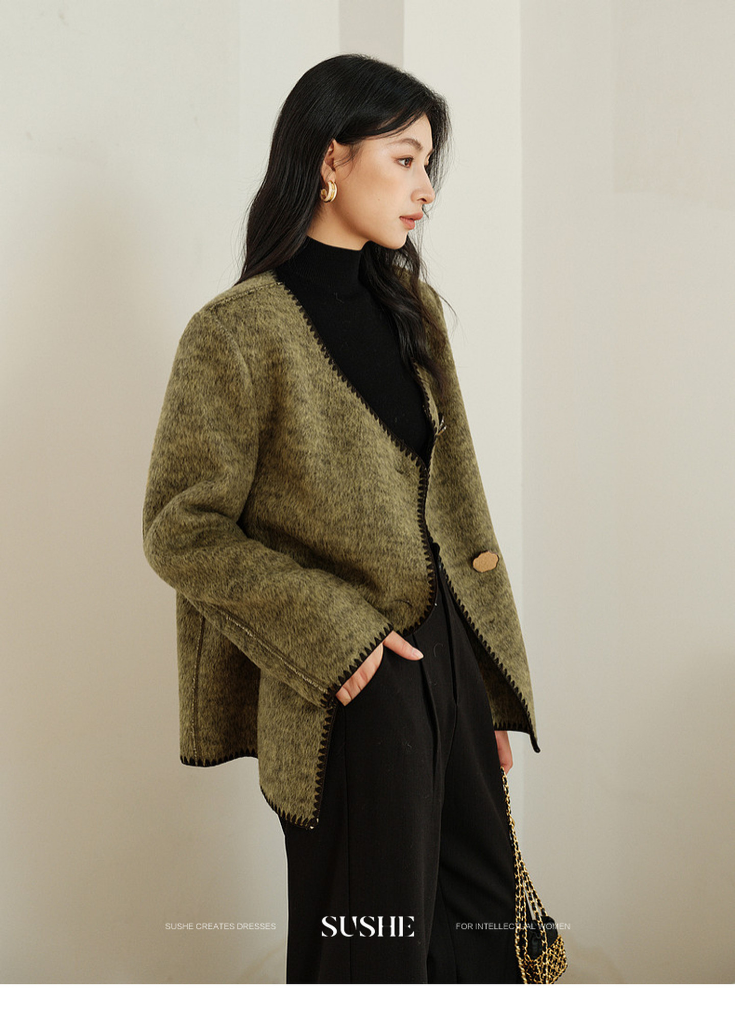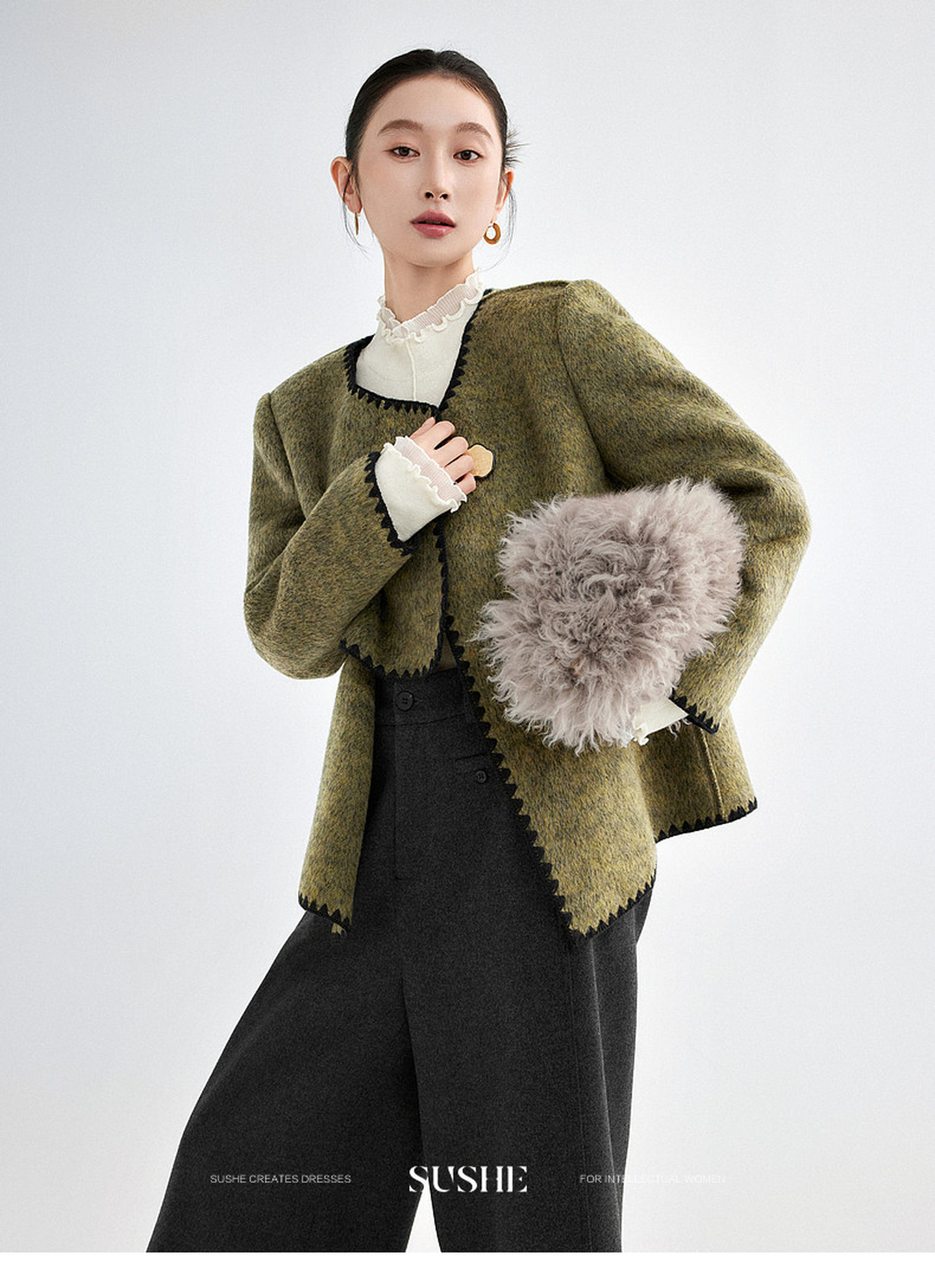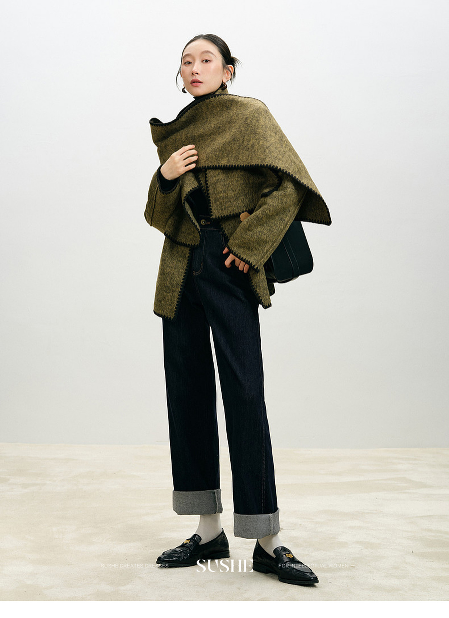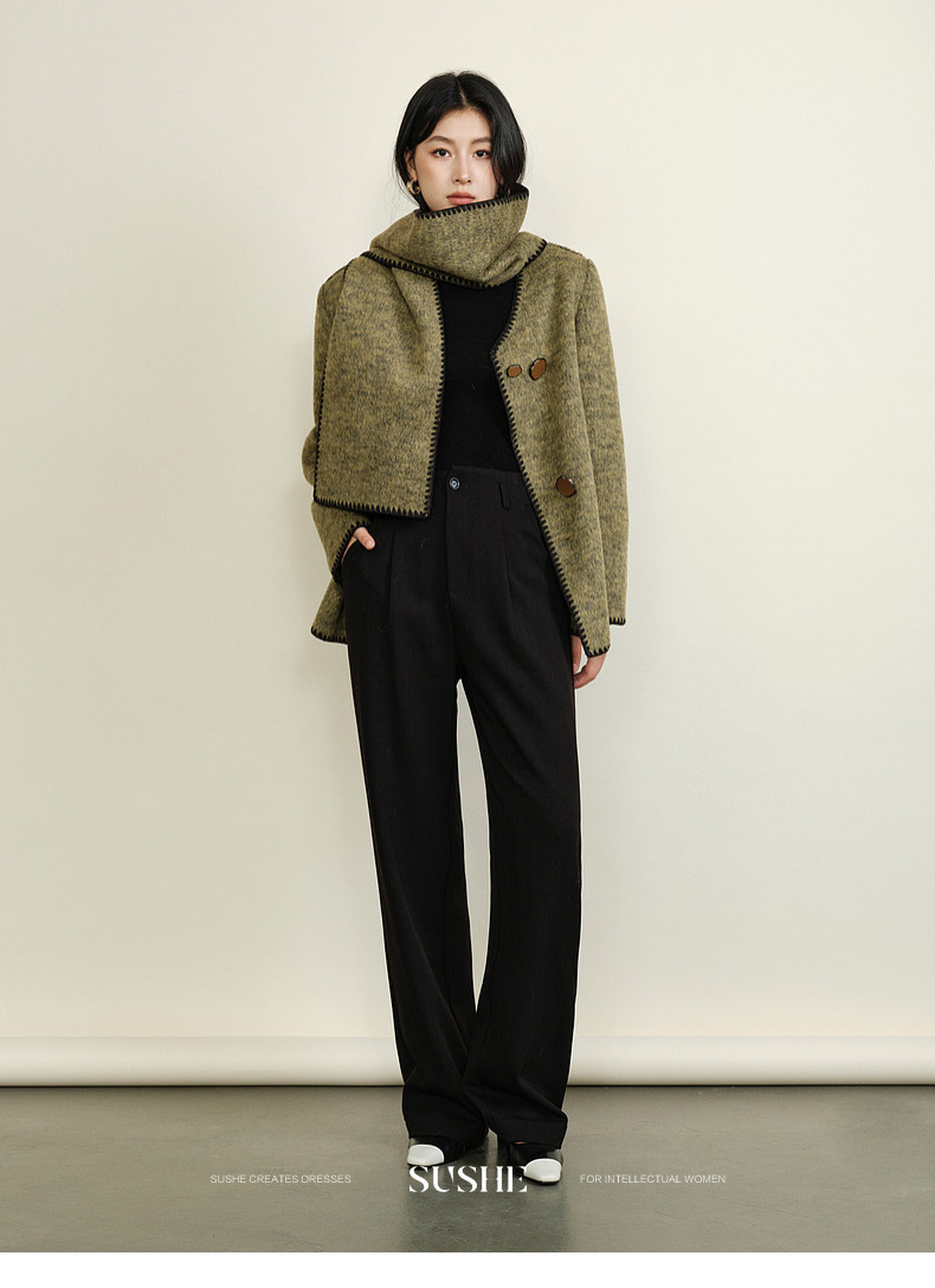 Sushe Green Scarf Double-Sided Wool High-End Sheep Wool Elegant Box-Shaped Straight-Shoulder Coat for Women Winter