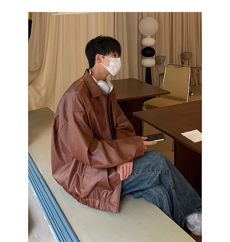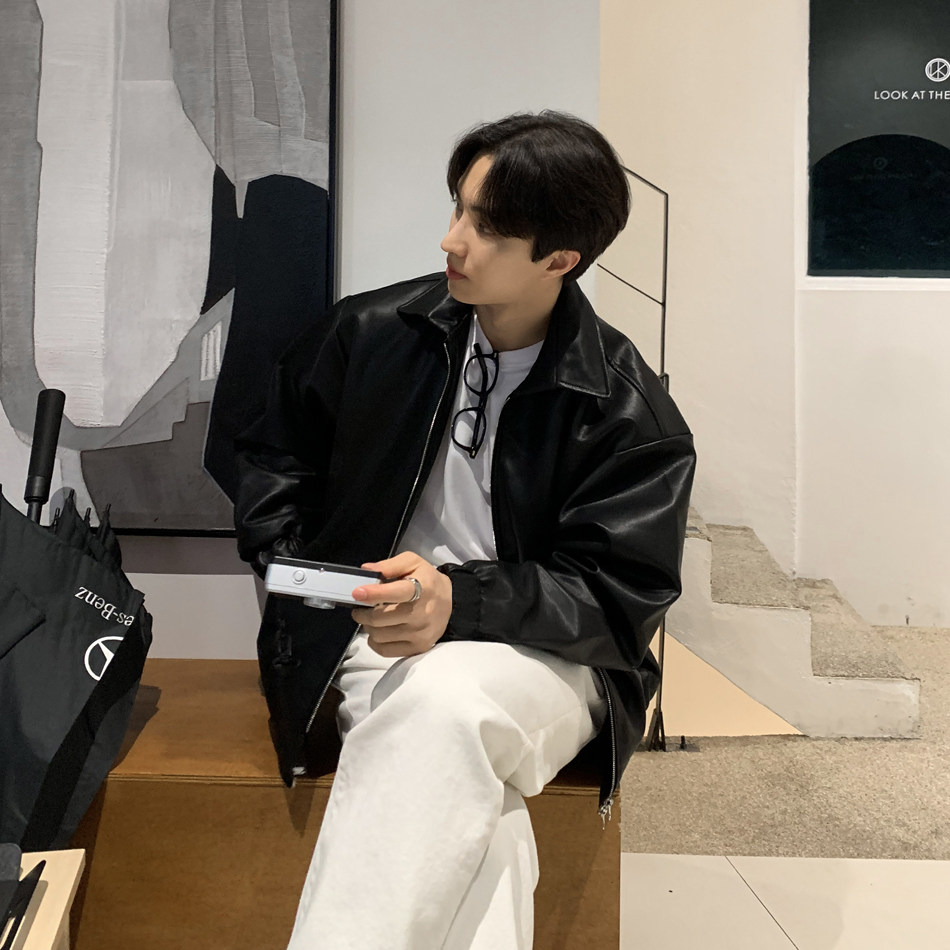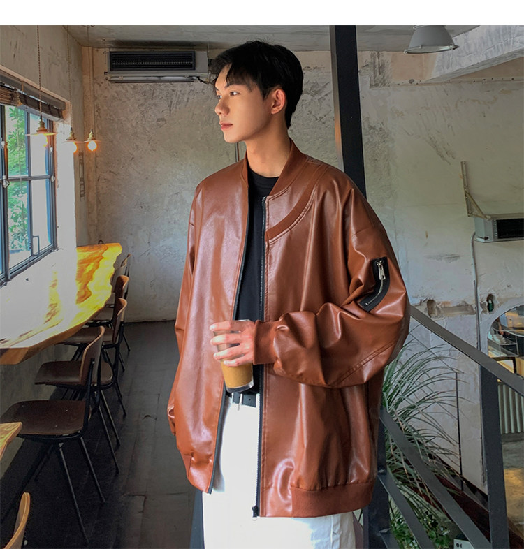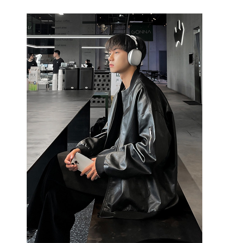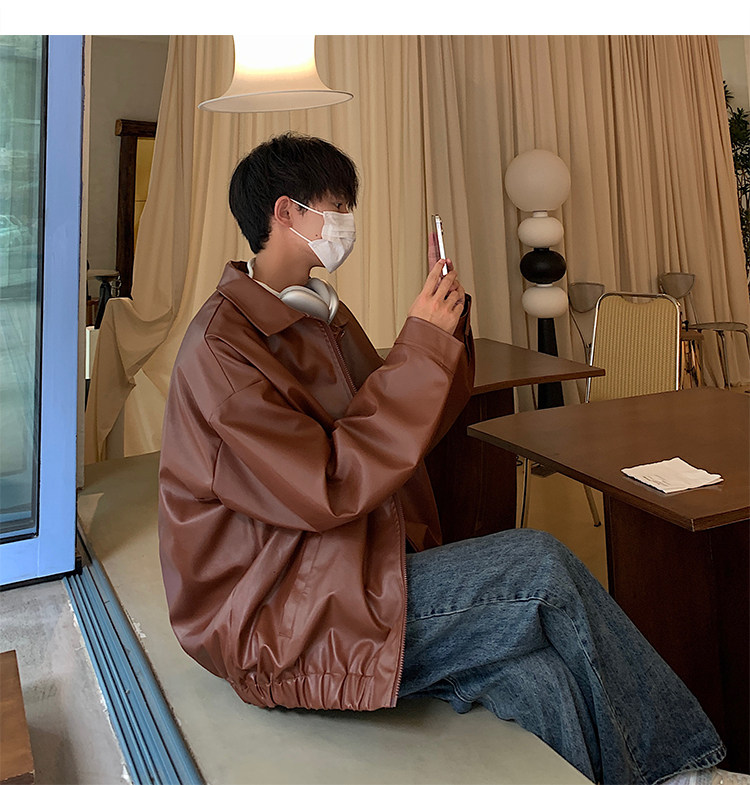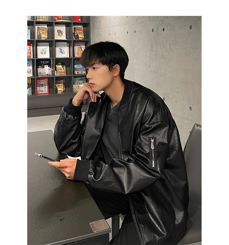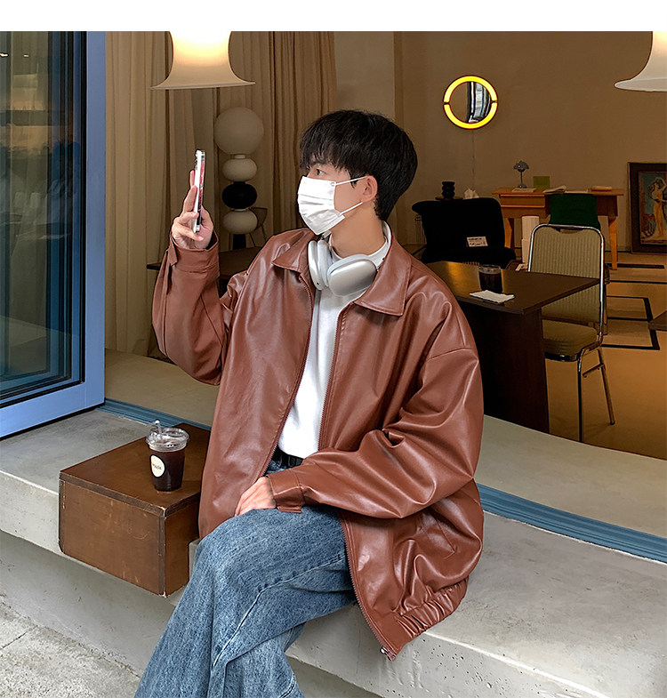 Spring and Autumn Korean Style Motorcycle Leather Jacket for Men, Loose, Trendy, Handsome, Black, Retro, American Style Trendy Brand Leather Jacket for Men
