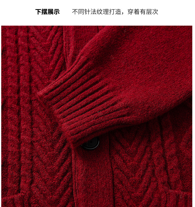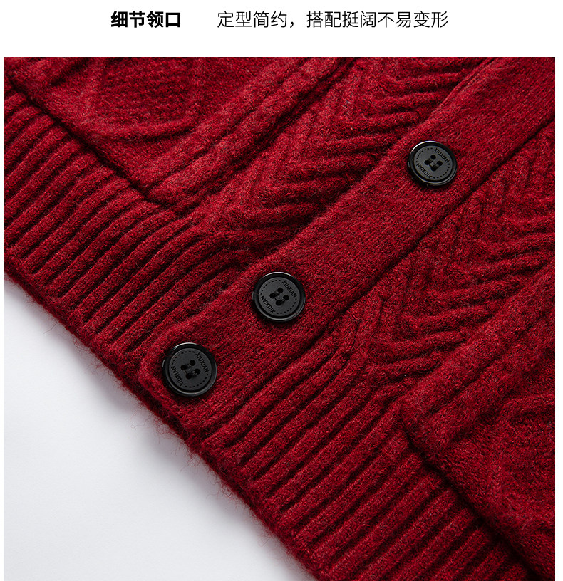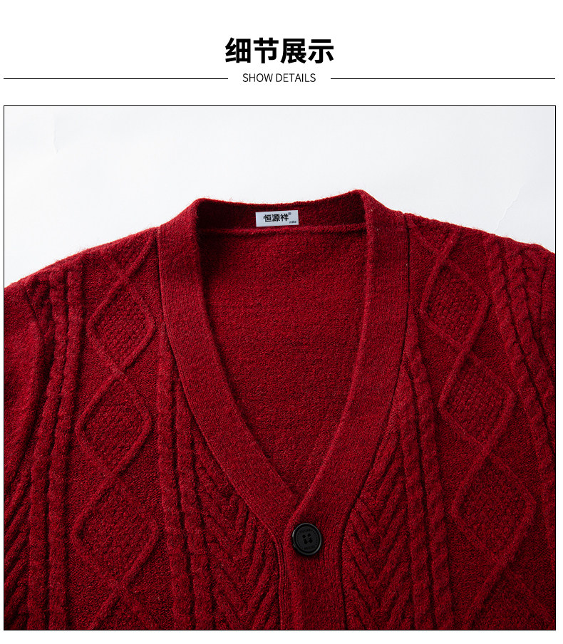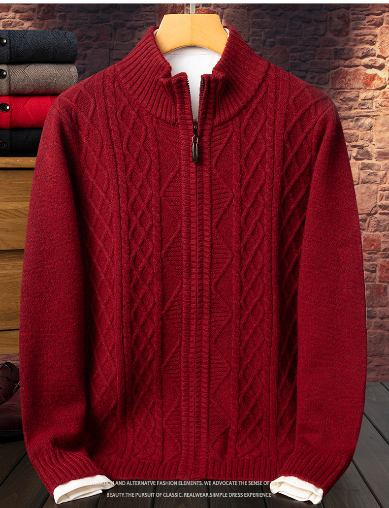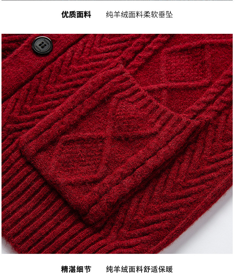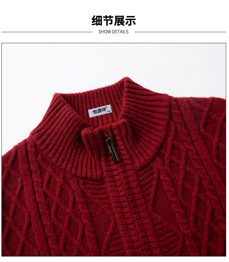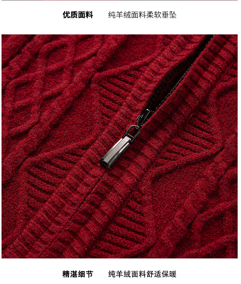 Hengyuanxiang 100% Pure Cashmere Sweater for Men, Middle-Aged Jacquard Zipper Thickened Red Knit Cardigan for the Year of Birth