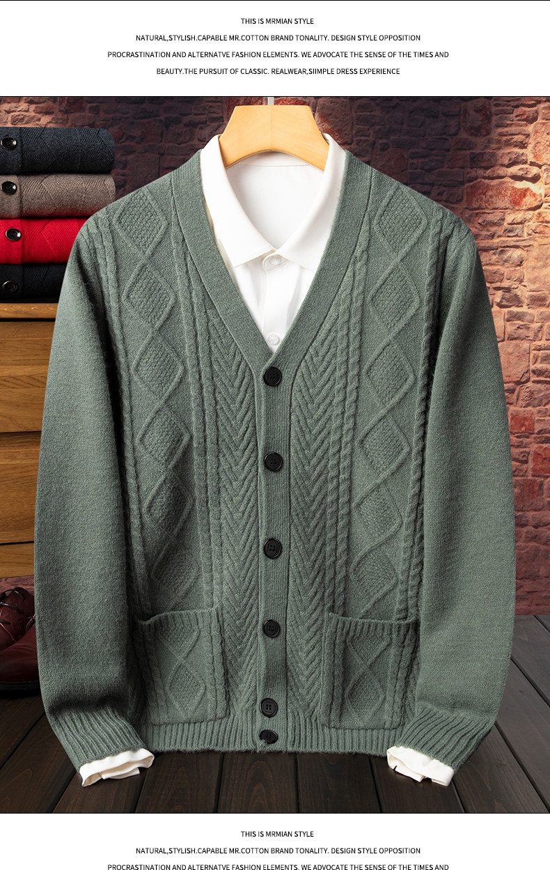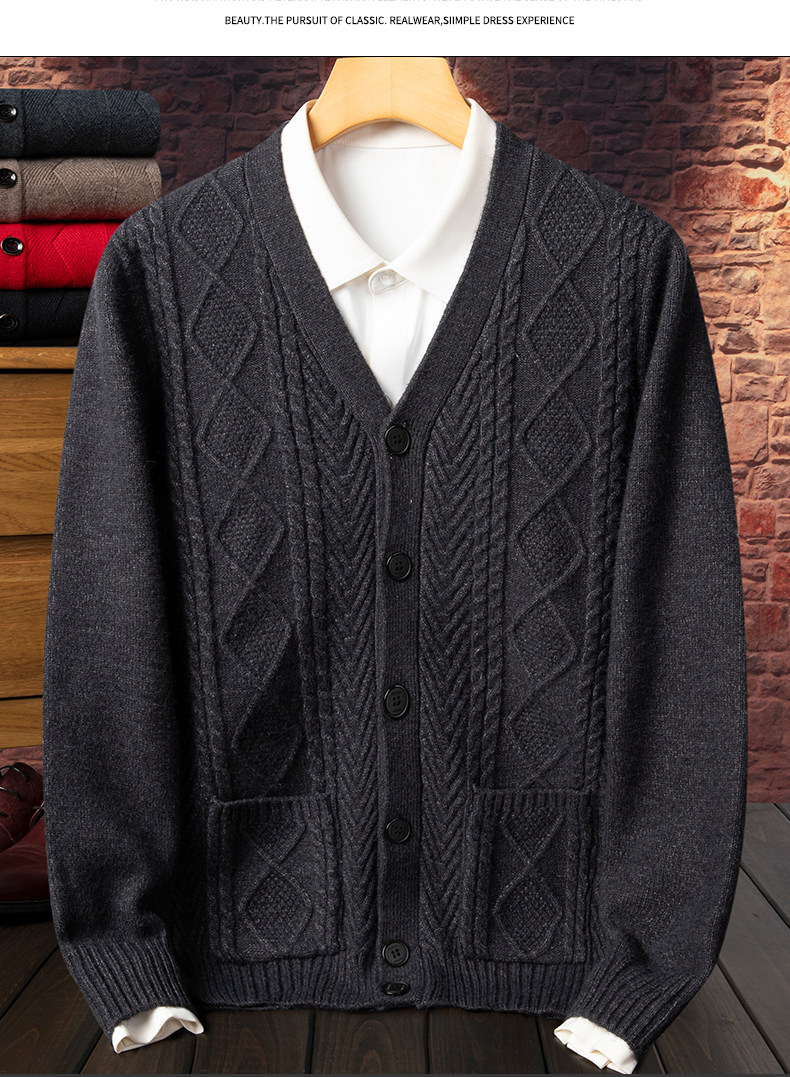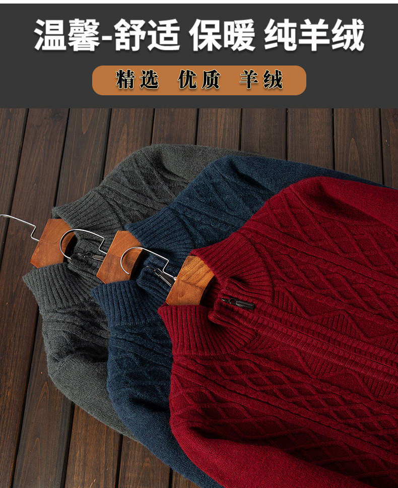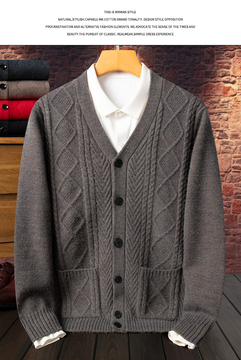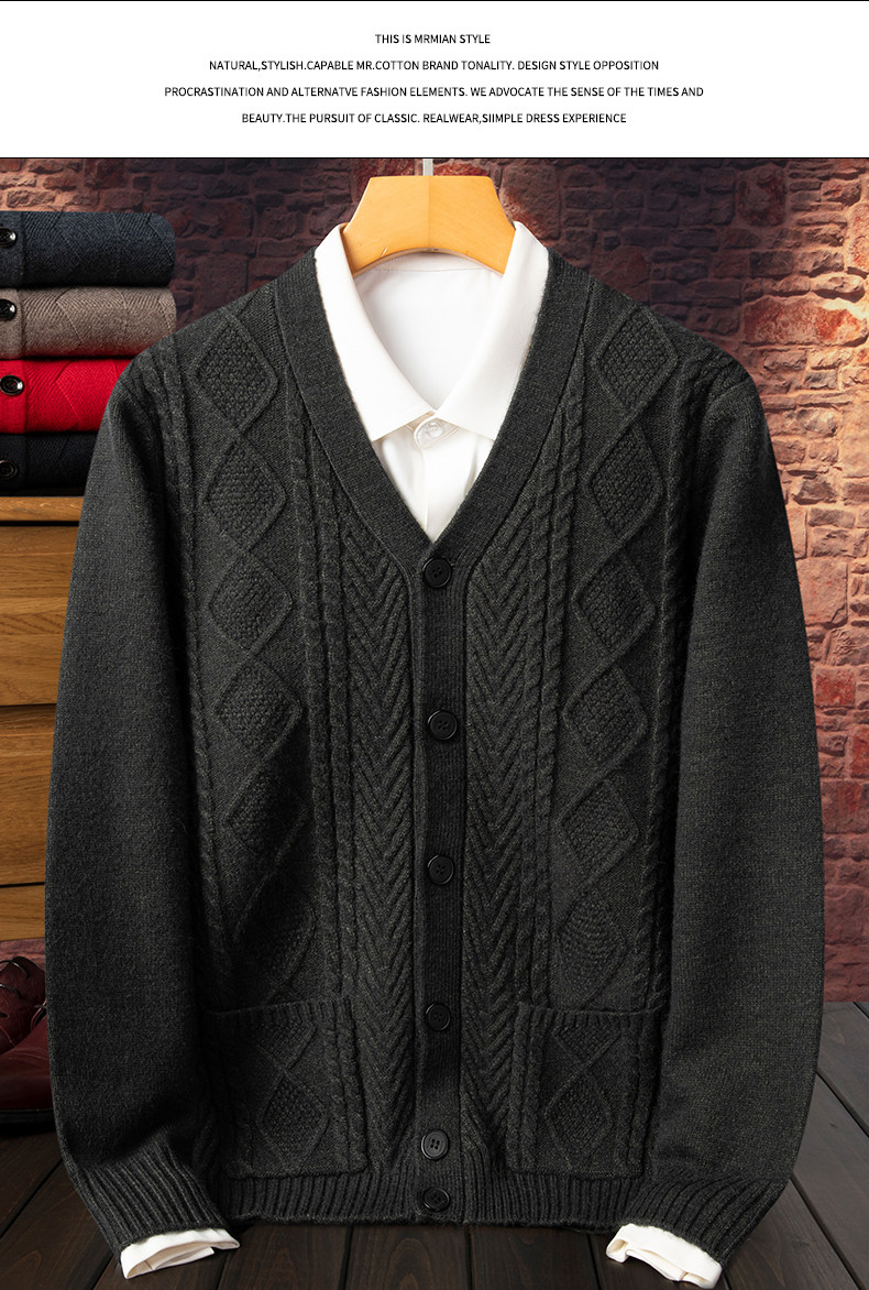 Hengyuanxiang 100% Pure Cashmere Sweater for Men, Middle-Aged Jacquard Zipper Thickened Red Knit Cardigan for the Year of Birth