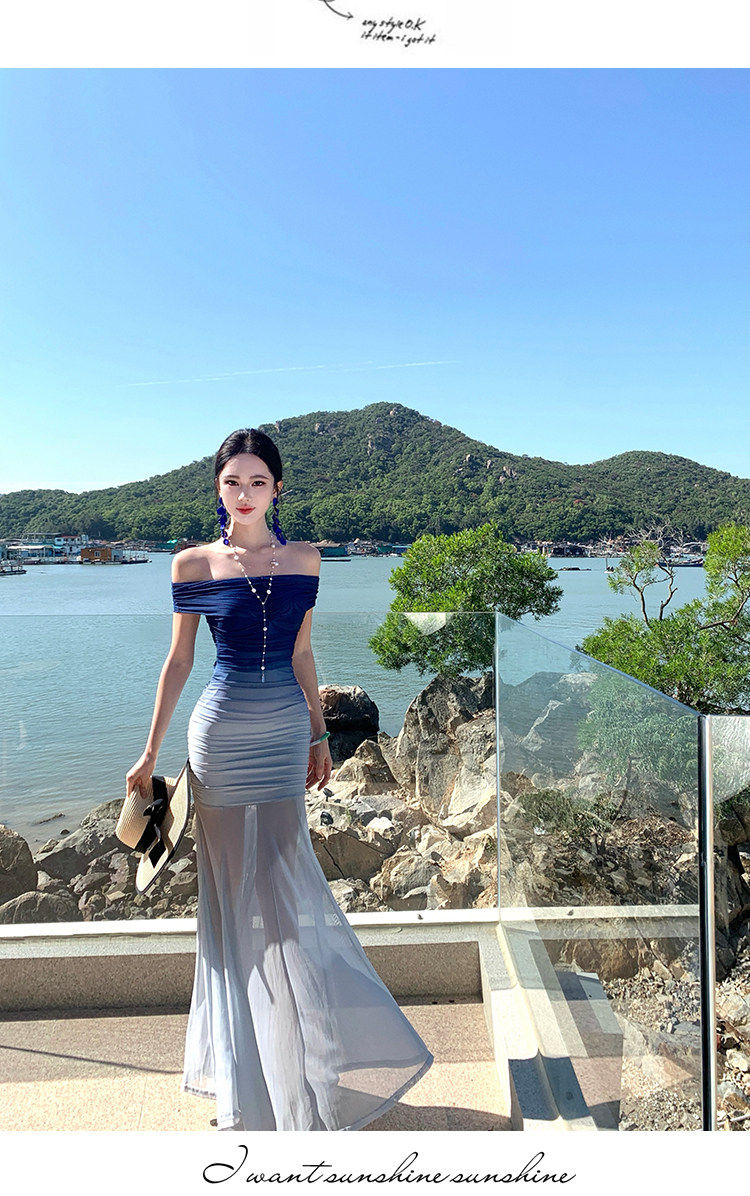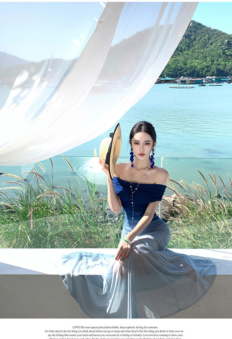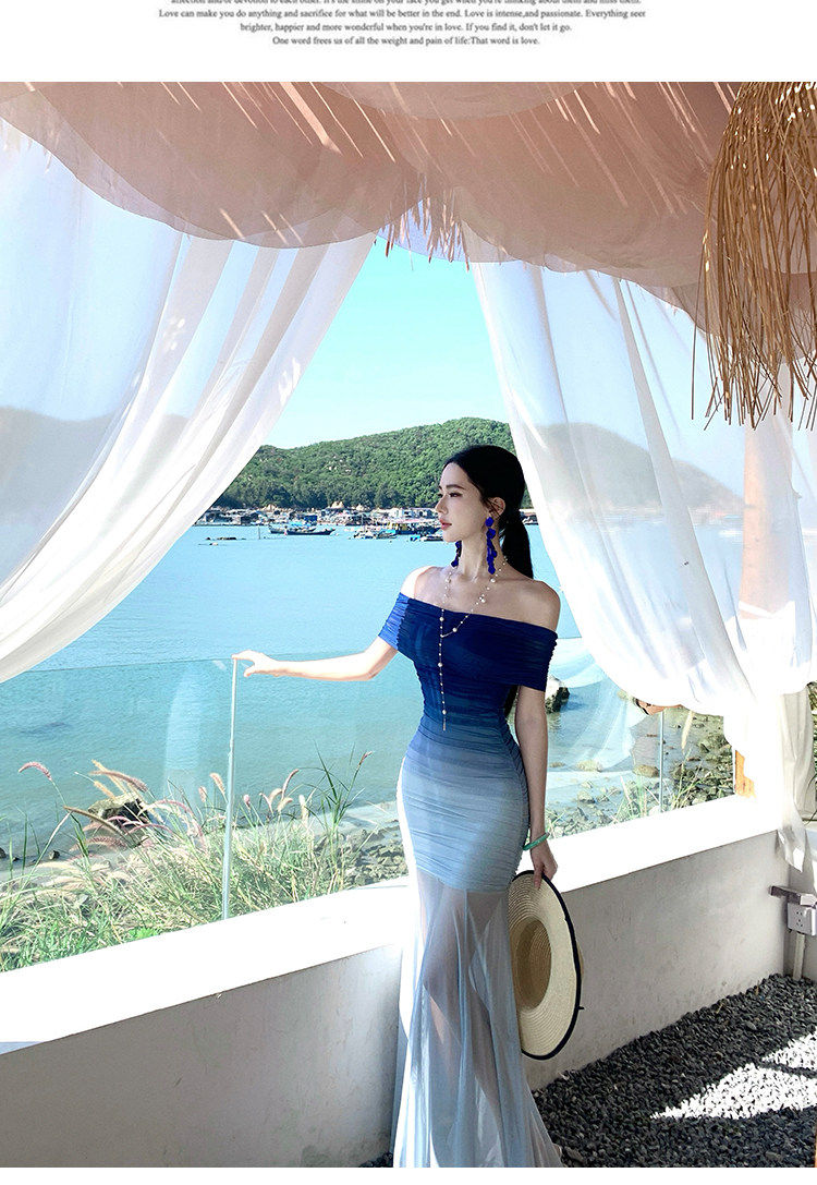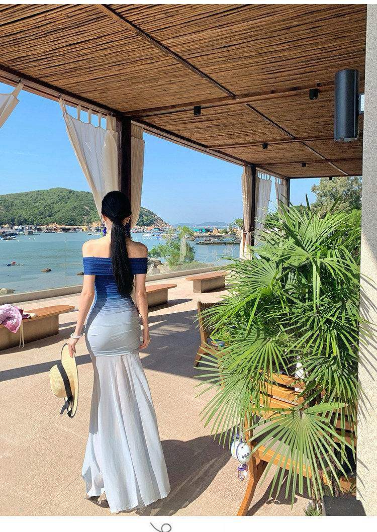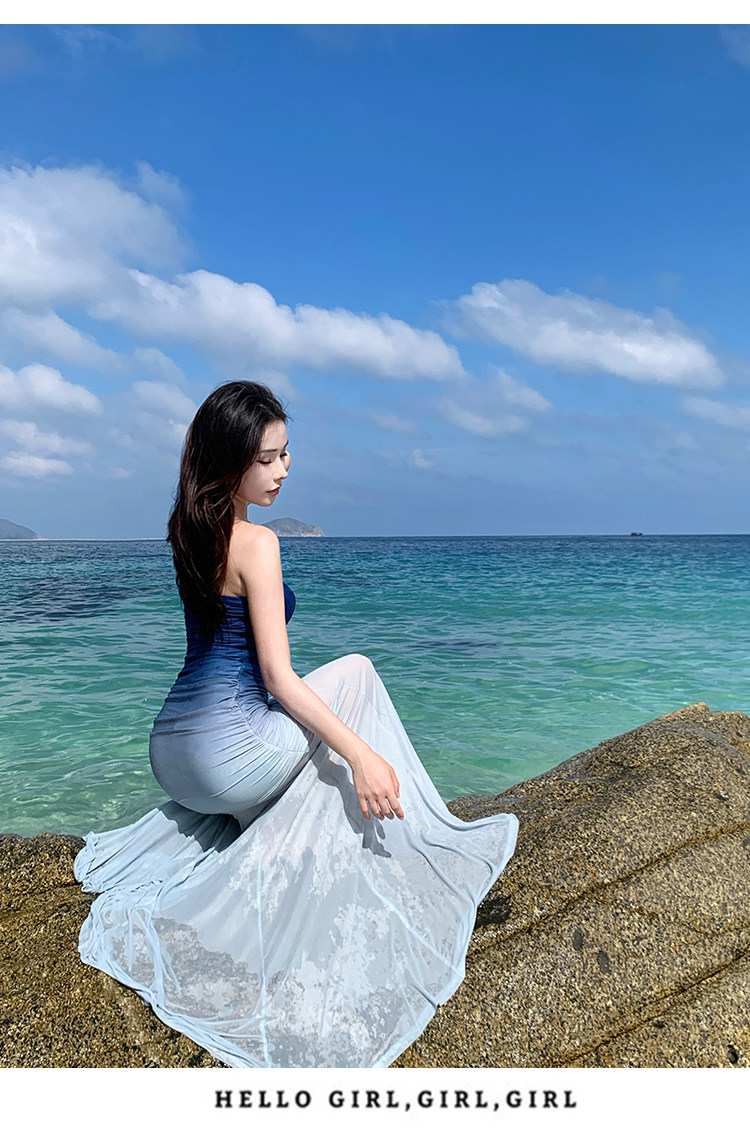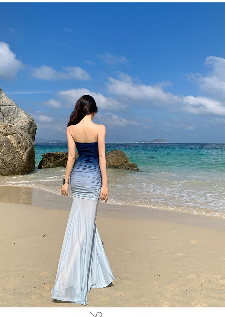 French-Style Blue Gradient Strapless Dress, Long, High-End, Waist-Cinching, Hip-Hugging Fishtail Dress, Seaside Vacation Style Long Dress