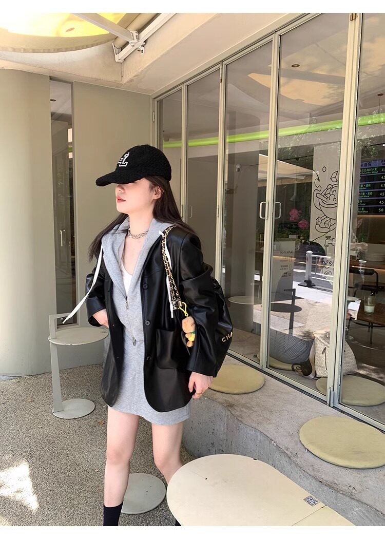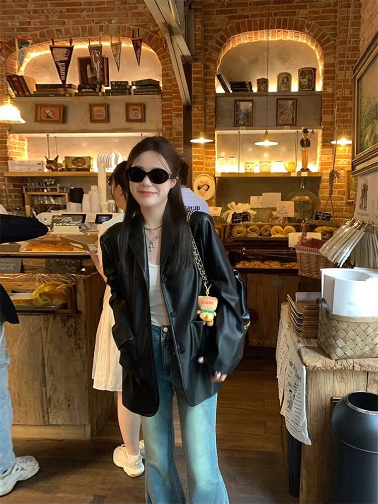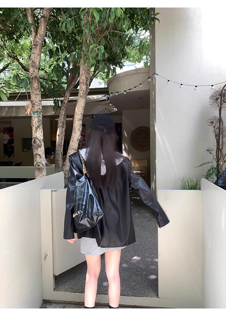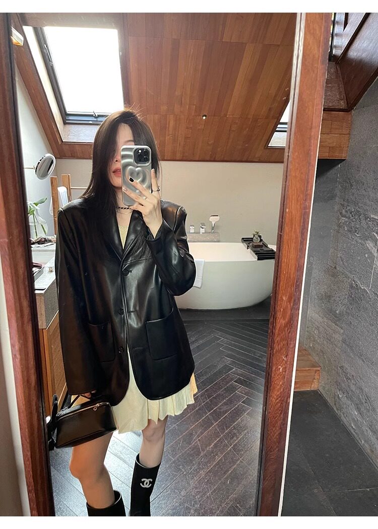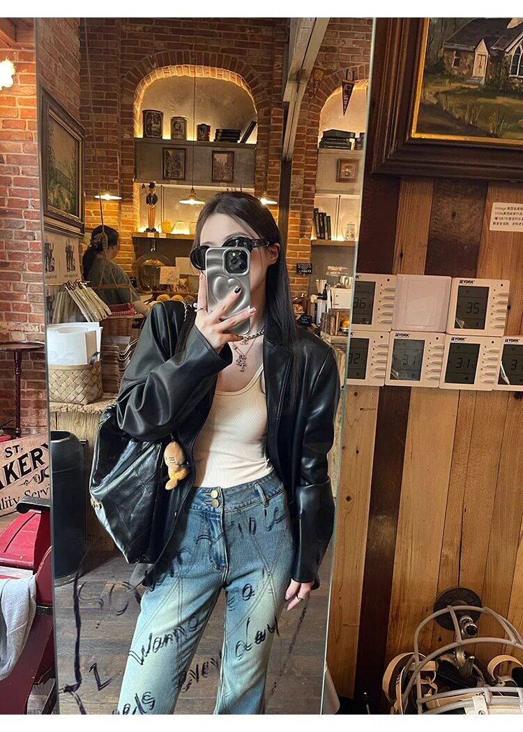 Suit Leather Jacket for Women 2026 Spring and Autumn New Style High-End Street Style Petite Retro Black Biker Leather Jacket