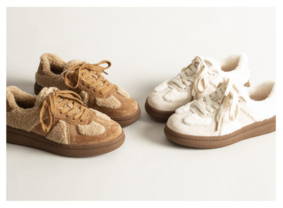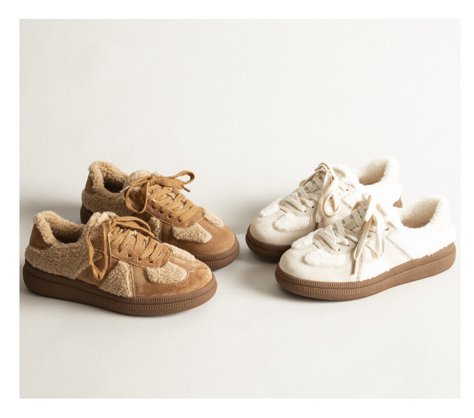 Hong Kong Genuine Leather Retro Flat Fashion German Training Shoes for Women, Autumn and Winter Versatile Lamb Wool Shoes, Warm and Plush Casual Shoes