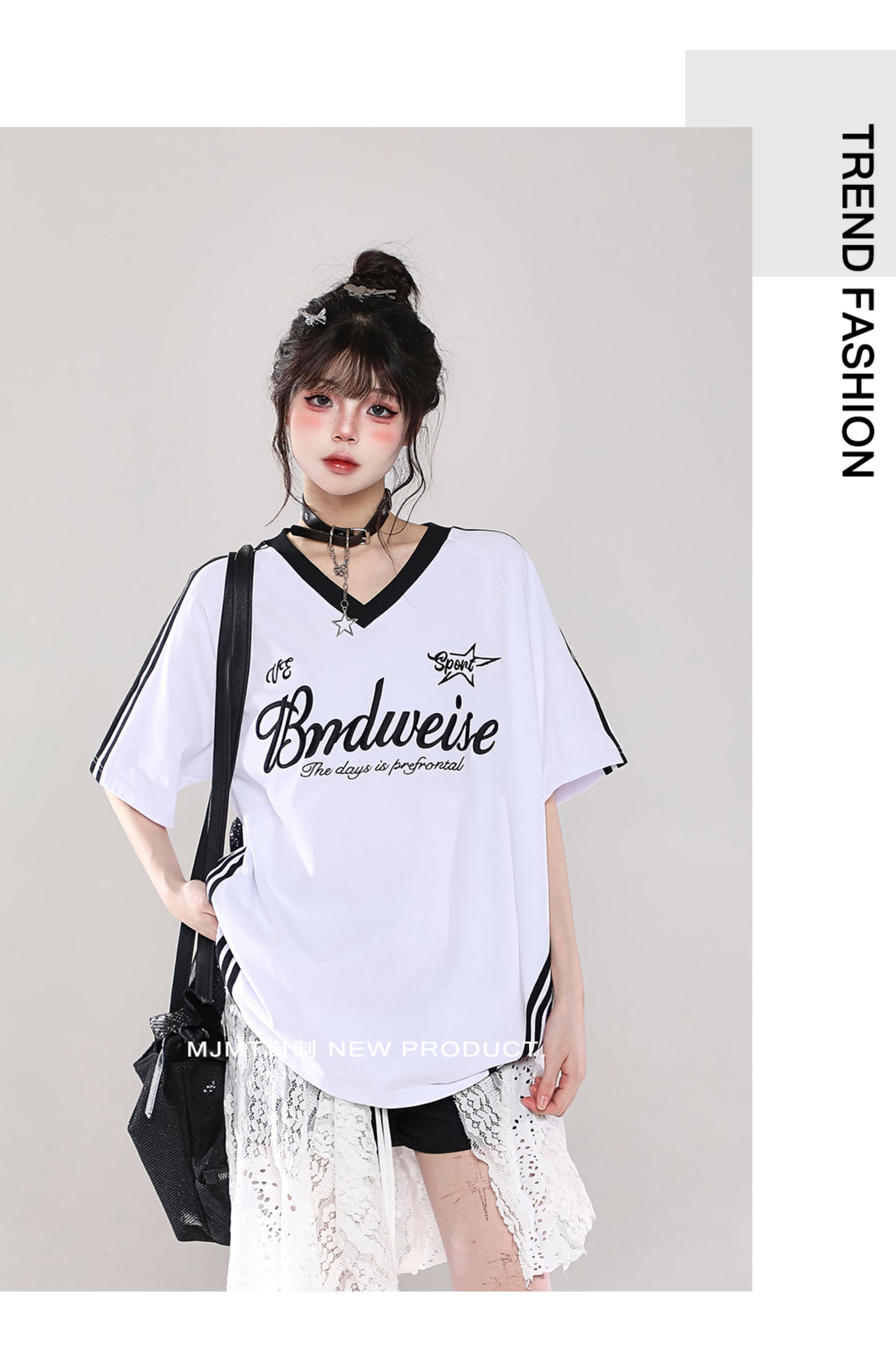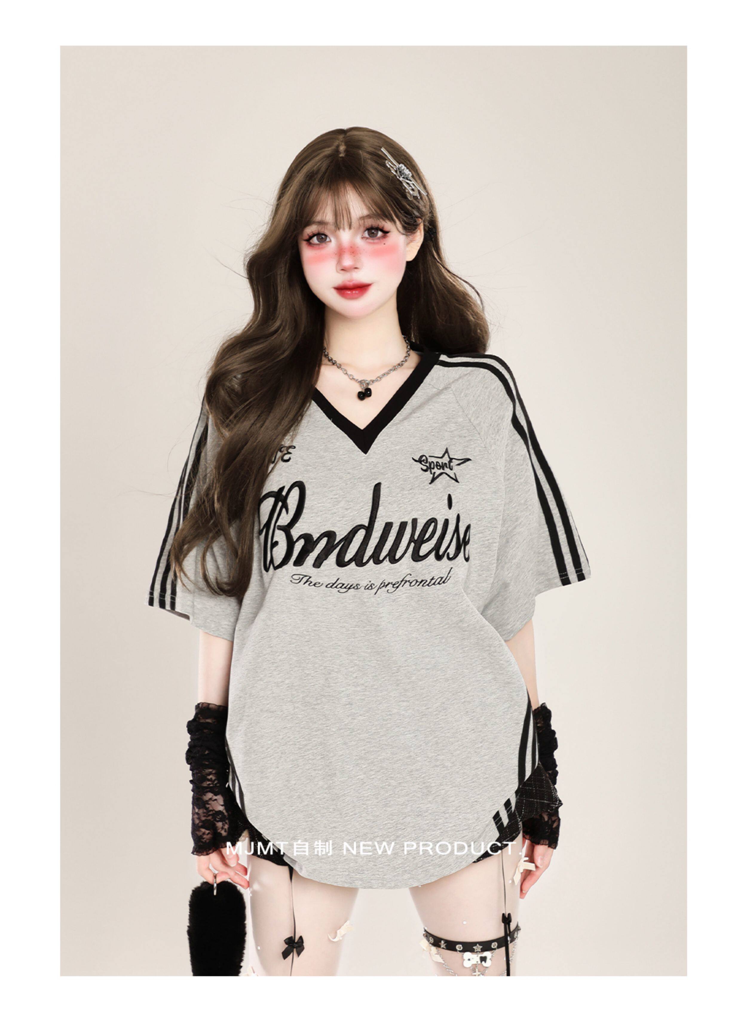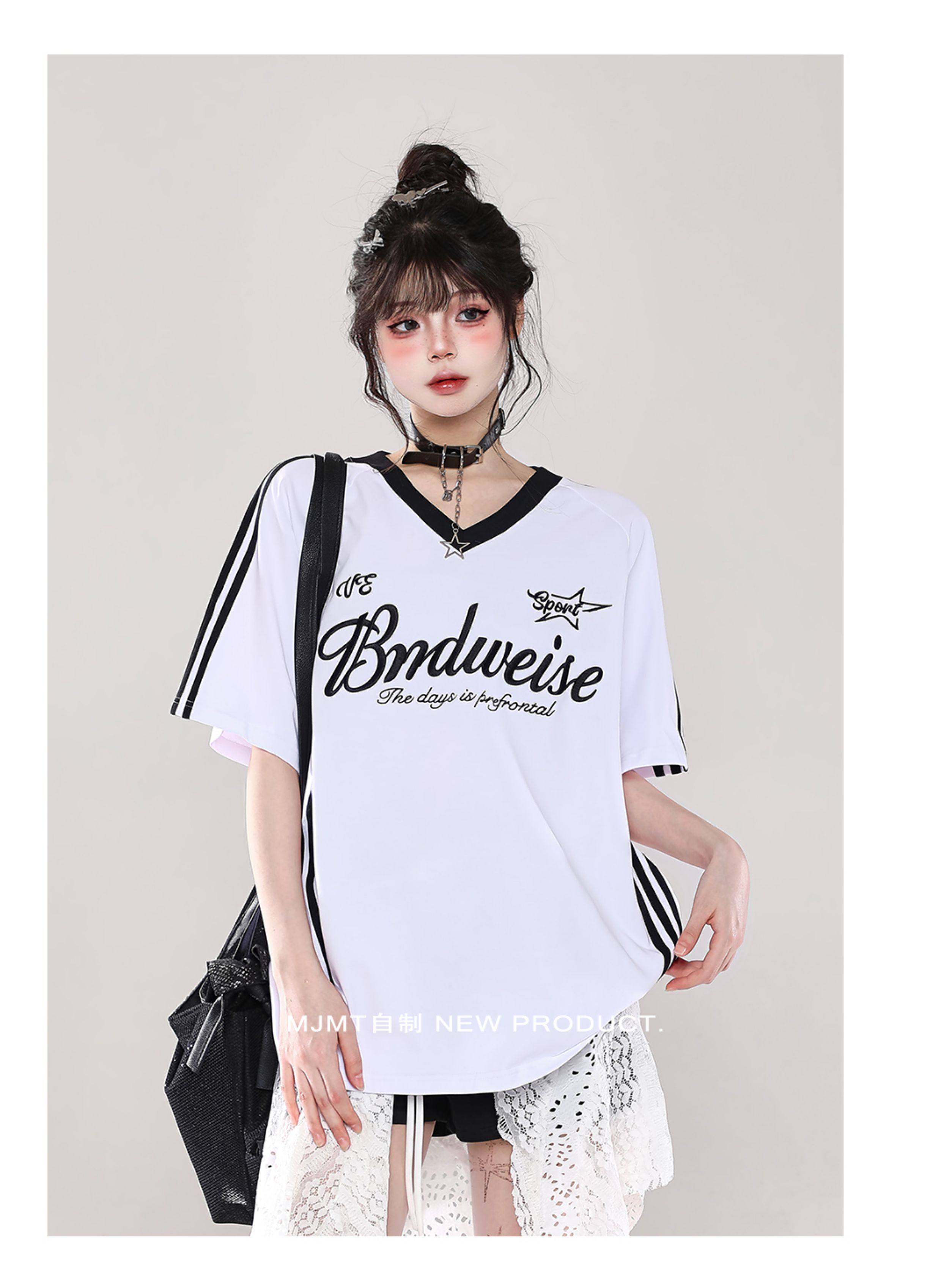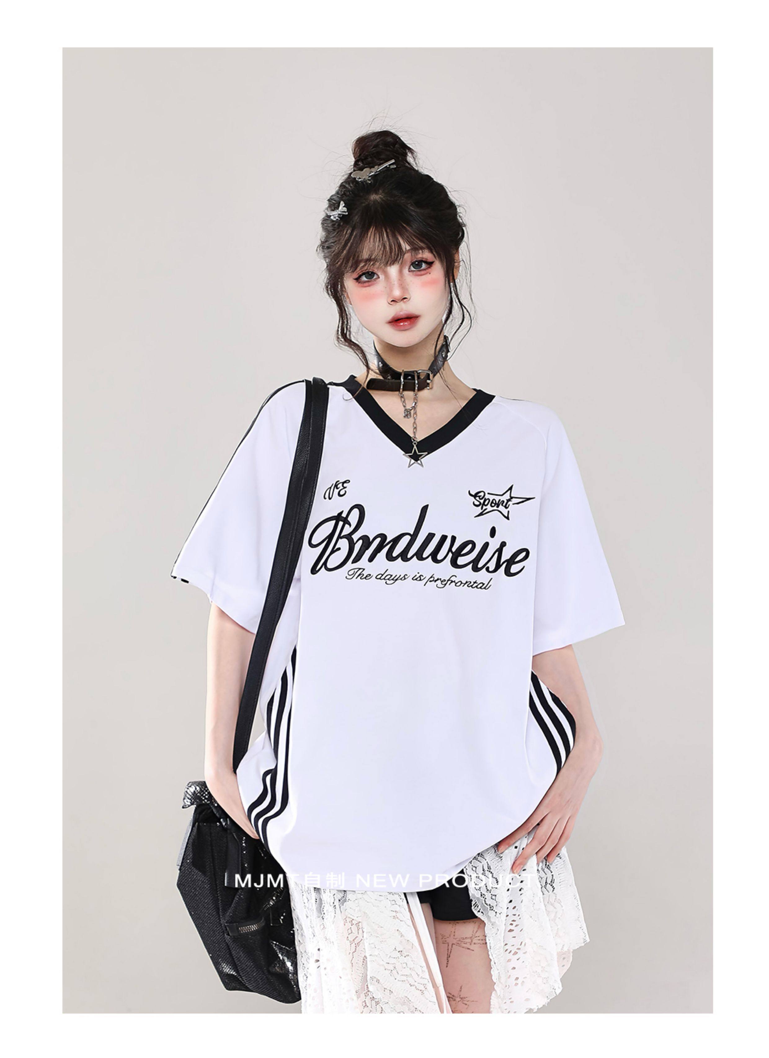 American Retro Trendy Contrasting Color Stitching V-Neck Loose Short-Sleeved T-Shirt for Women Summer Oversize Casual Half-Sleeved Top