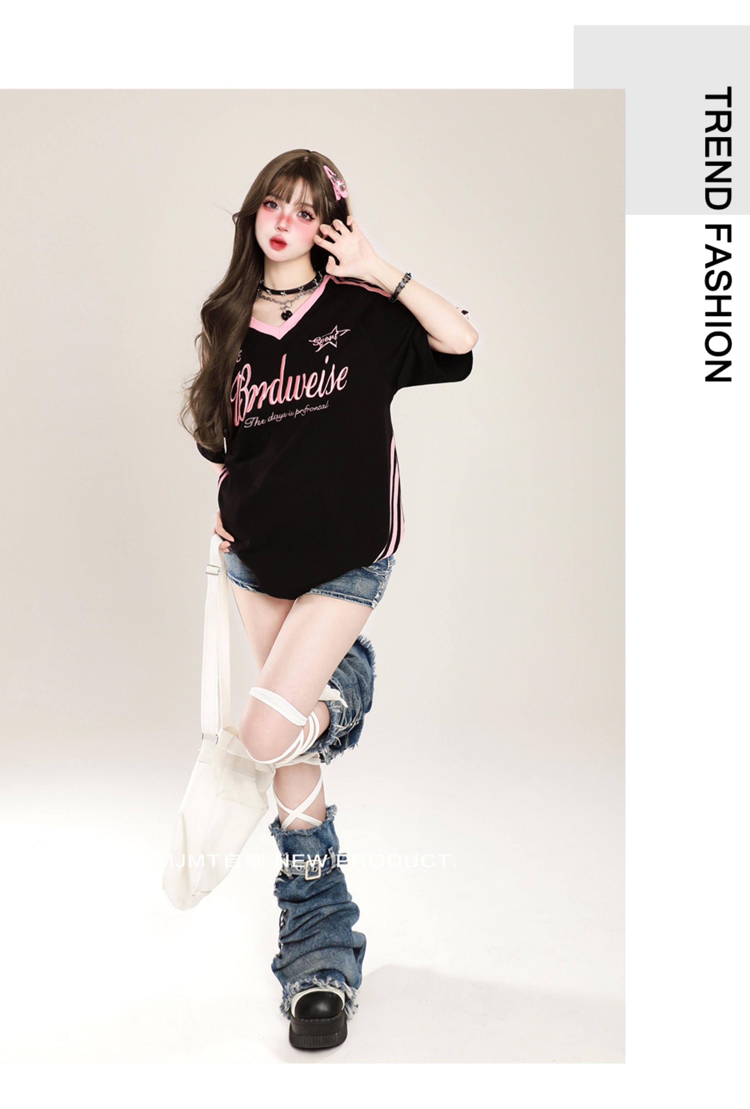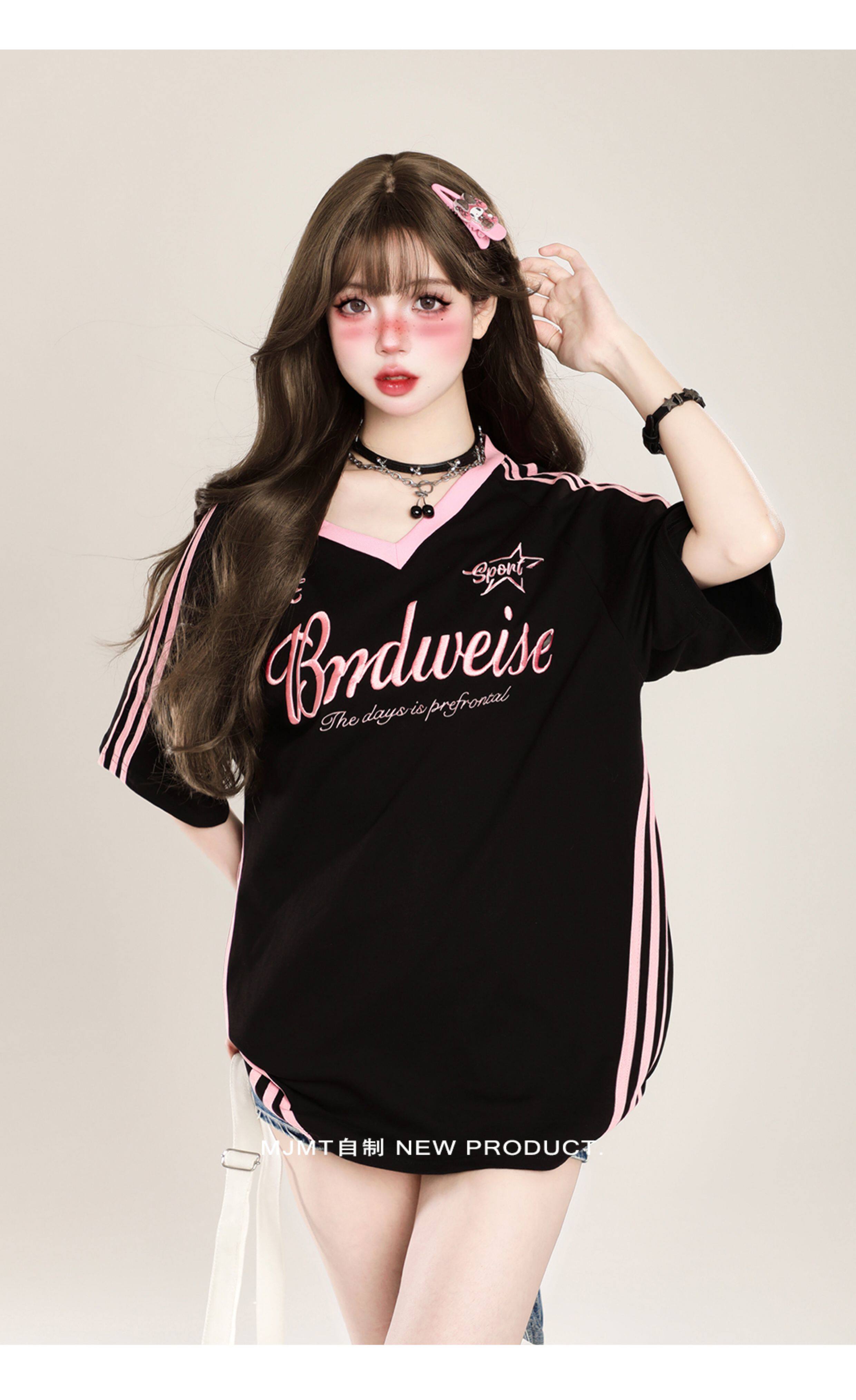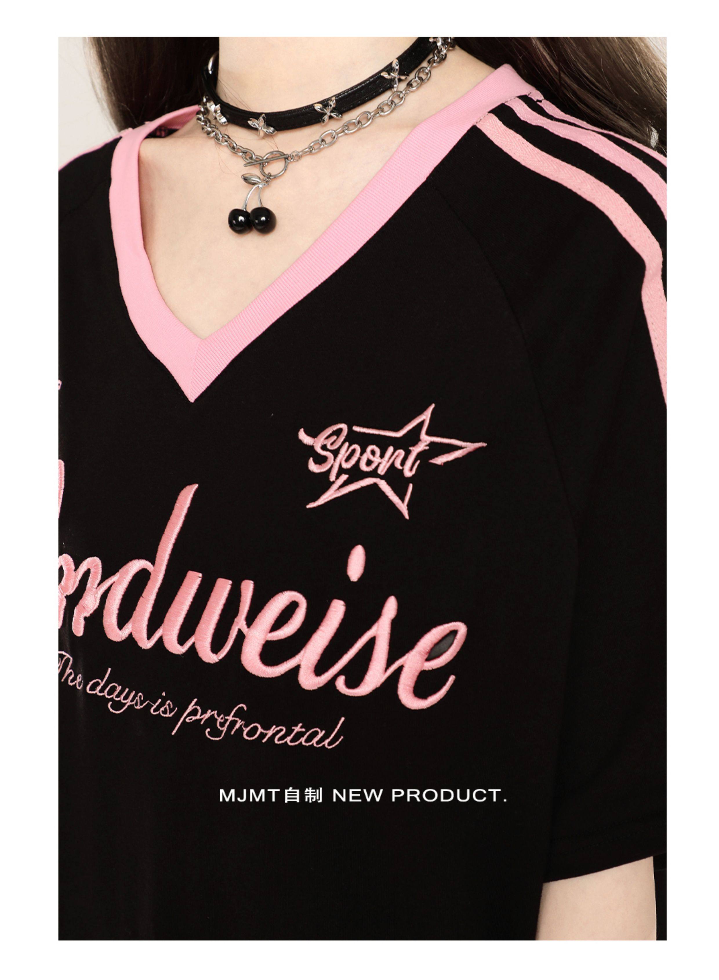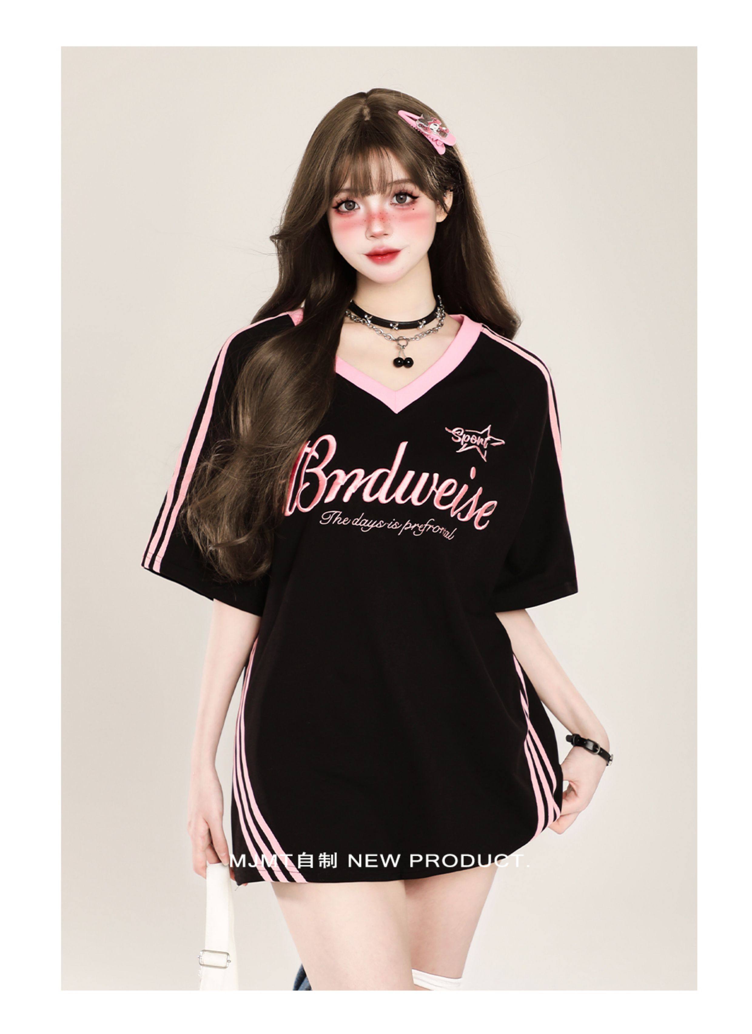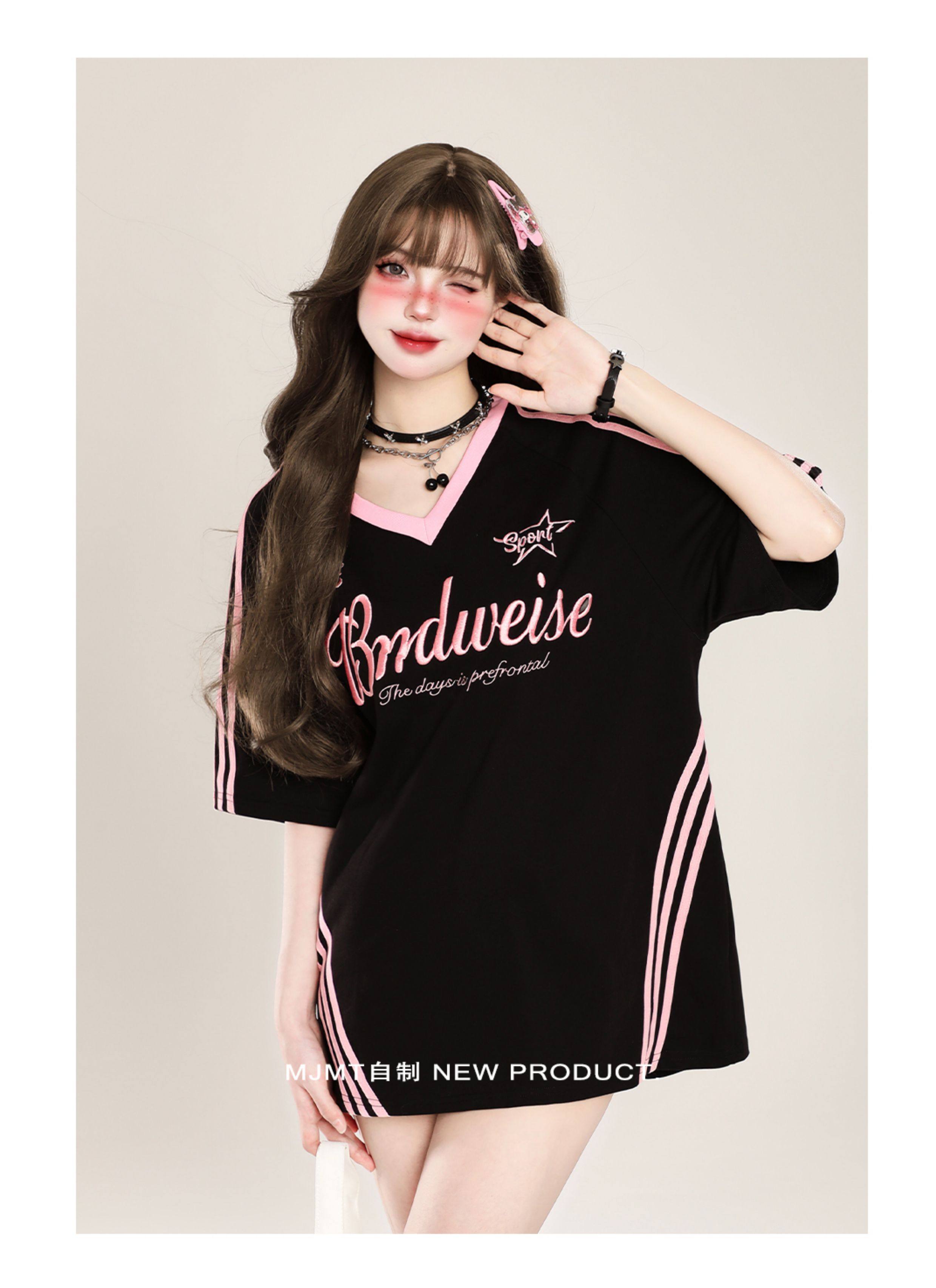 American Retro Trendy Contrasting Color Stitching V-Neck Loose Short-Sleeved T-Shirt for Women Summer Oversize Casual Half-Sleeved Top