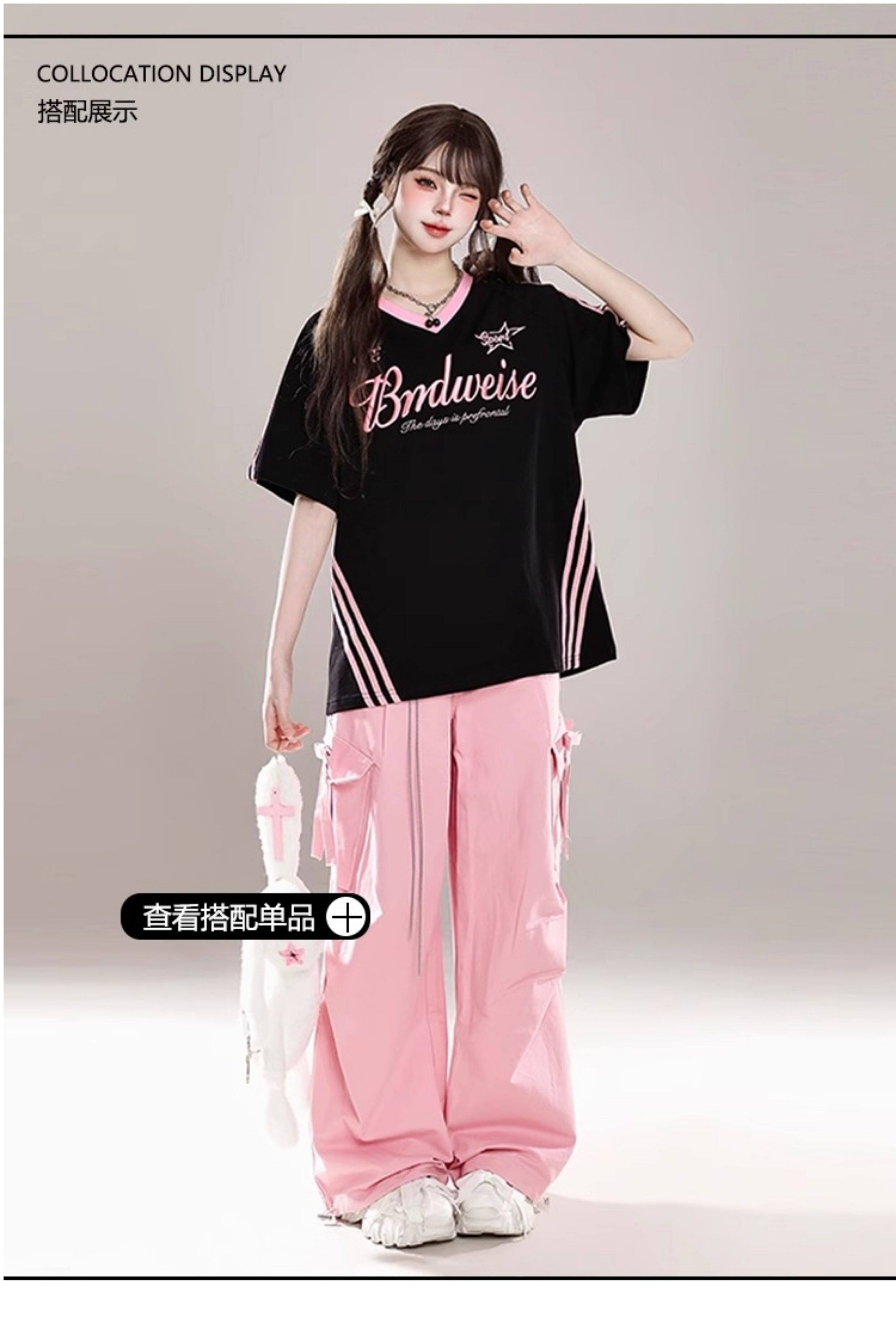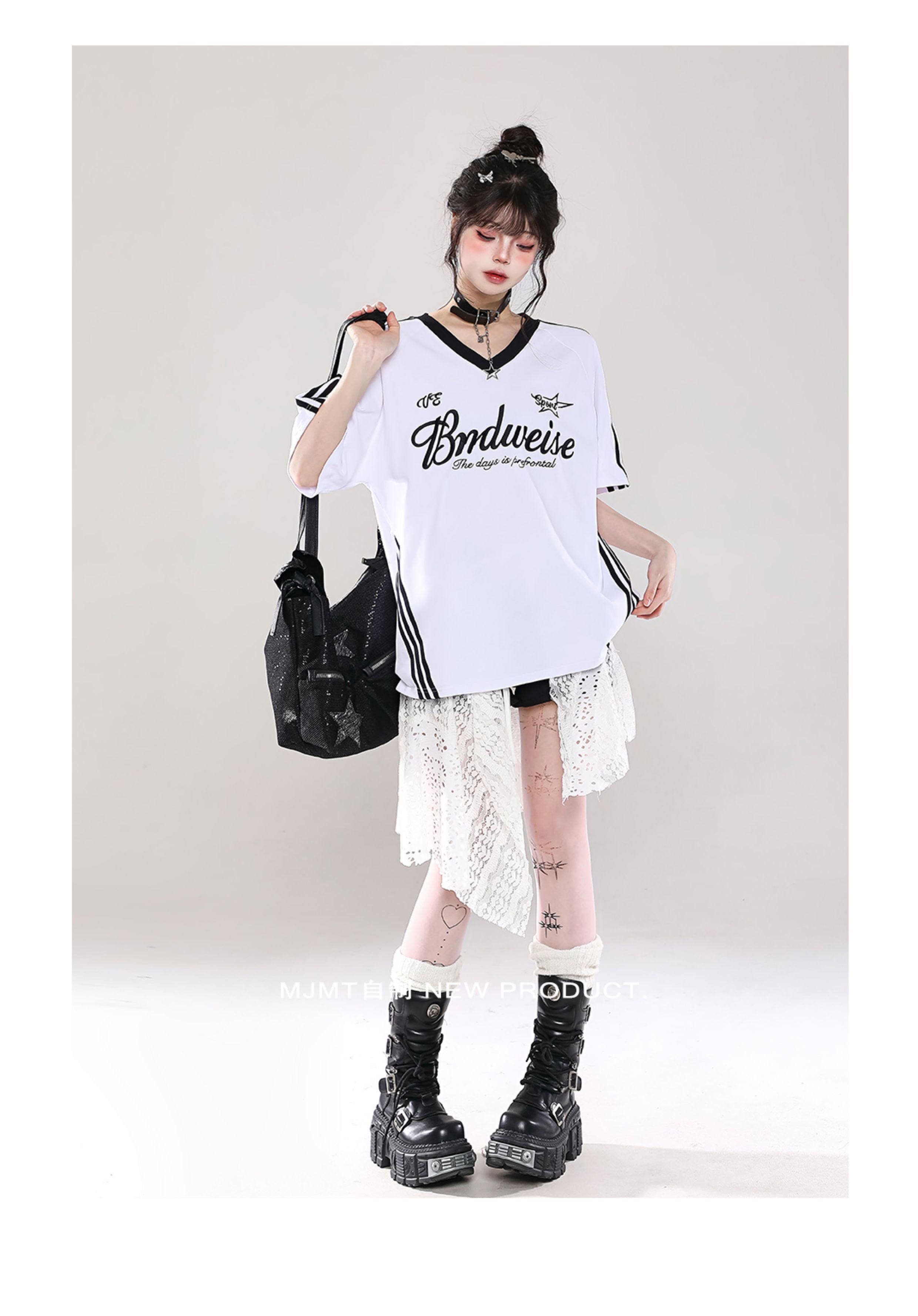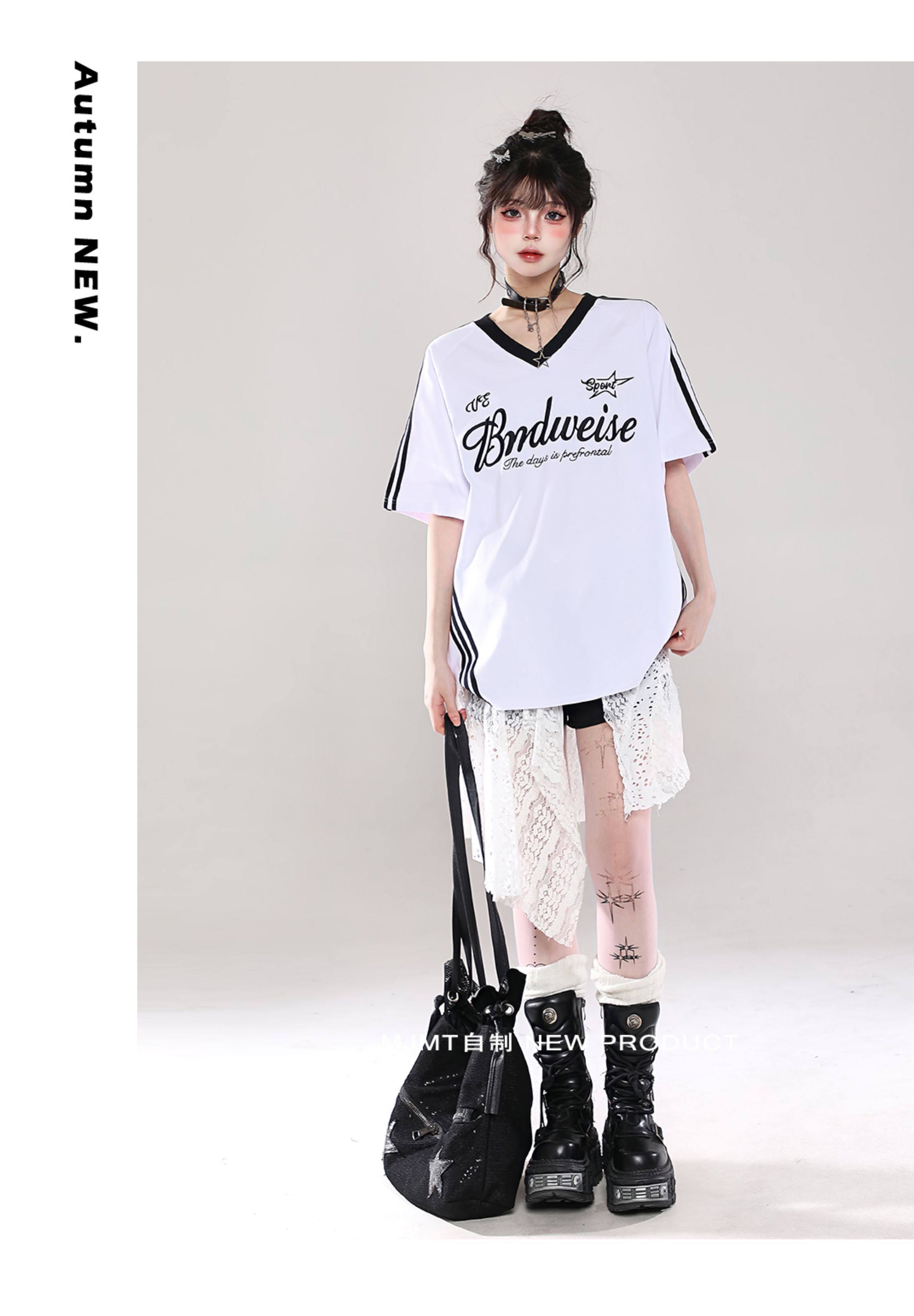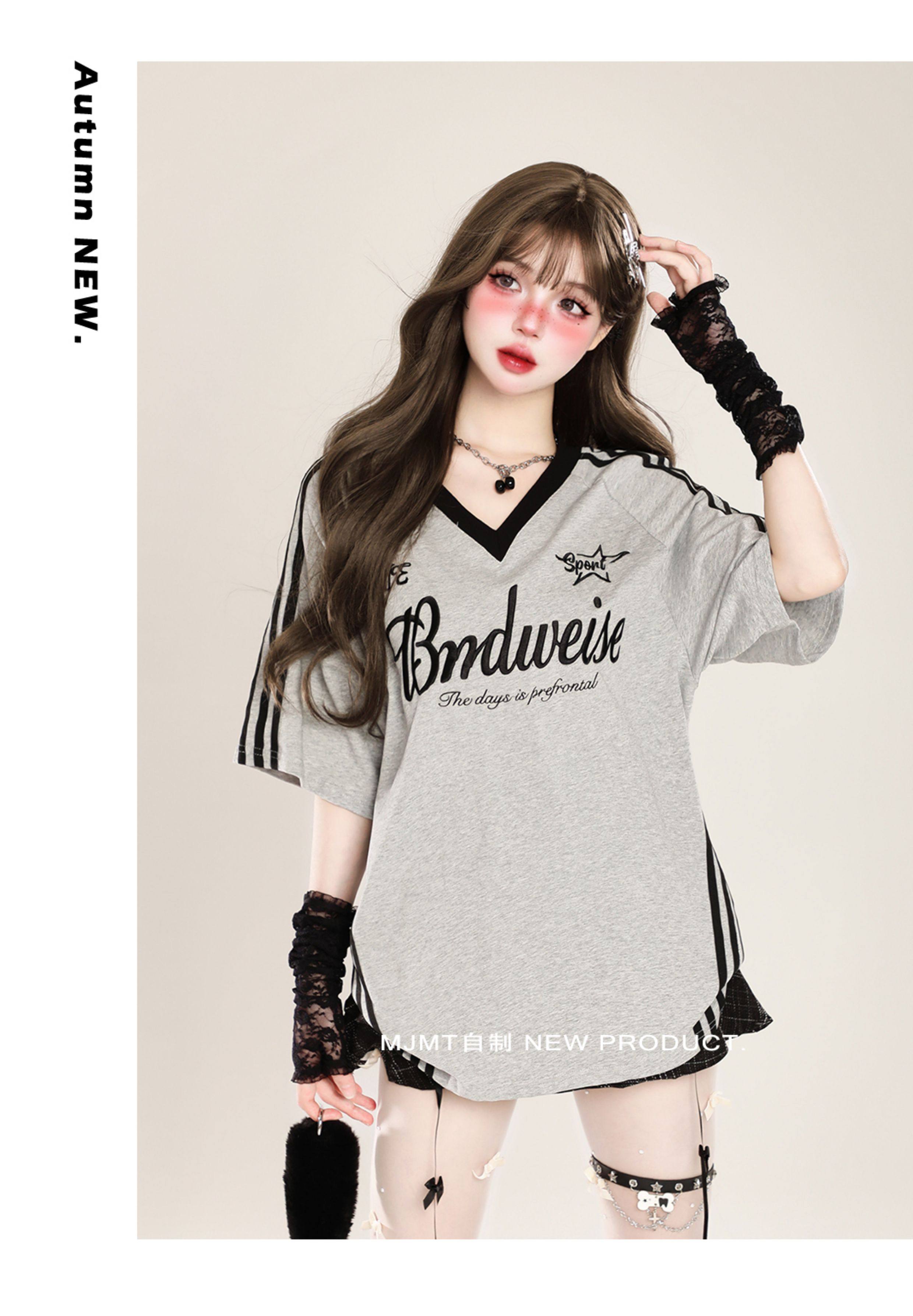 American Retro Trendy Contrasting Color Stitching V-Neck Loose Short-Sleeved T-Shirt for Women Summer Oversize Casual Half-Sleeved Top